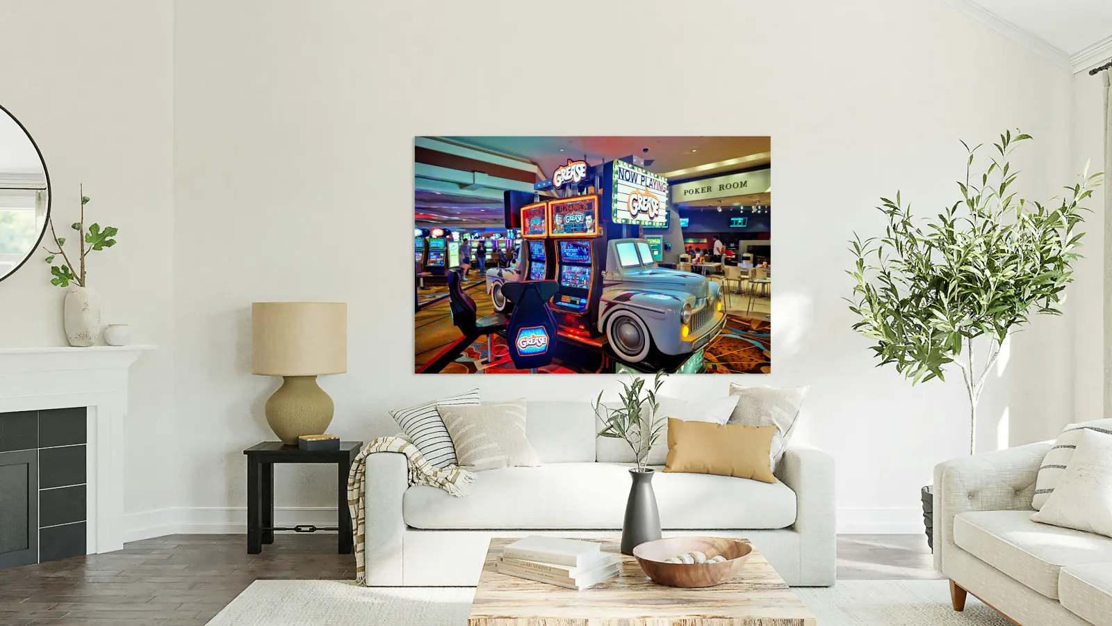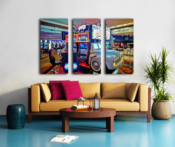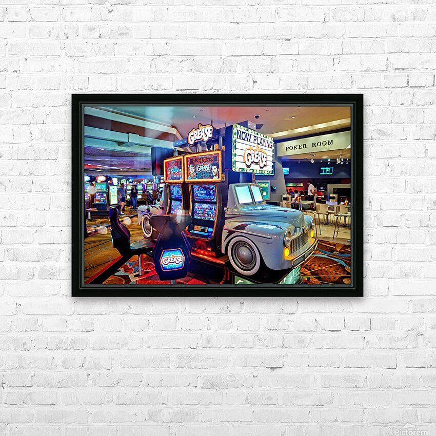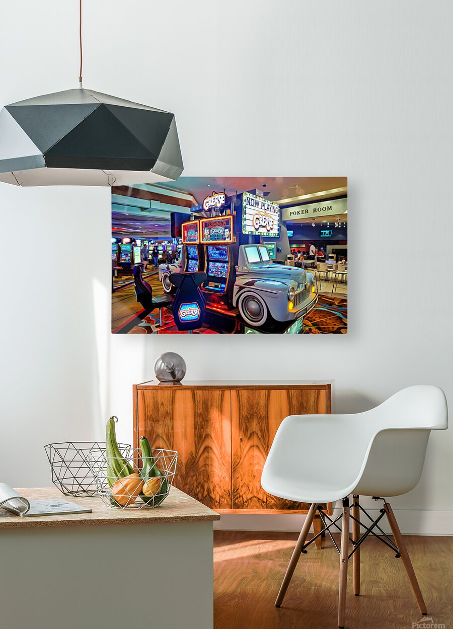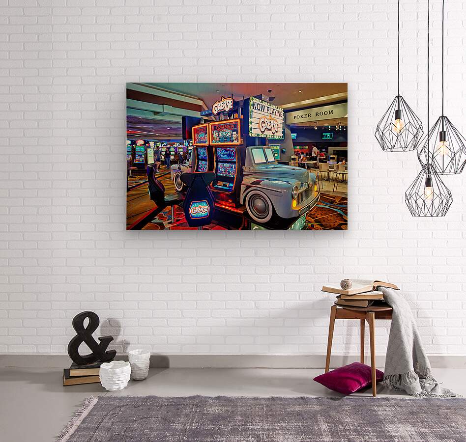 Visitors are playing the Grease slot machine at Treasure Island Casino in Las Vegas. The casino is lively with various games around.