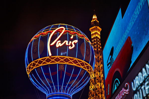 Bright lights shine on the Las Vegas Strip at night with a large Paris balloon and the Eiffel Tower in view. Crowds enjoy the lively atmosphere.