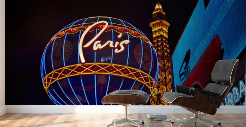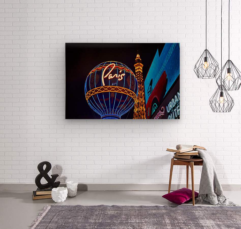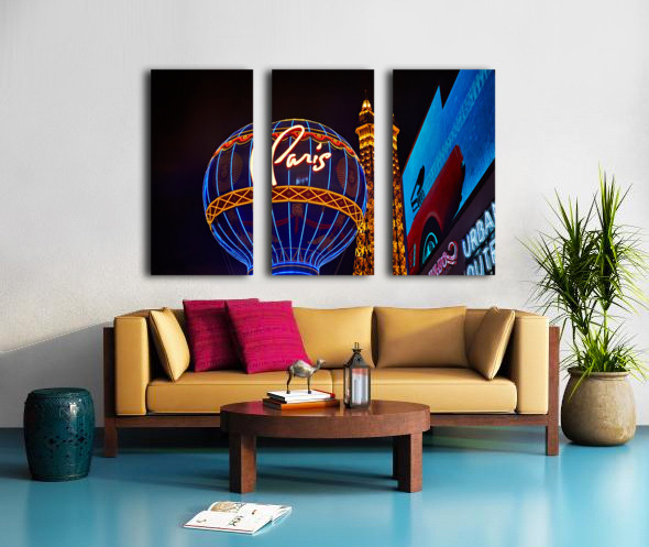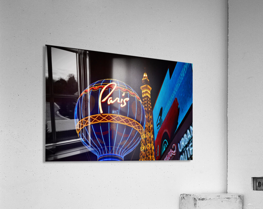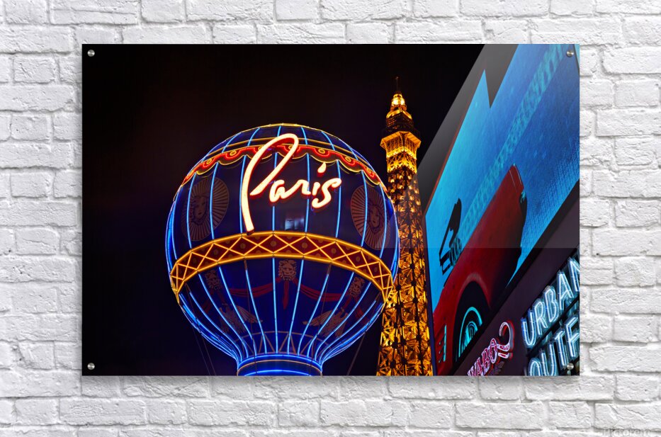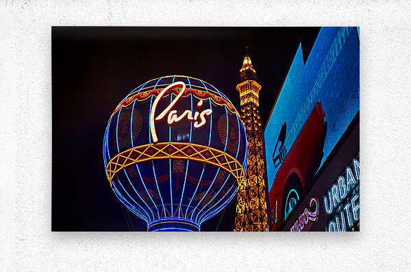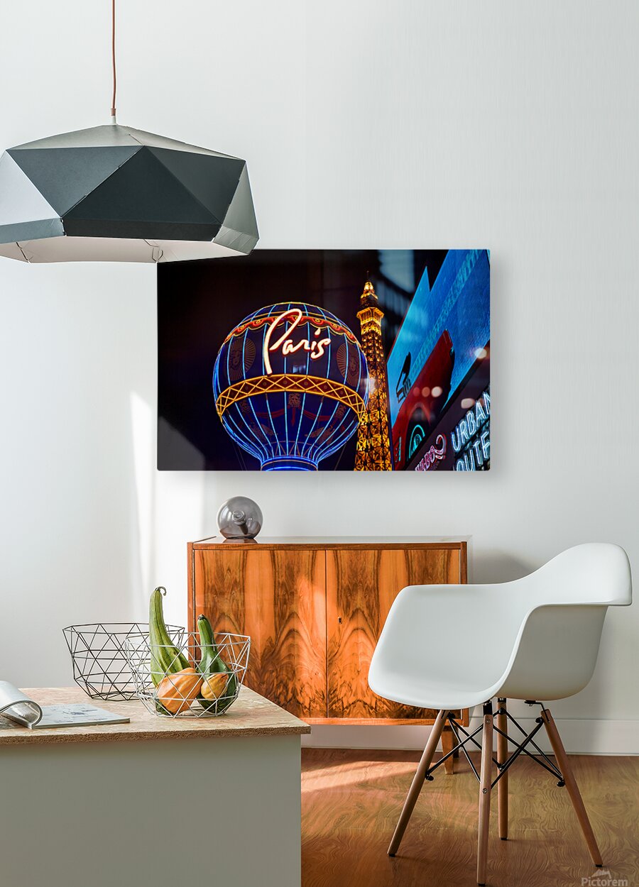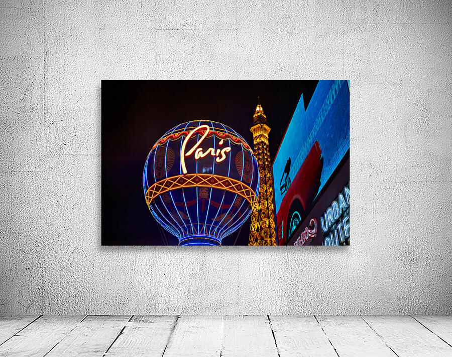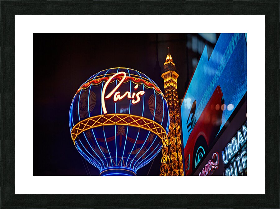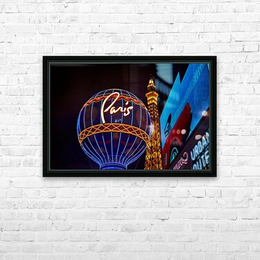 "Las Vegas Strip at night with Paris balloon and Eiffel Tower" in a framed print.