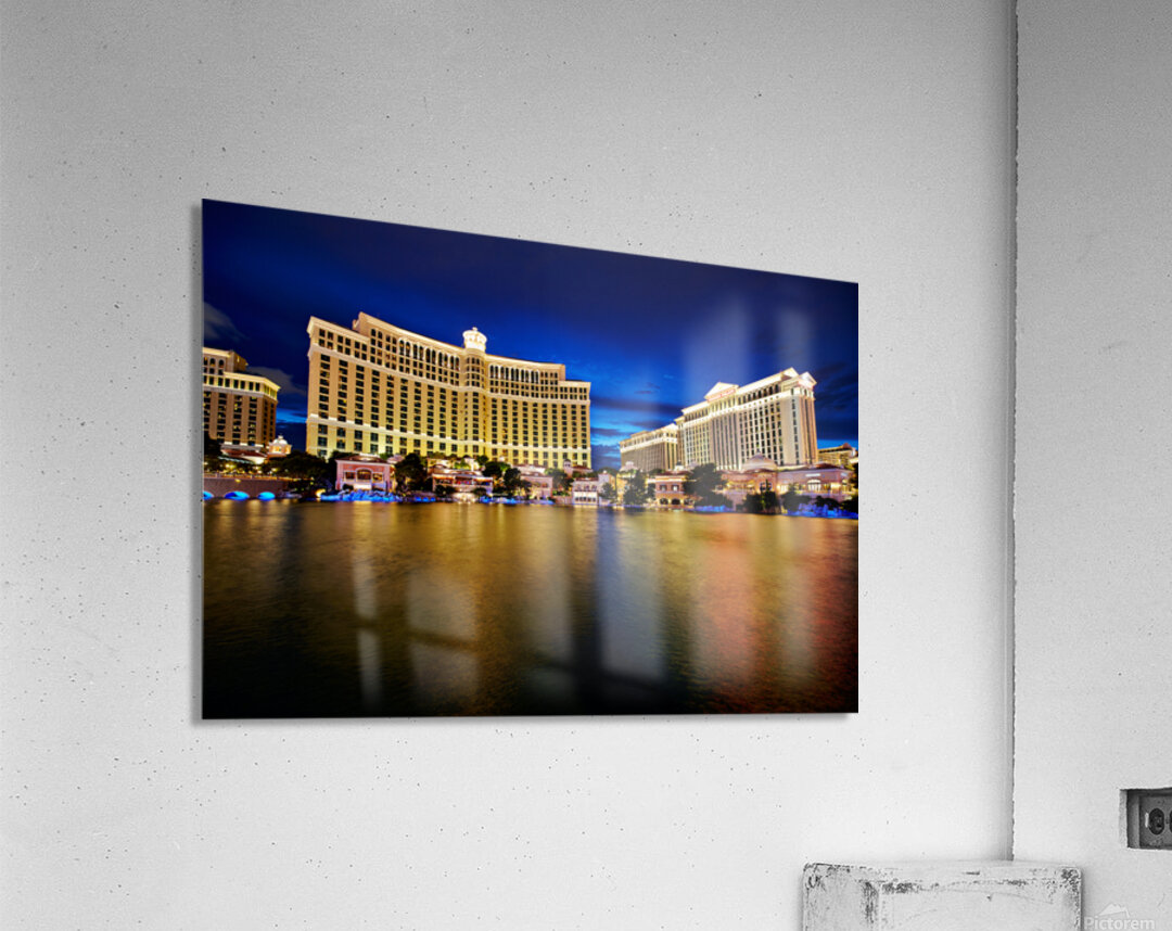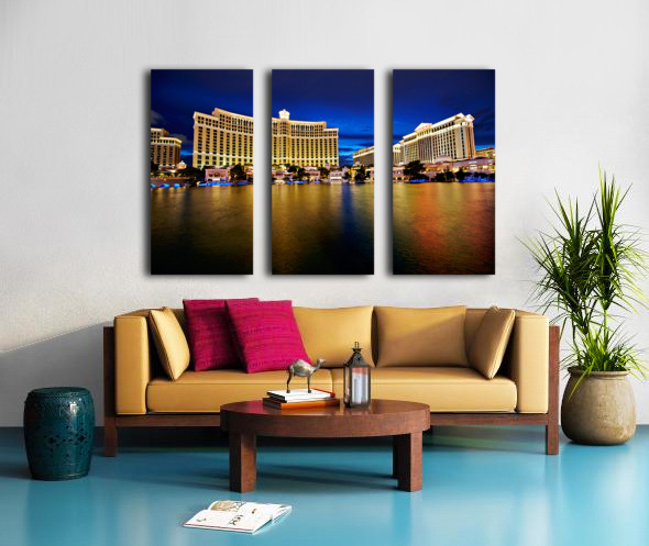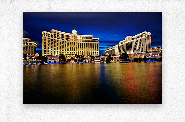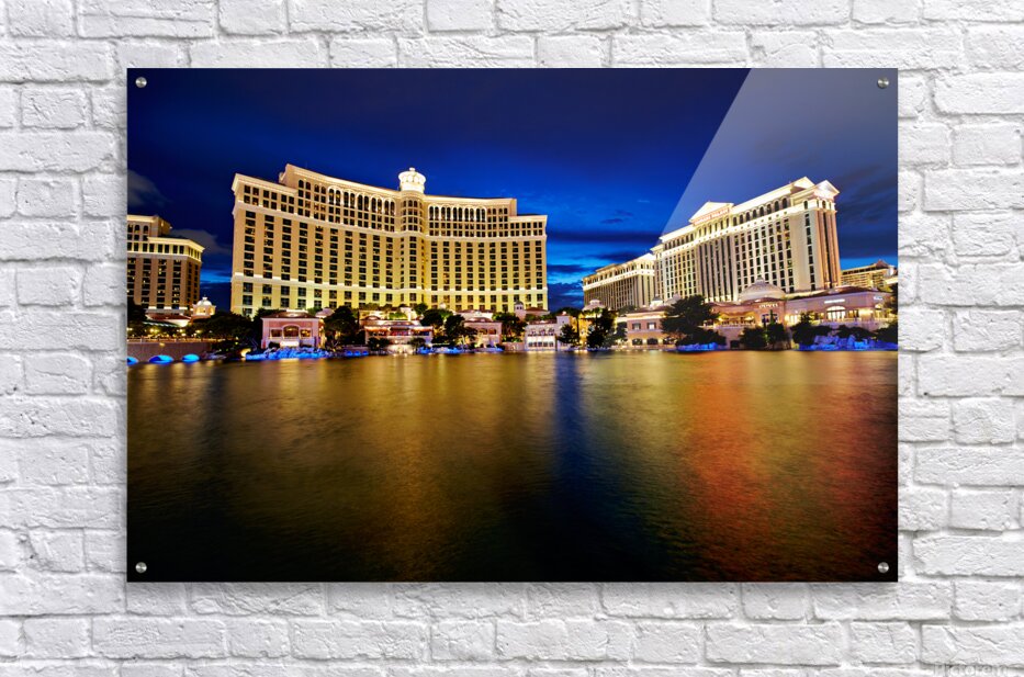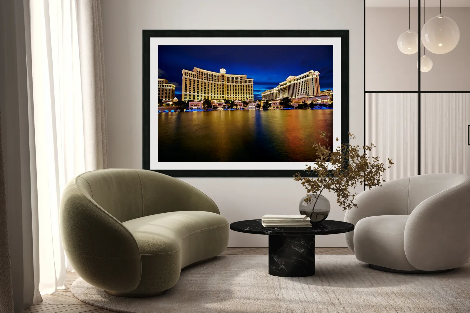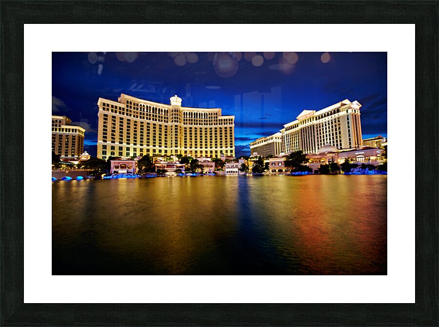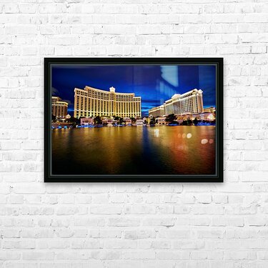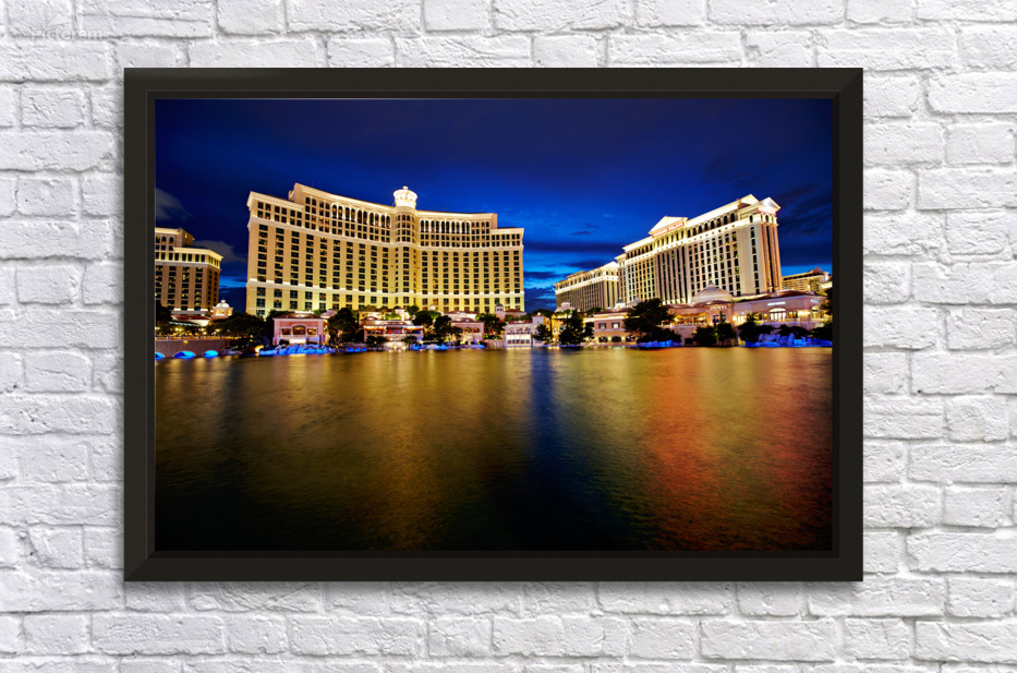 "Fountains show at Bellagio and Caesars Palace in Las Vegas" in a framed print.