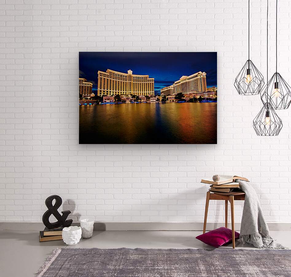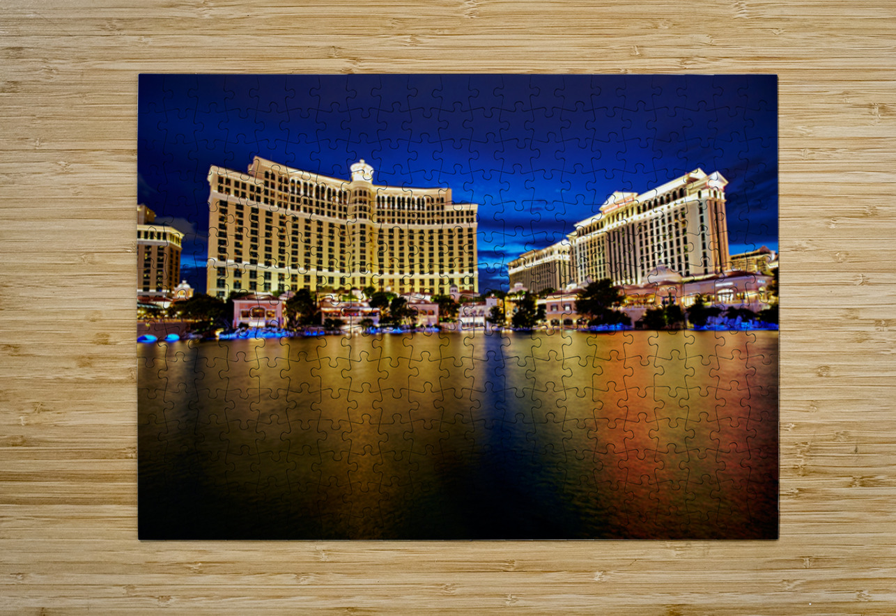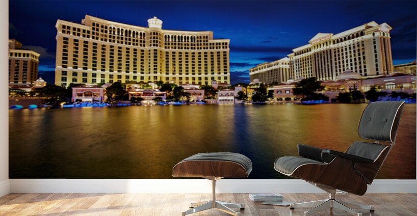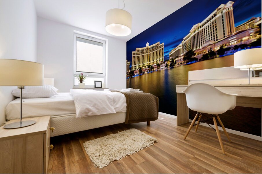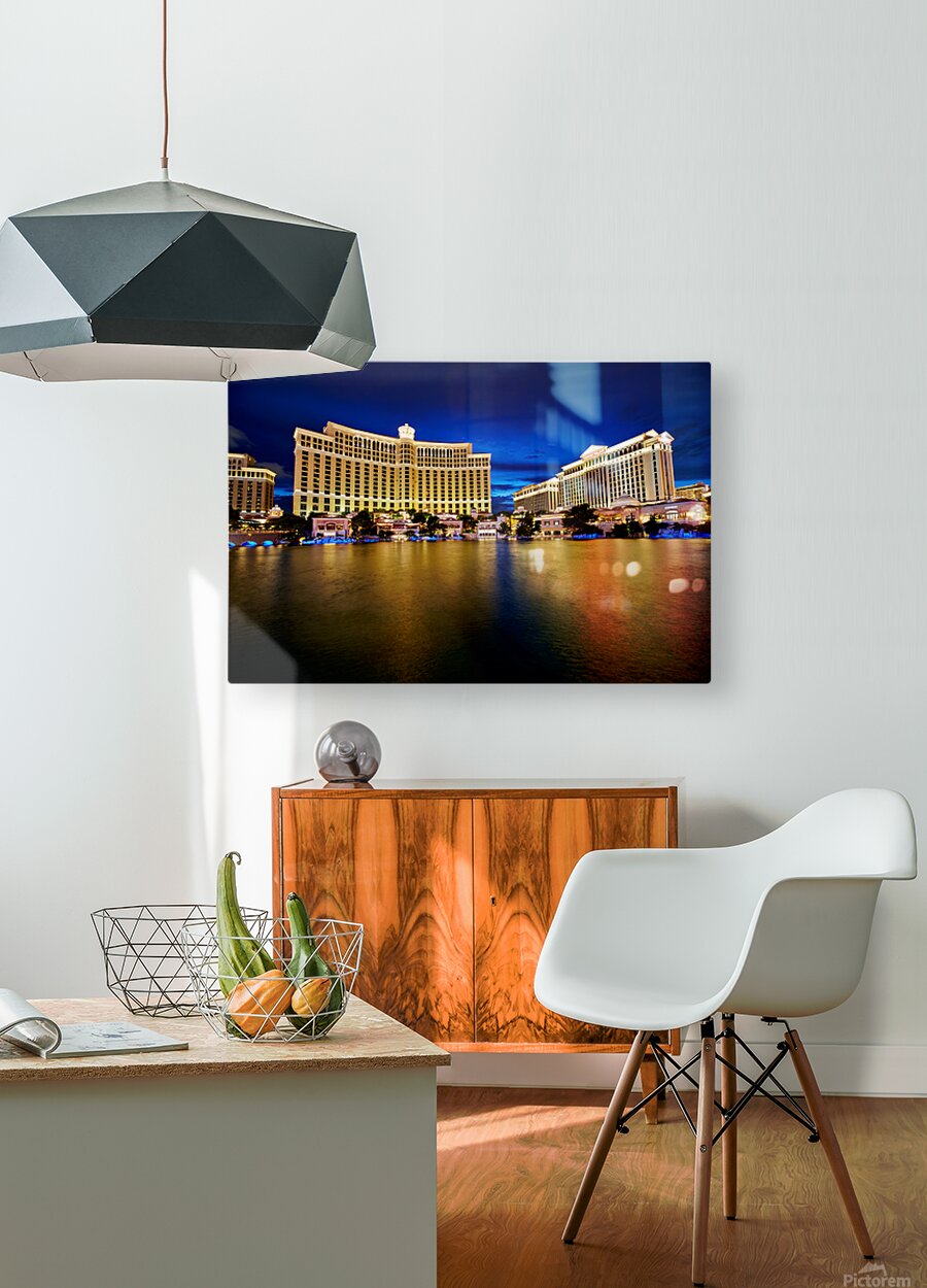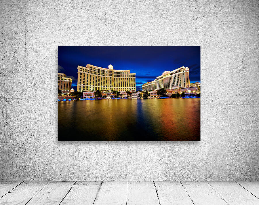 "Fountains show at Bellagio and Caesars Palace in Las Vegas" in a framed print.