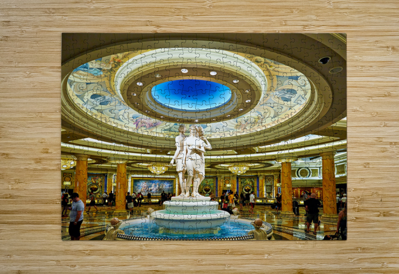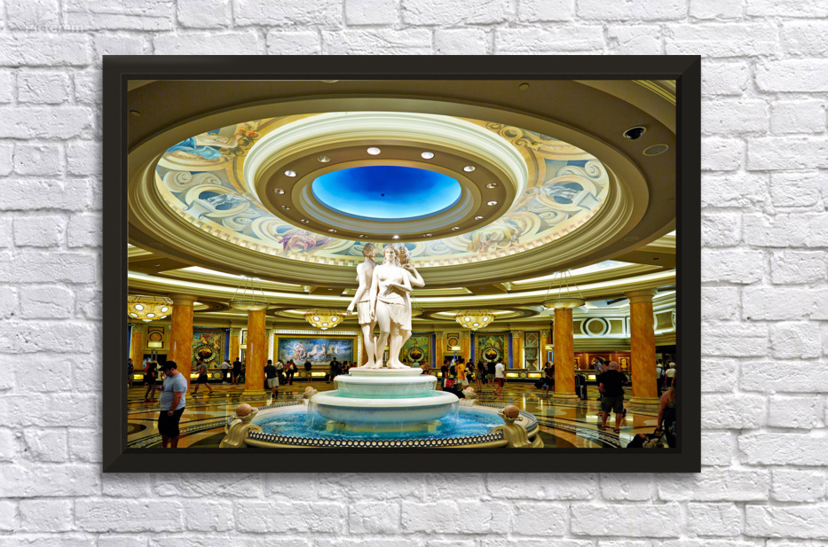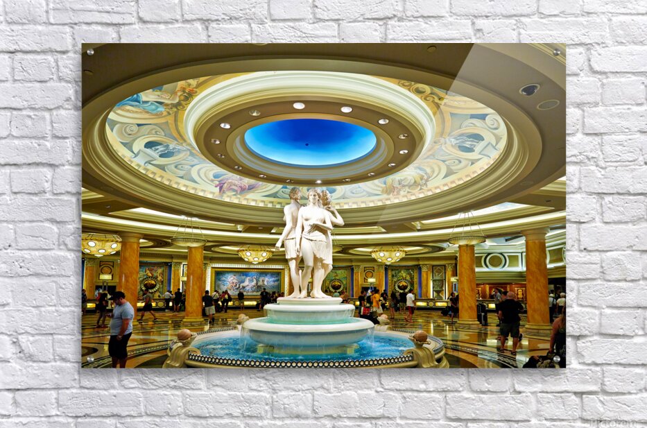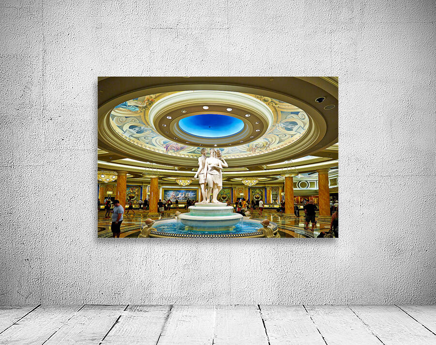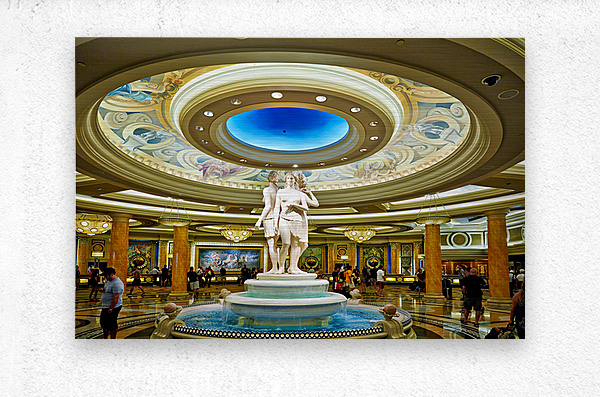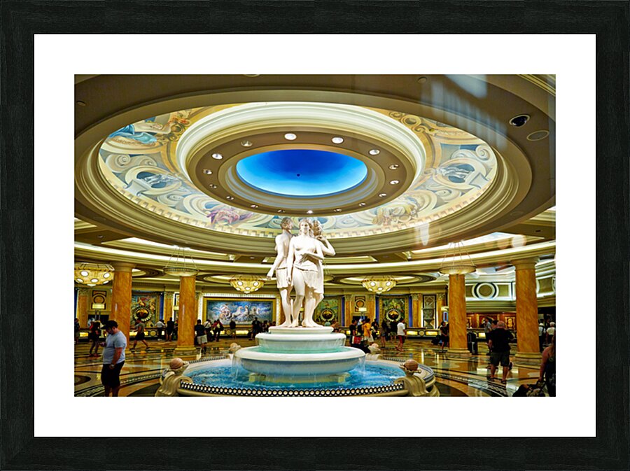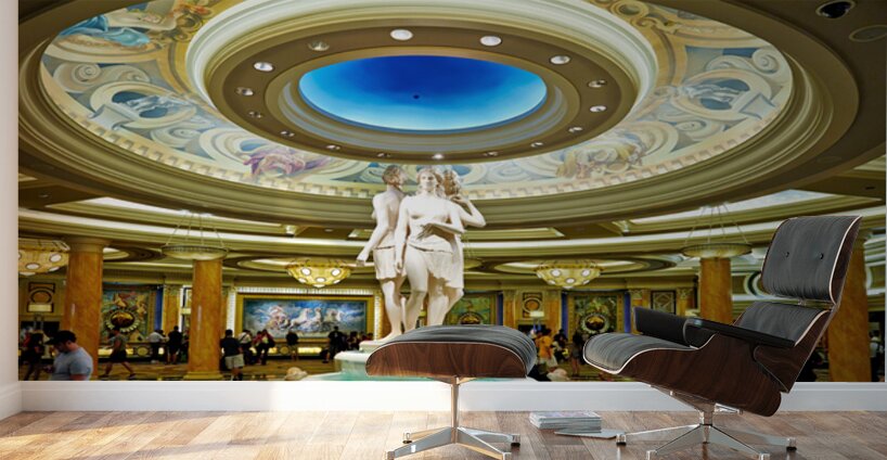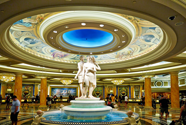 Visitors gather in the lobby of Caesars Palace Hotel in Las Vegas admiring the grand design and central statue during a busy day.