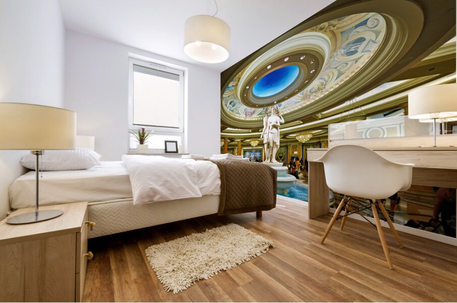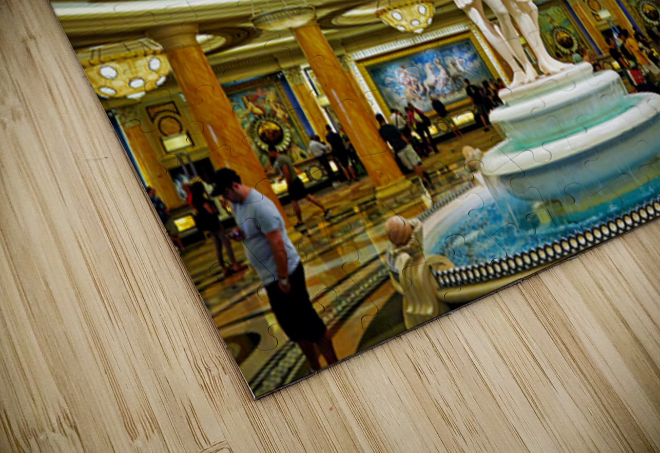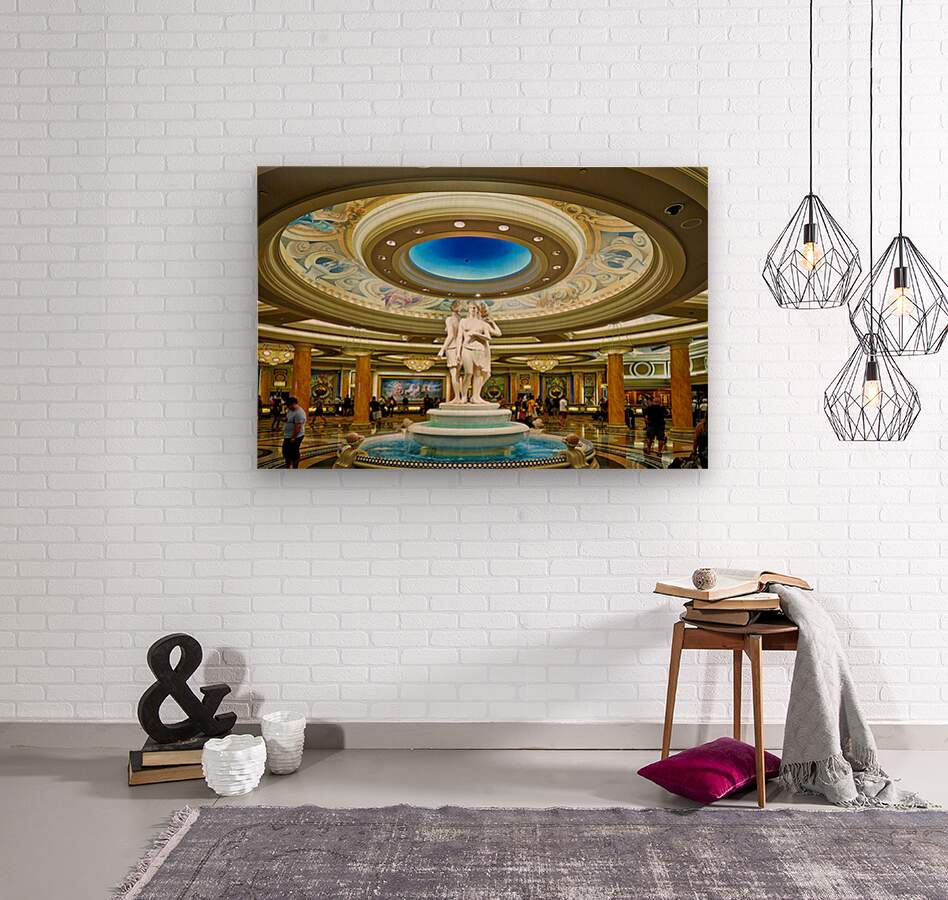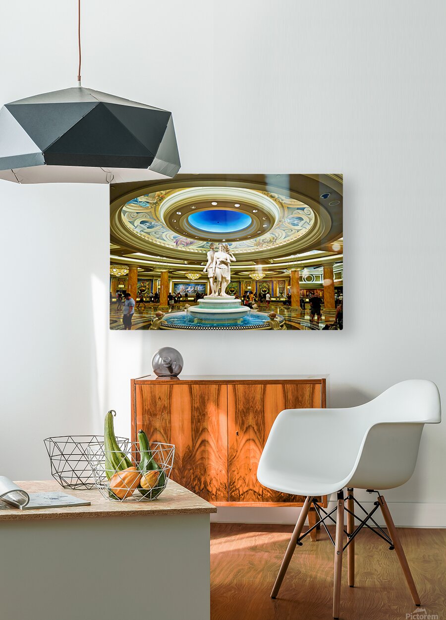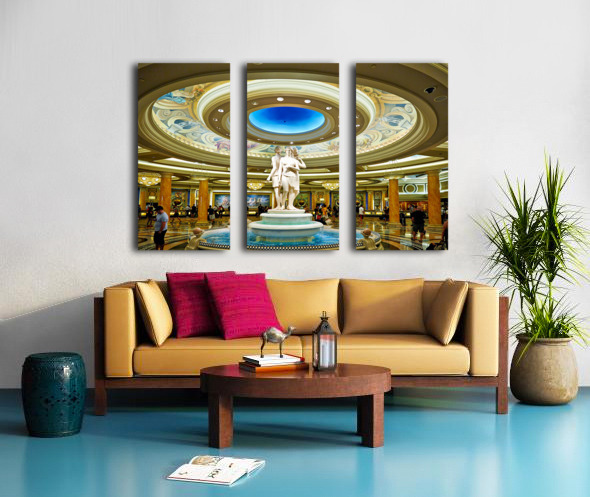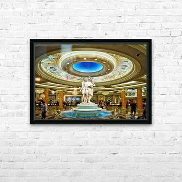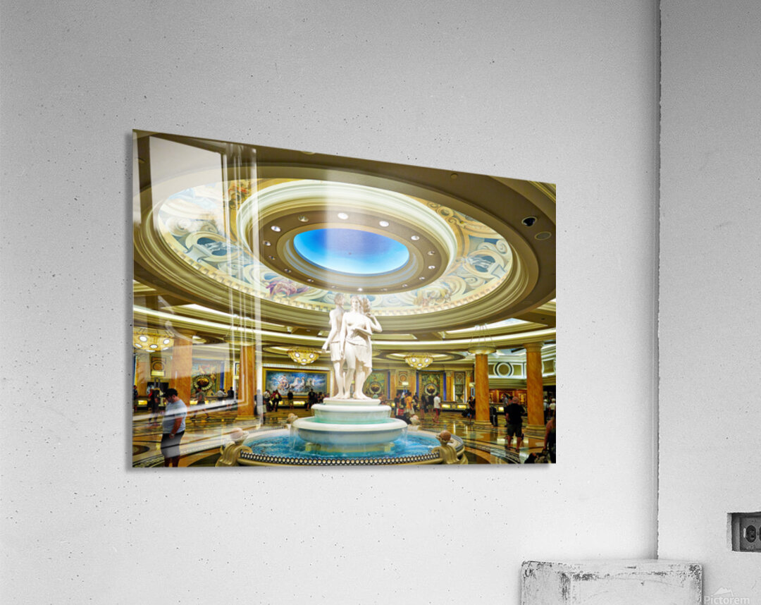 Visitors gather in the lobby of Caesars Palace Hotel in Las Vegas admiring the grand design and central statue during a busy day.
