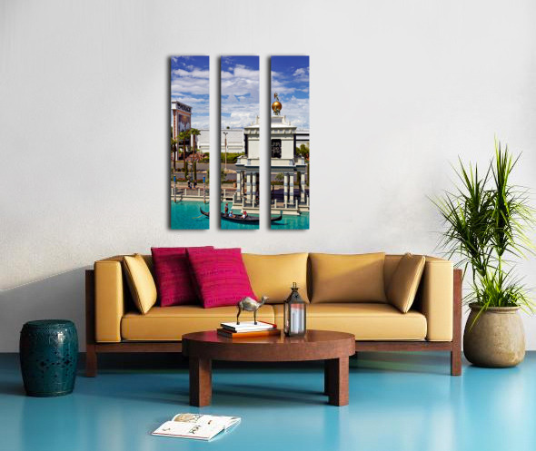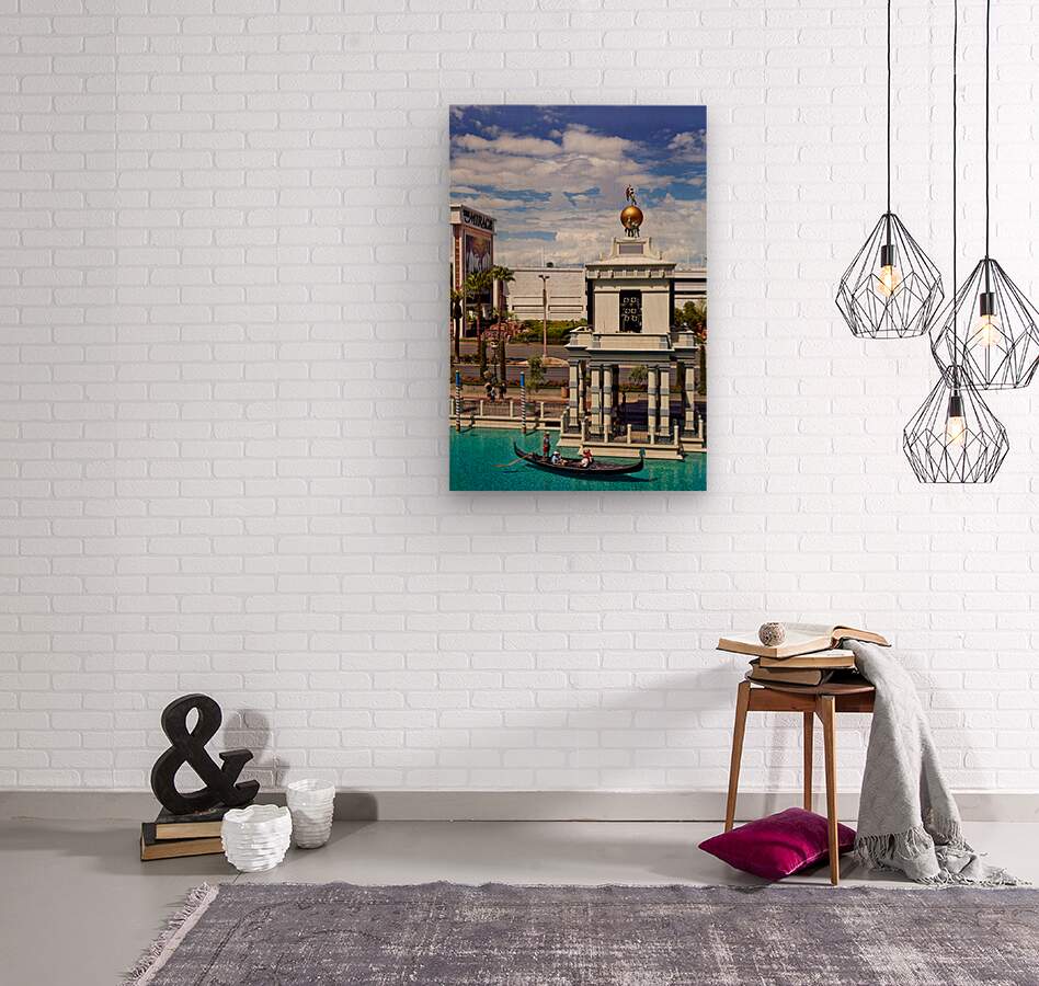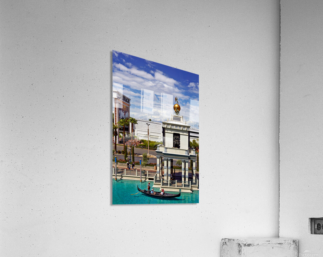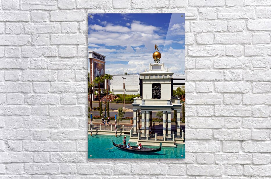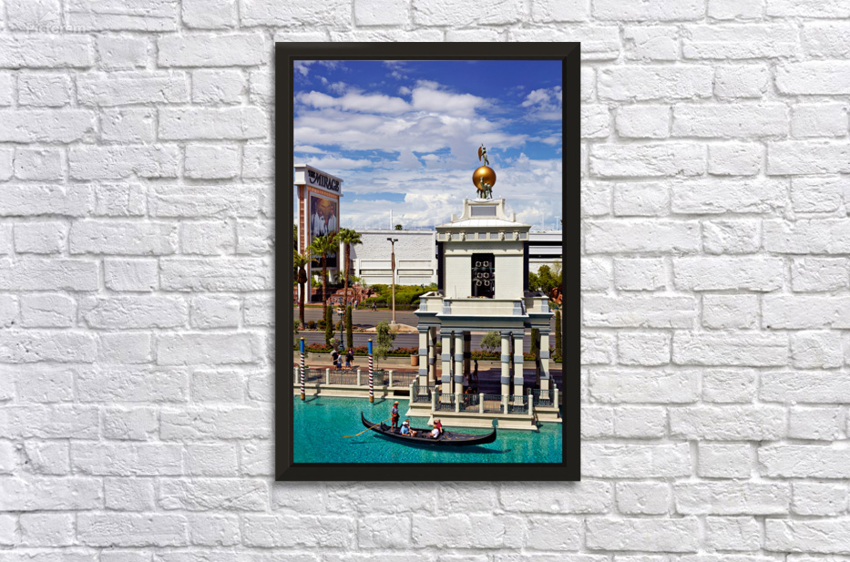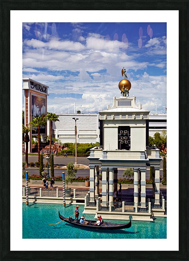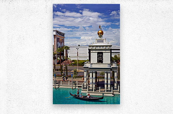 Gondolas move through the blue water at the Venetian Hotel in Las Vegas. Visitors enjoy rides under a bright sky with clouds.
