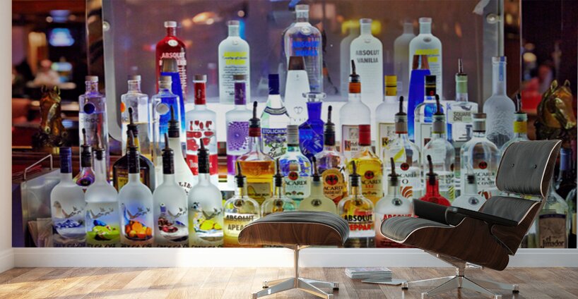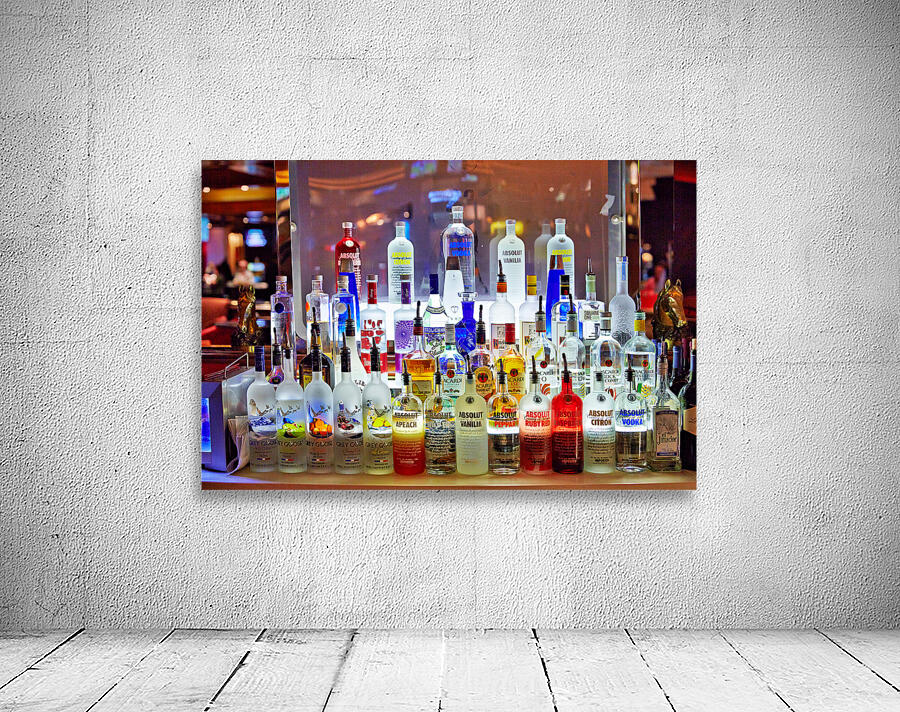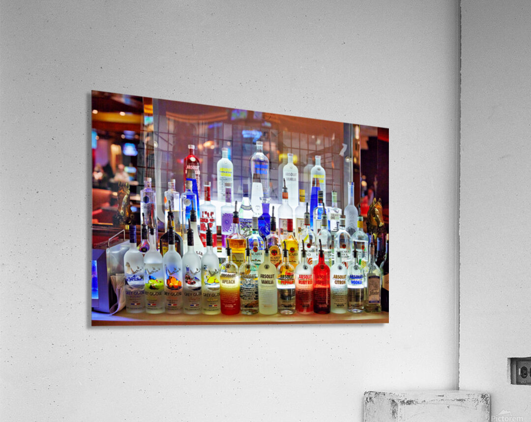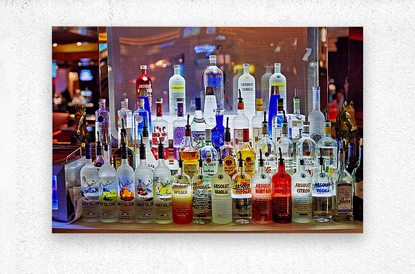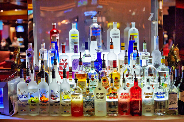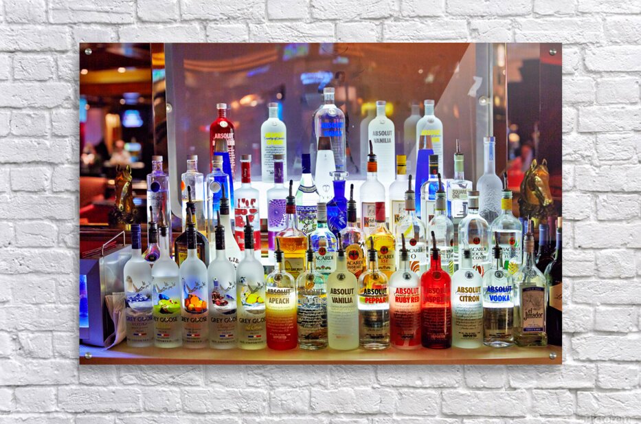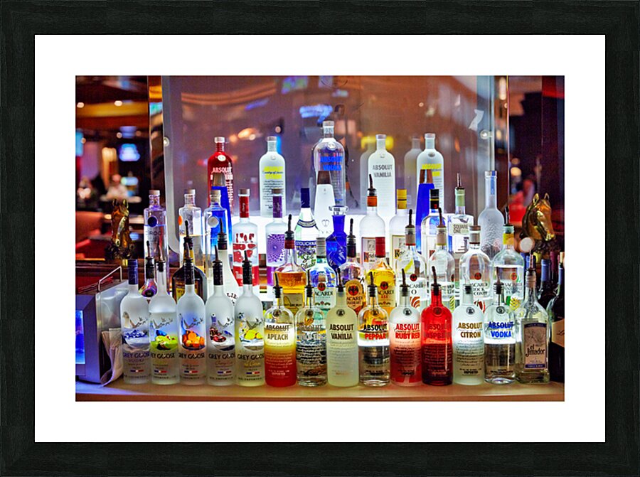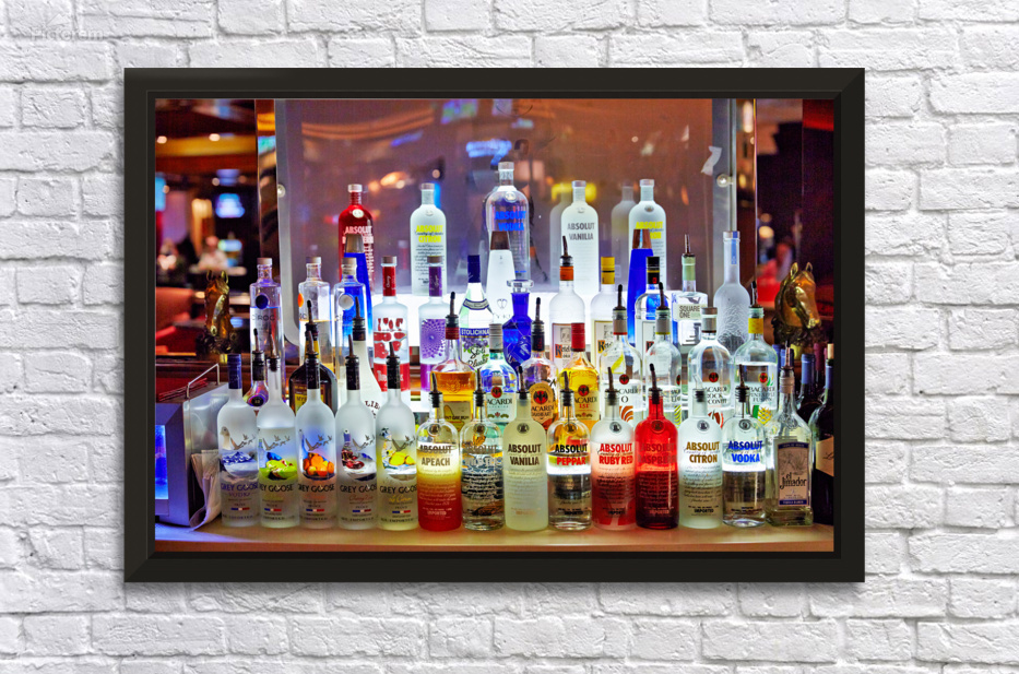 Several rows of vodka bottles are arranged on a shelf at the Bellagio Pub in Las Vegas. People can be seen in the background enjoying their time.