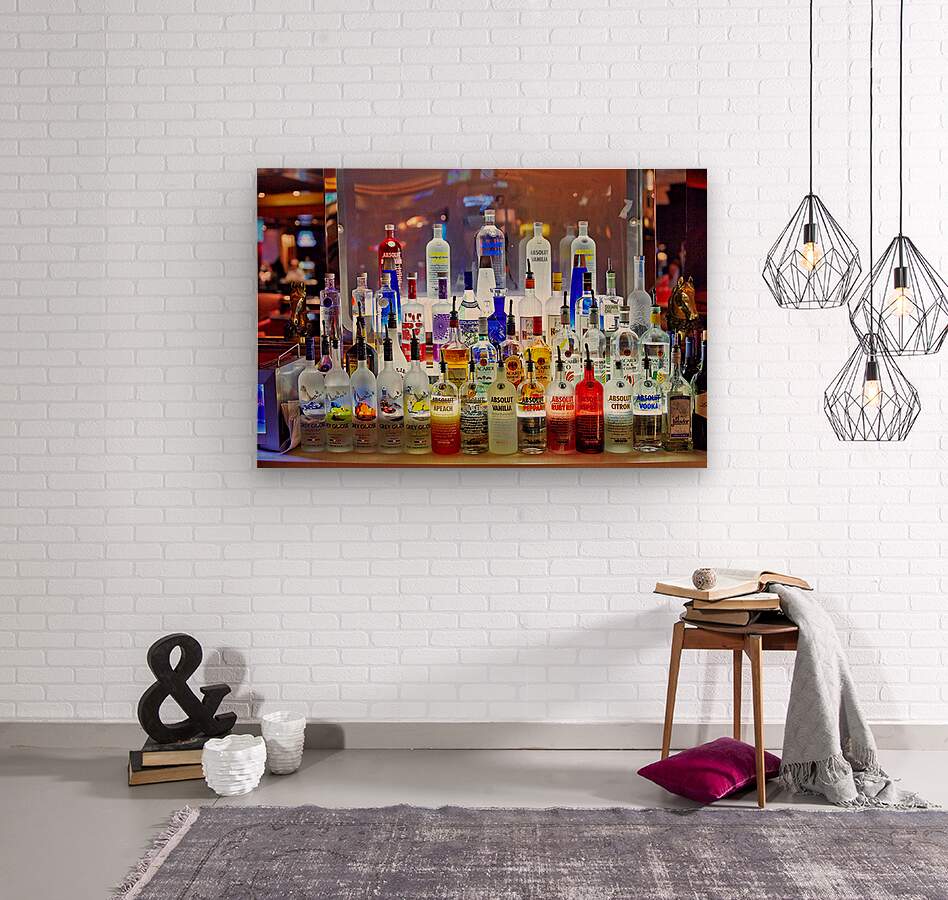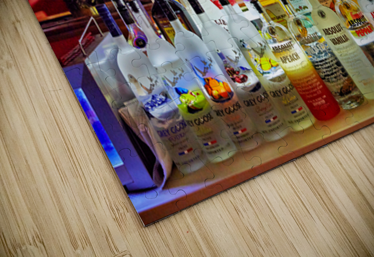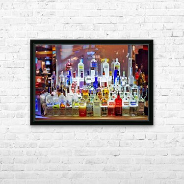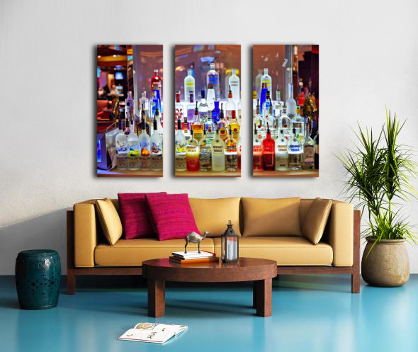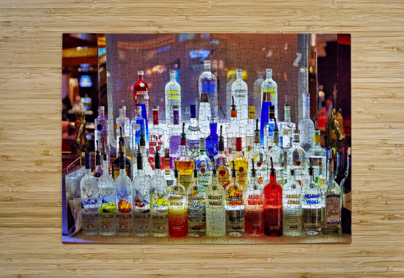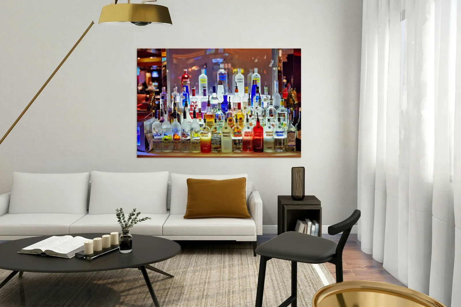 Several rows of vodka bottles are arranged on a shelf at the Bellagio Pub in Las Vegas. People can be seen in the background enjoying their time.