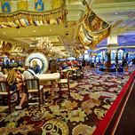 People gather around slot machines inside Bellagio Casino in Las Vegas. The casino is busy with visitors enjoying their time.