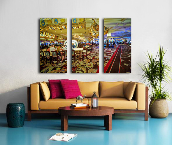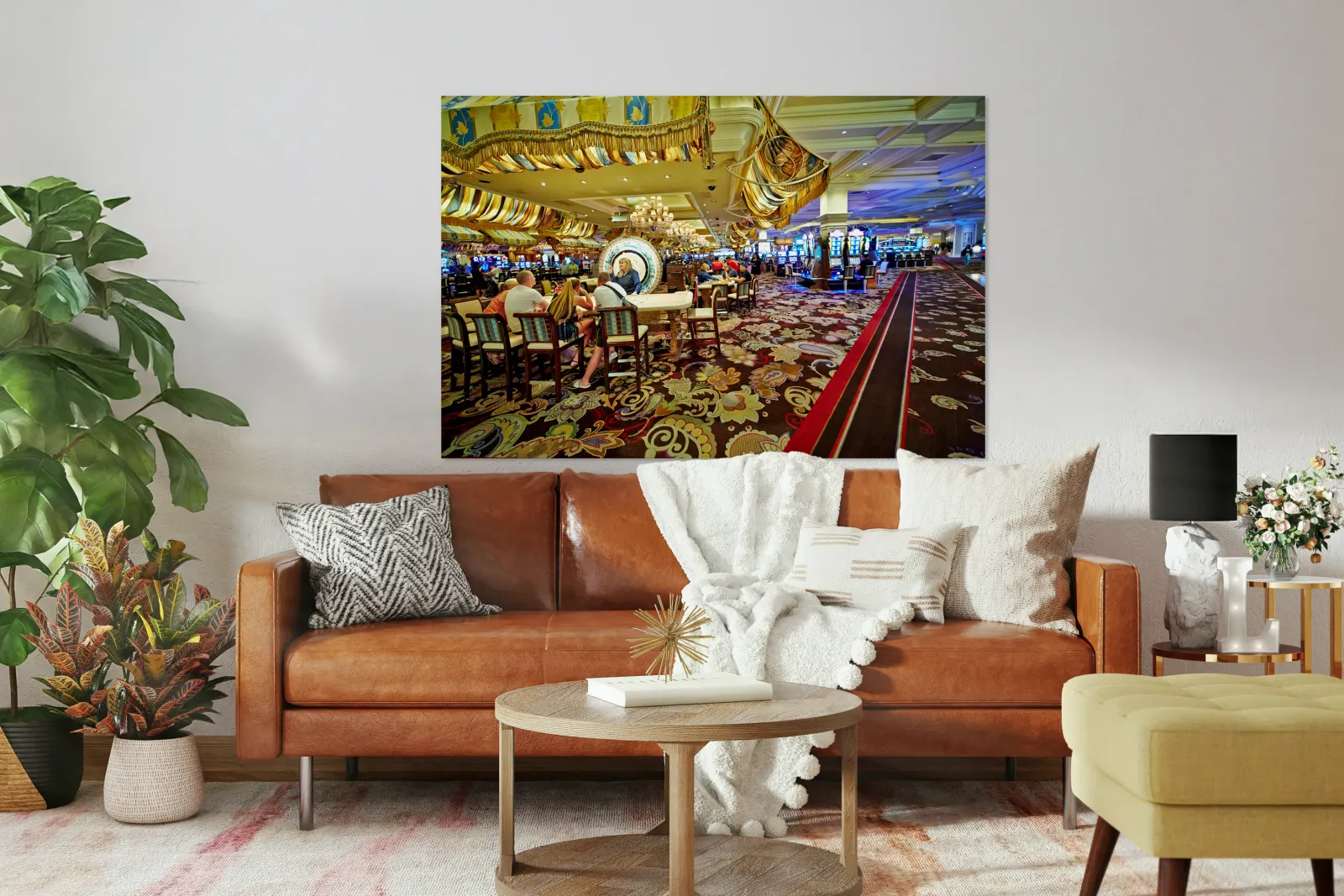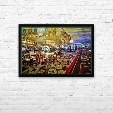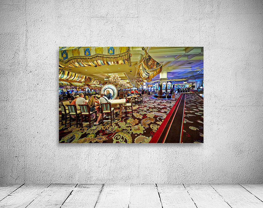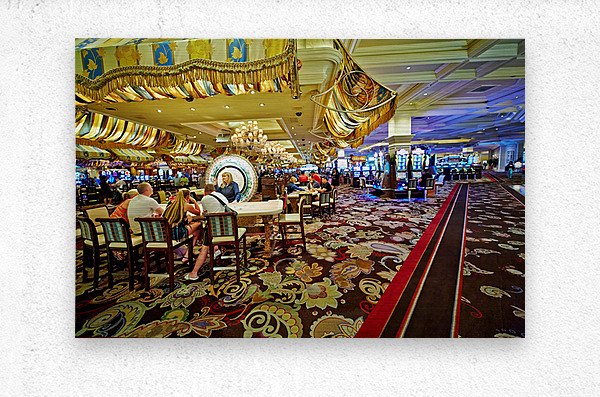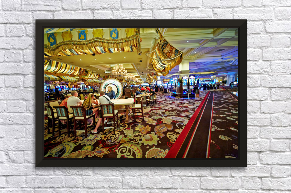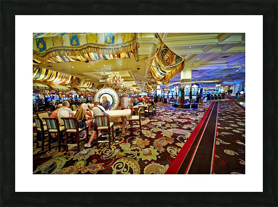 "Visitors play slot machines at Bellagio Casino in Las Vegas" in a framed print.