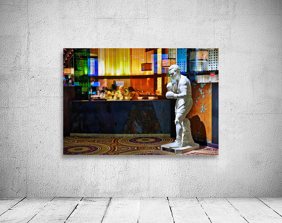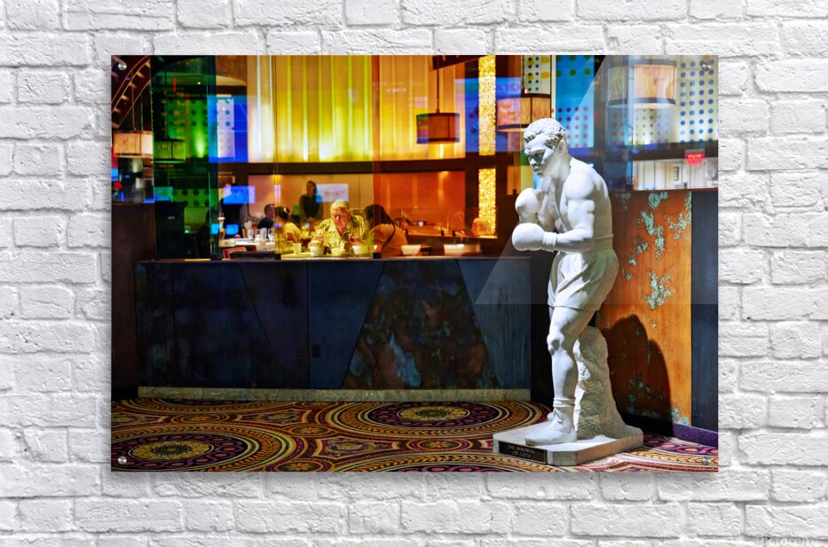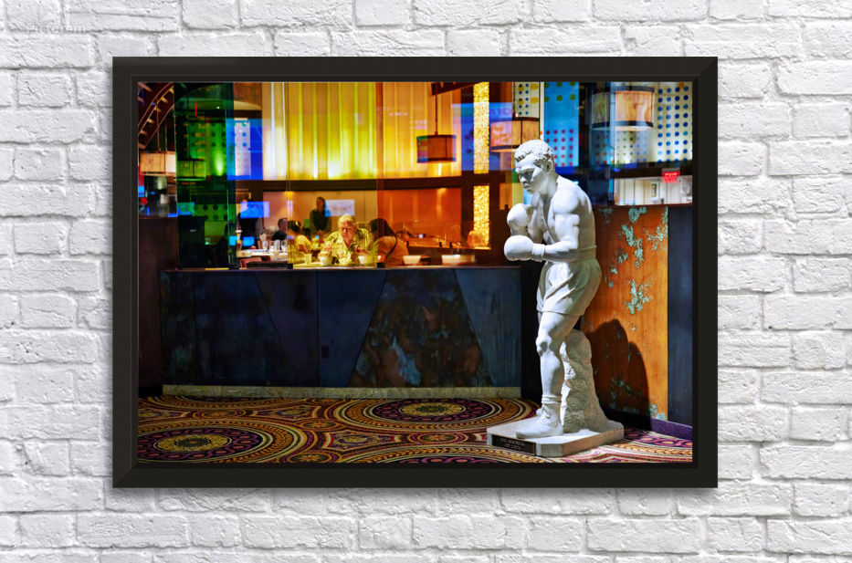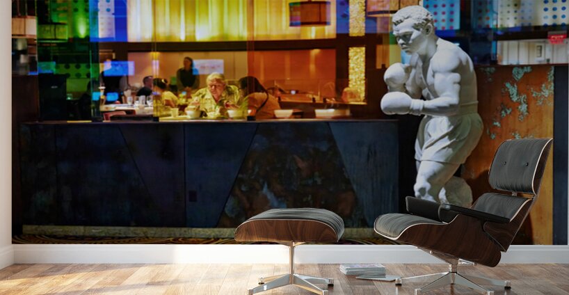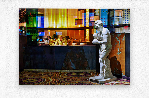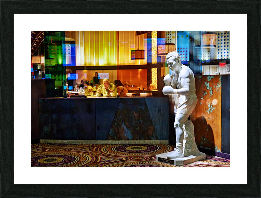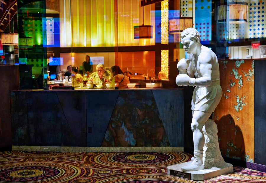 Visitors enjoy dining at restaurants inside Caesars Palace Hotel and Casino. A statue of a boxer stands in the foreground.