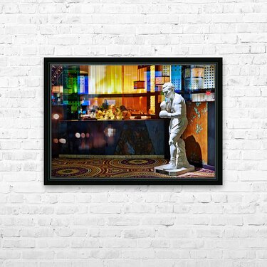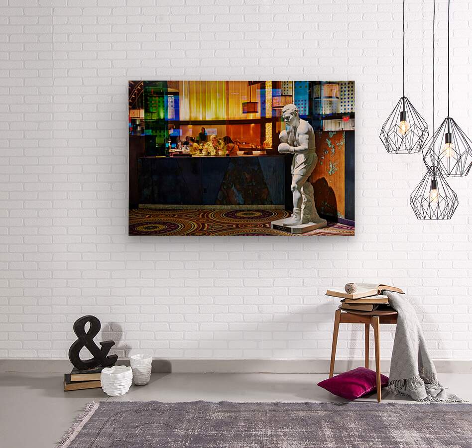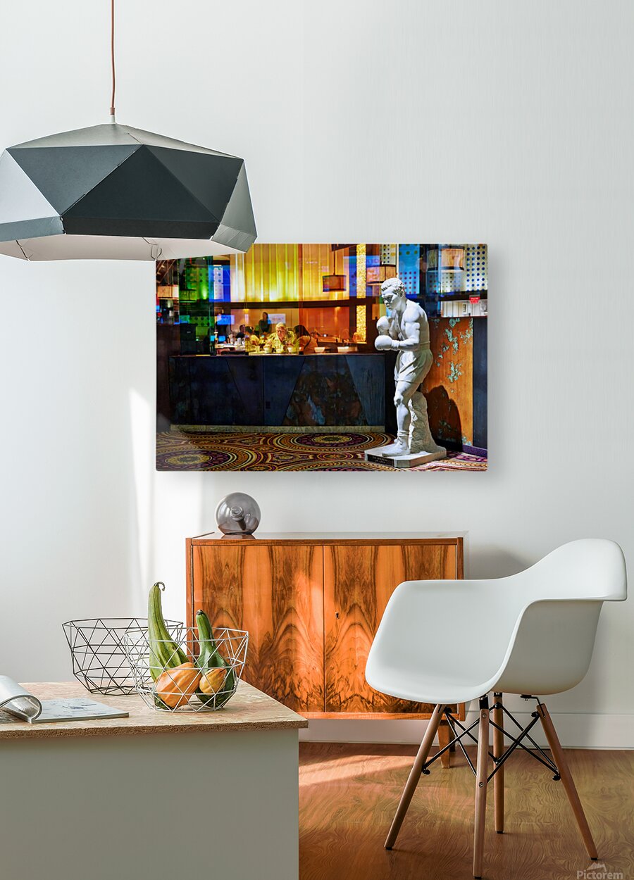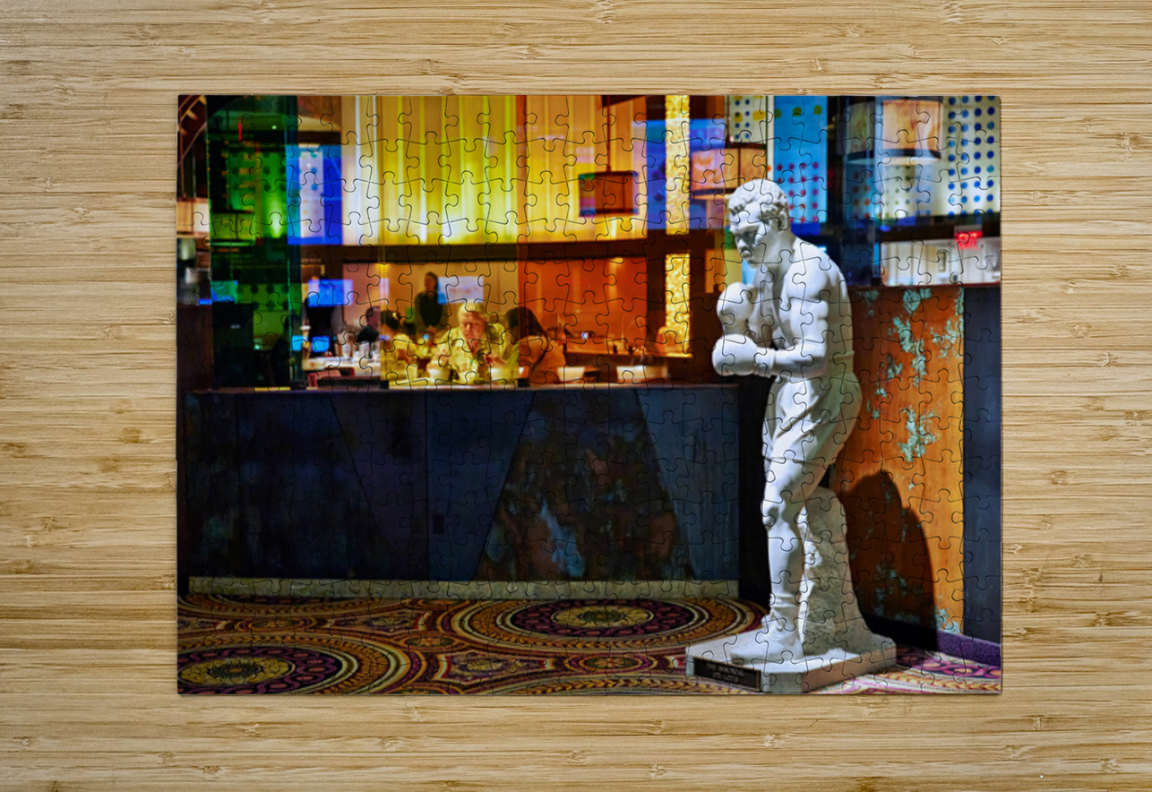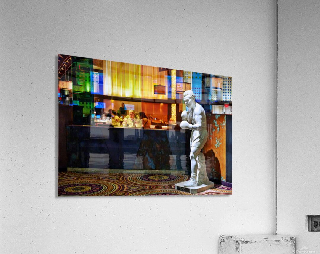 Visitors enjoy dining at restaurants inside Caesars Palace Hotel and Casino. A statue of a boxer stands in the foreground.