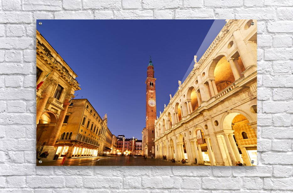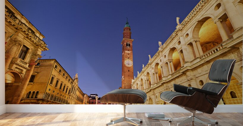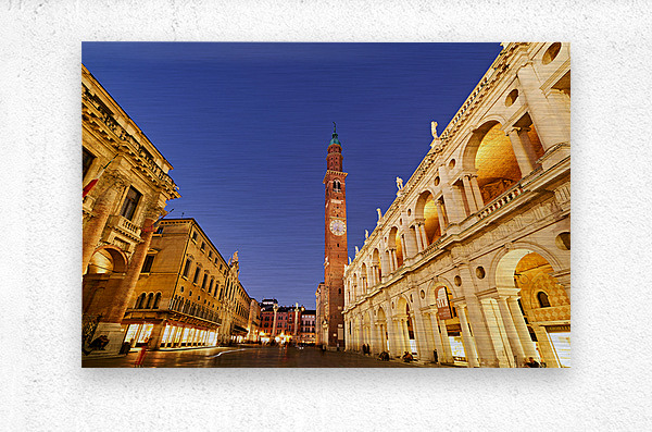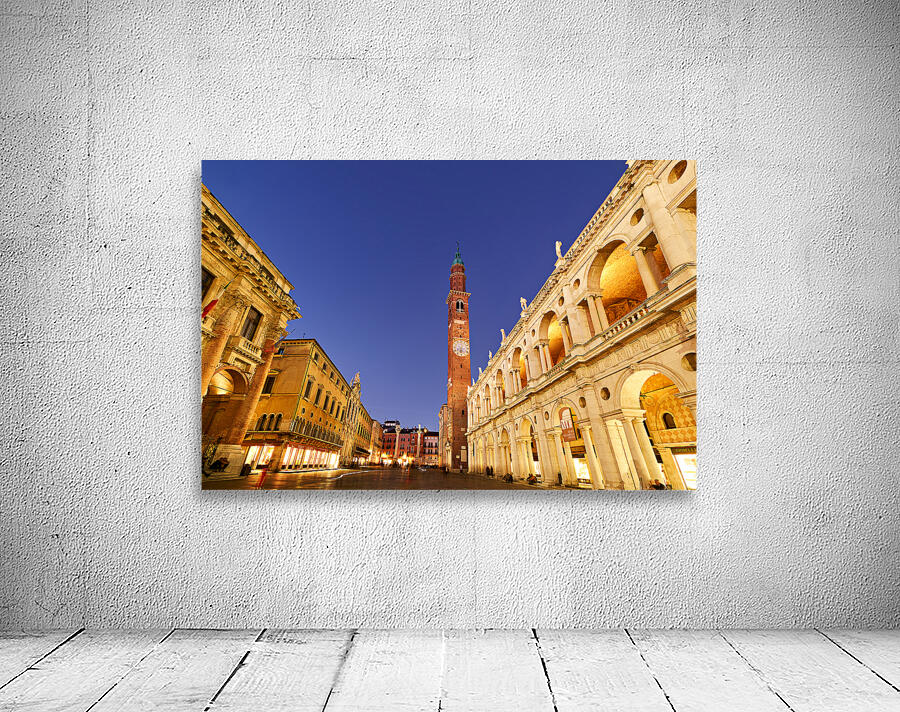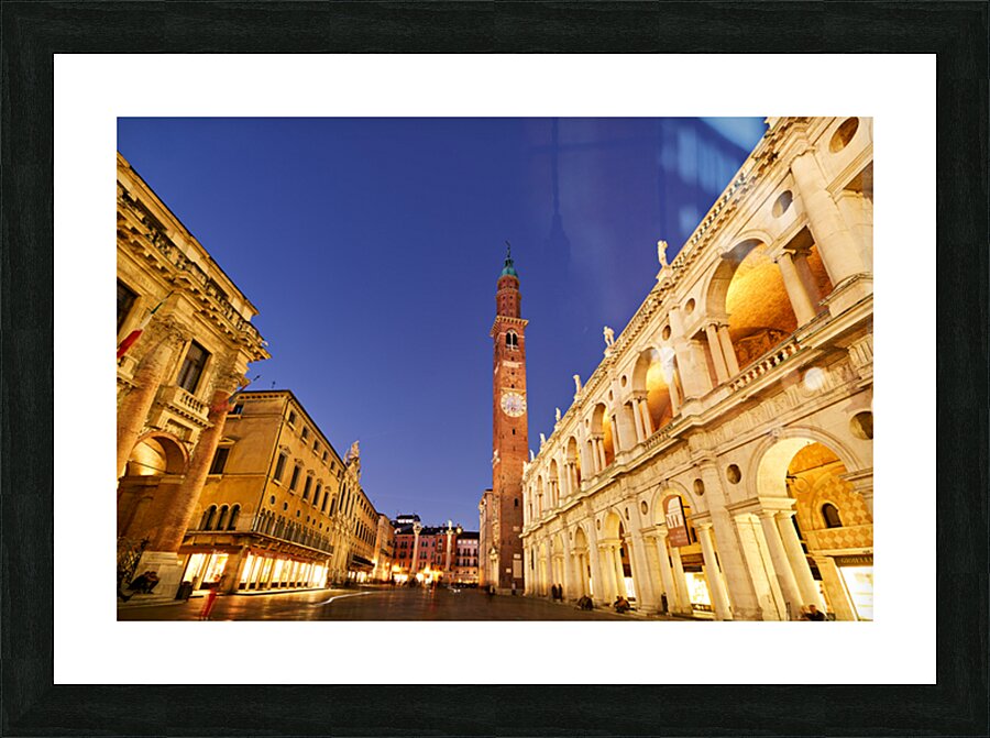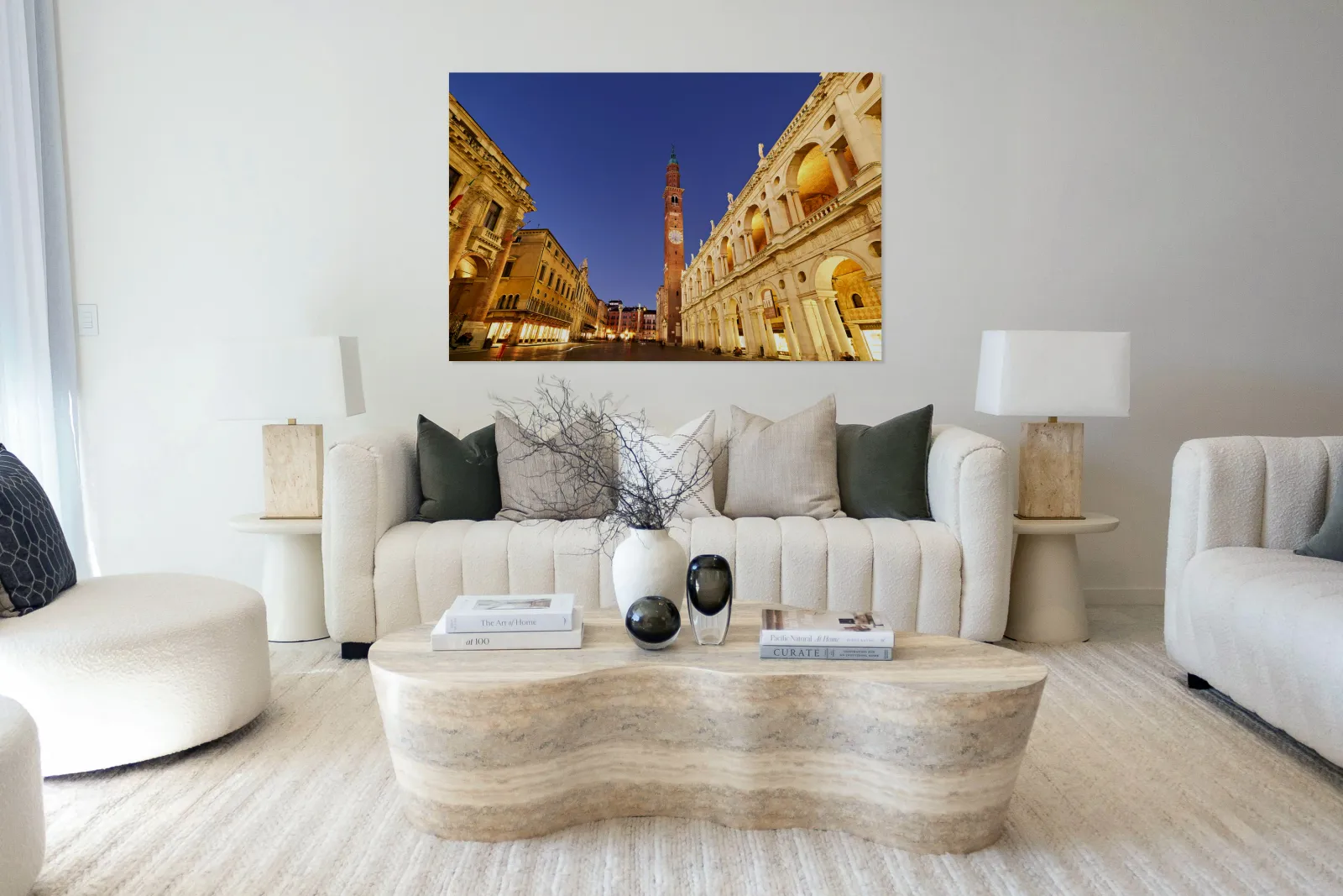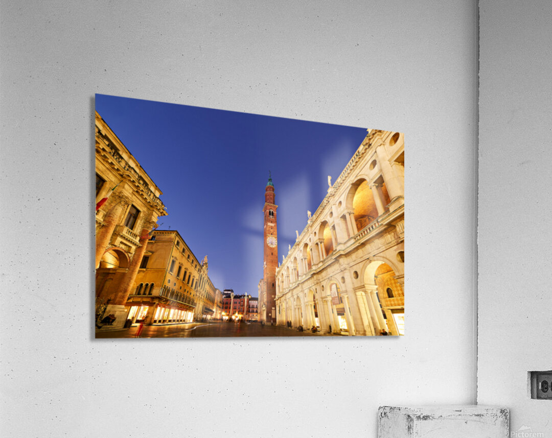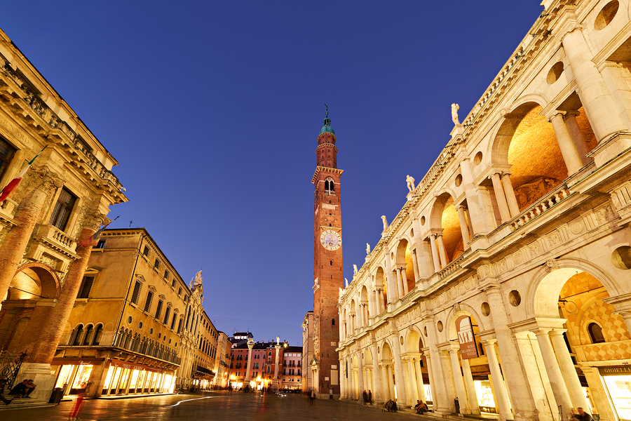 Visitors gather near the Basilica Palladiana as the clock tower lights up in Vicenza Italy during the evening hours with a clear sky.