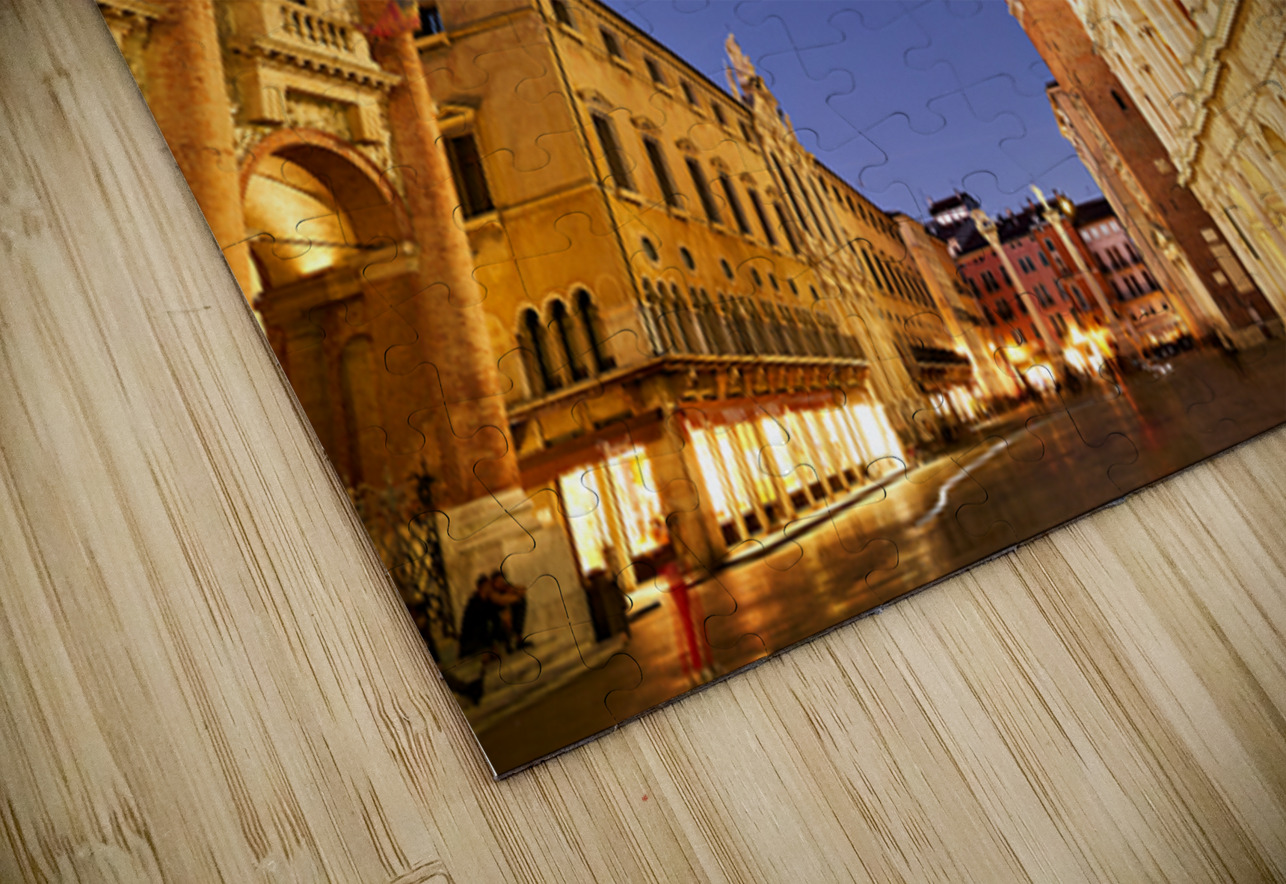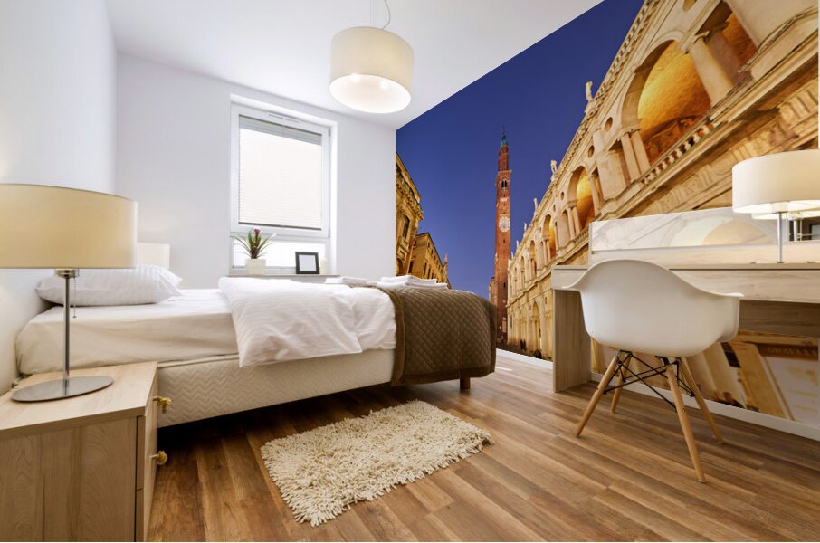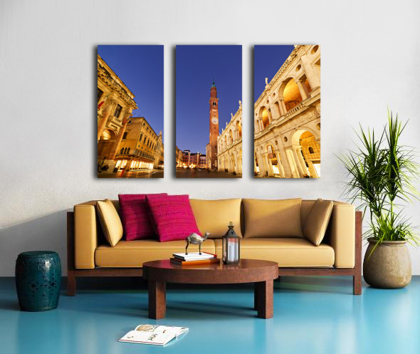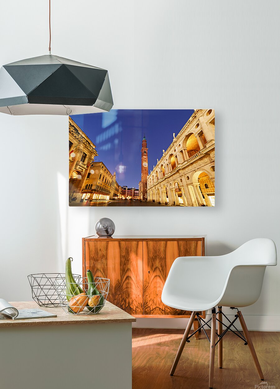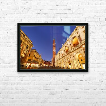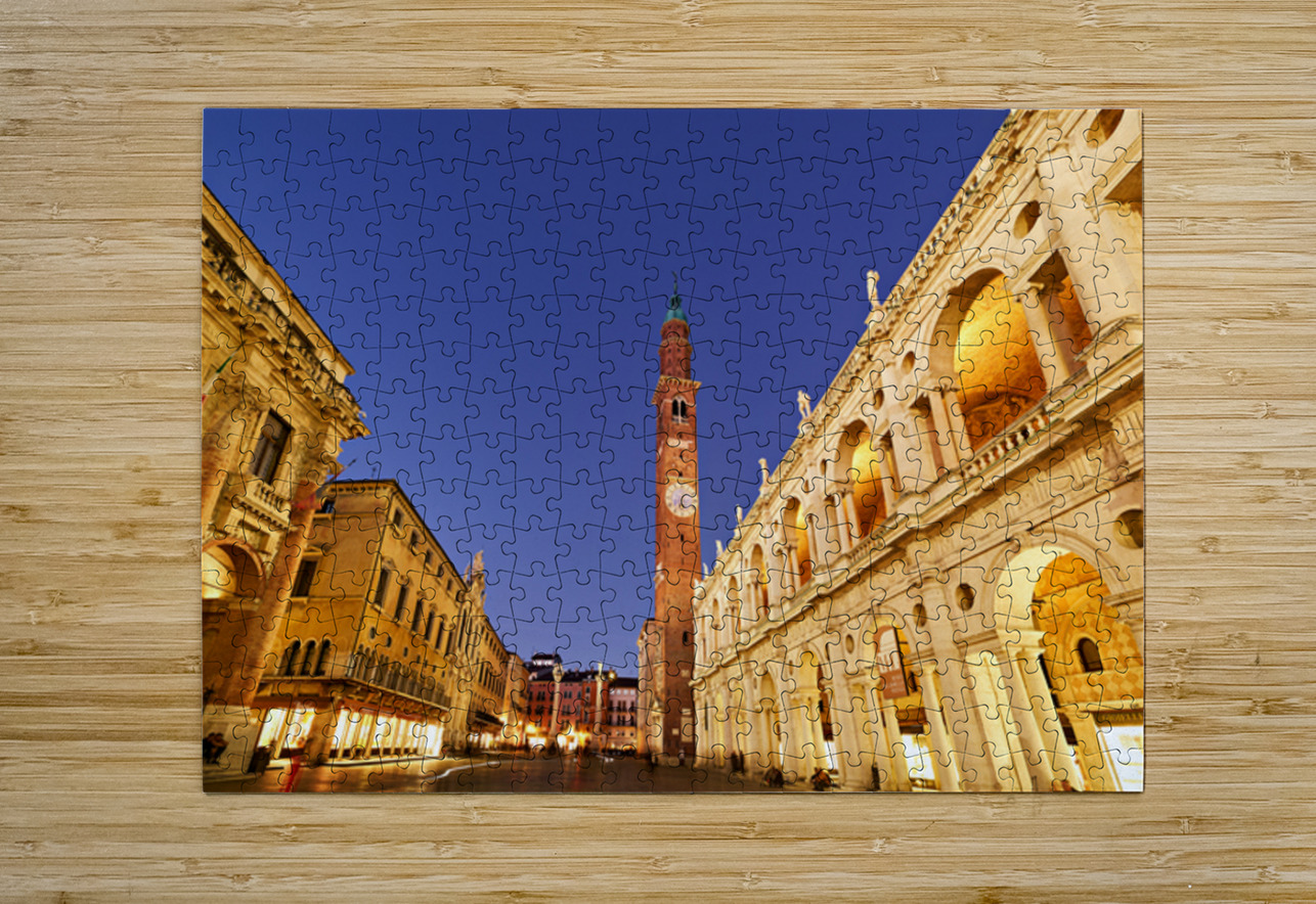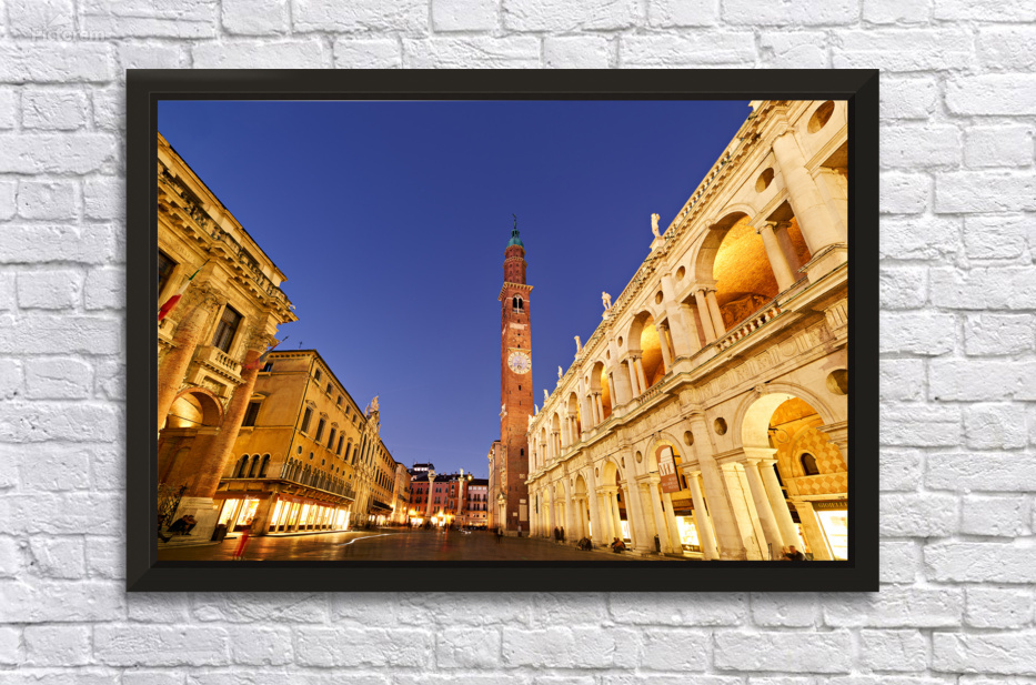 Visitors gather near the Basilica Palladiana as the clock tower lights up in Vicenza Italy during the evening hours with a clear sky.