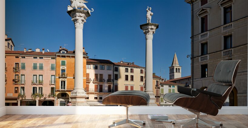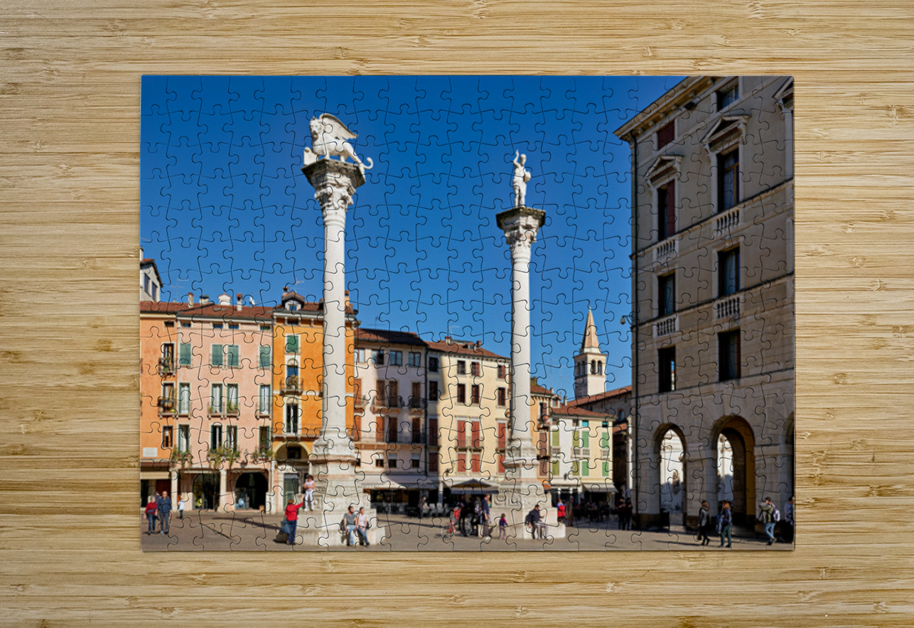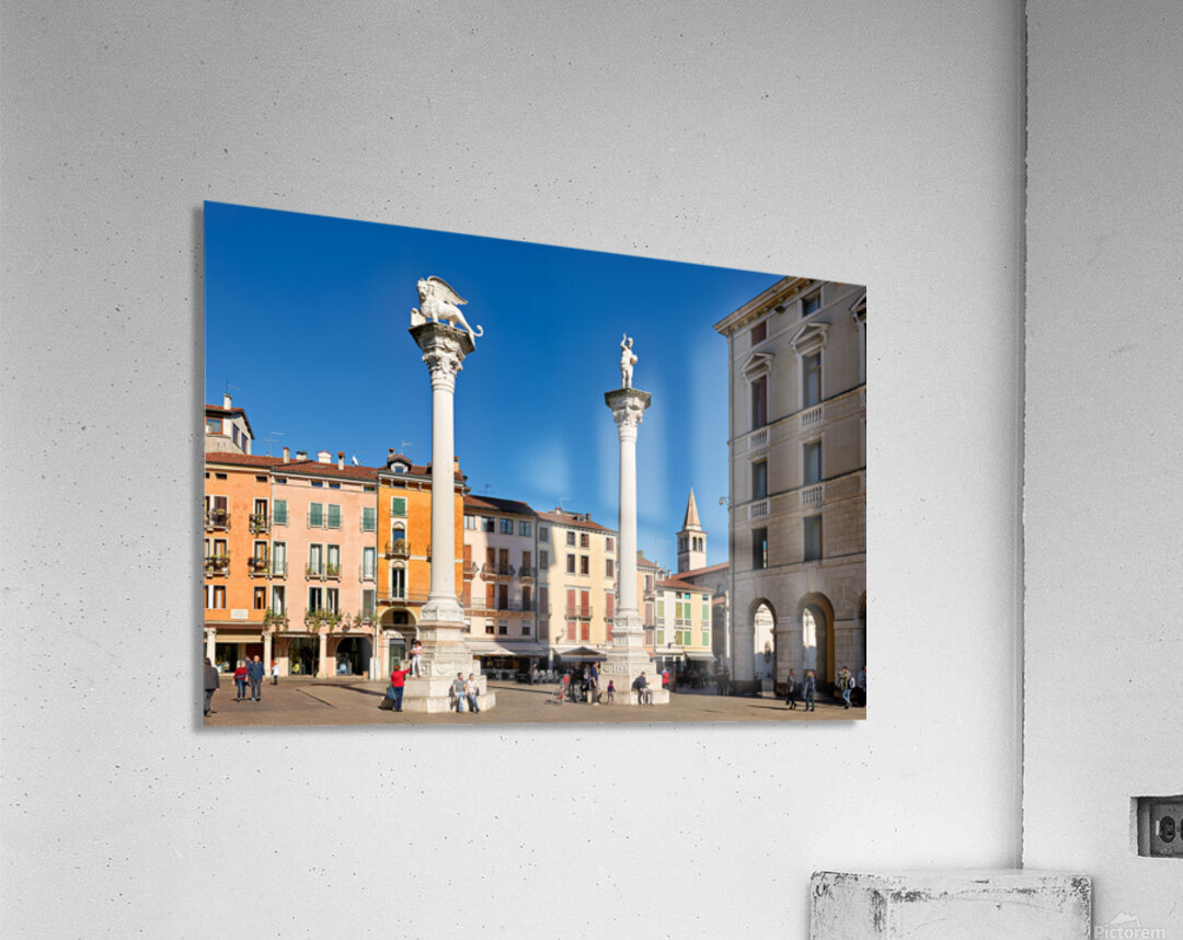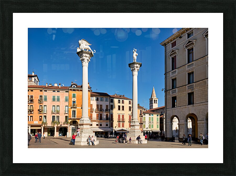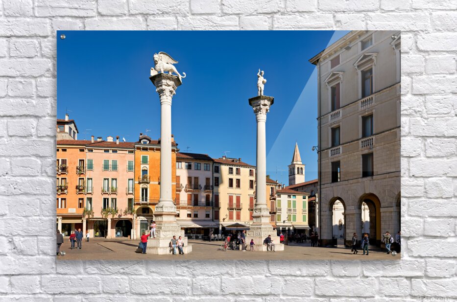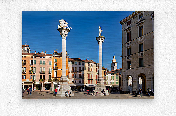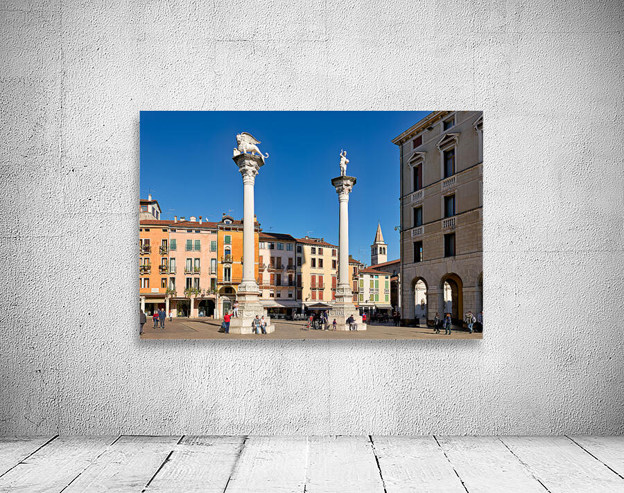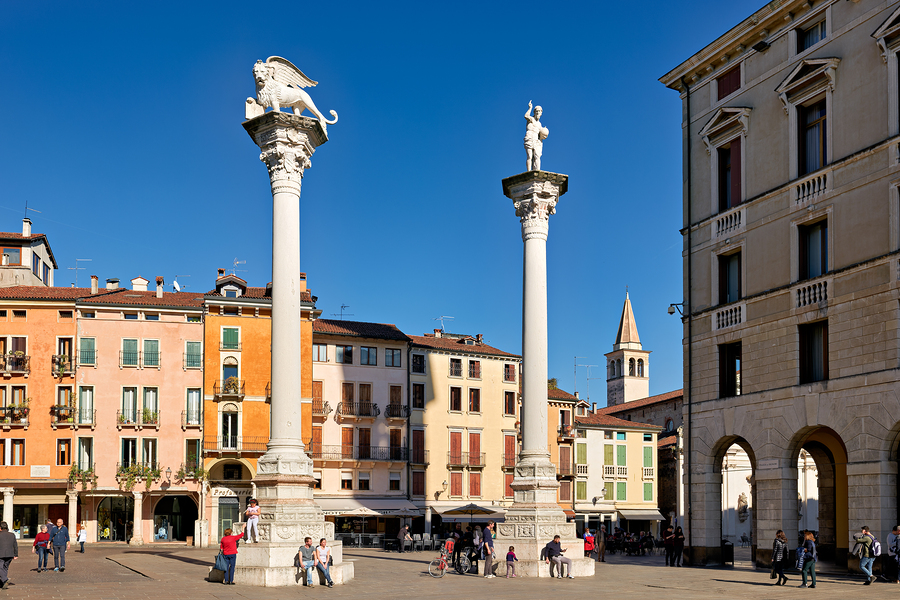 Visitors gather in Piazza dei Signori enjoying the buildings and columns in Vicenza Veneto during a clear sunny day.