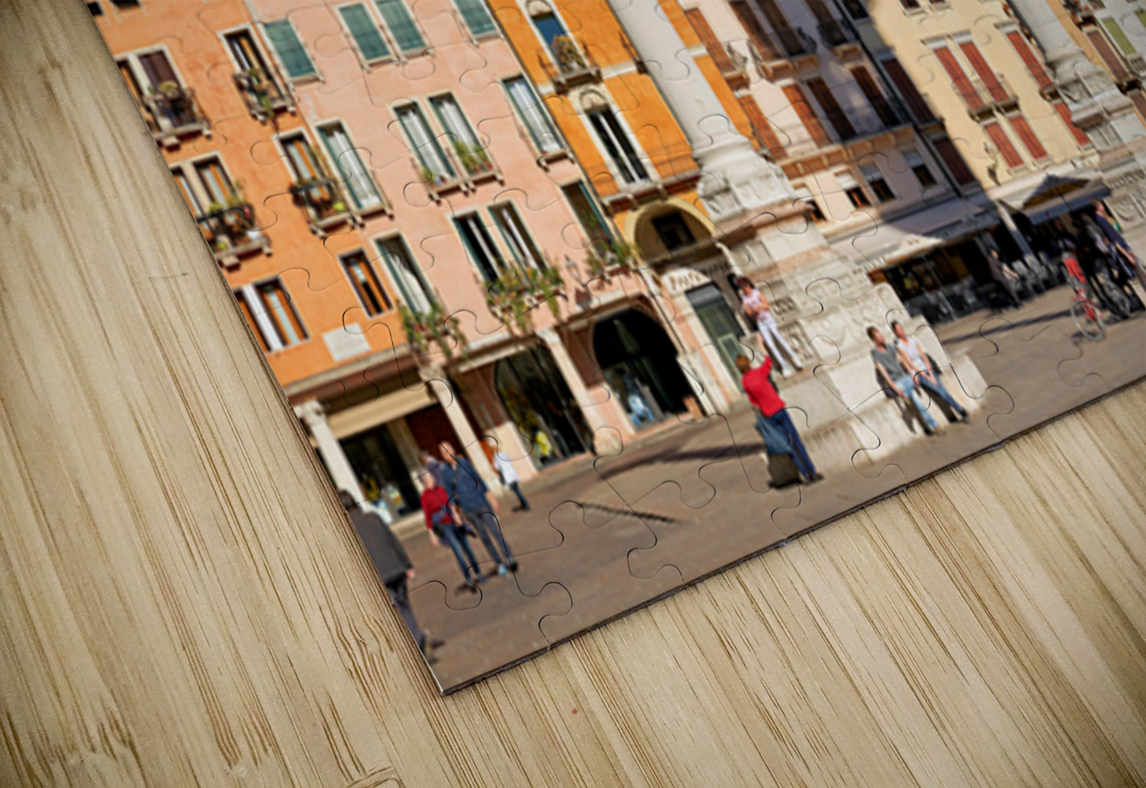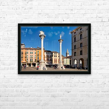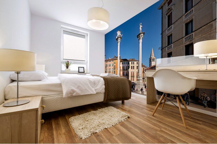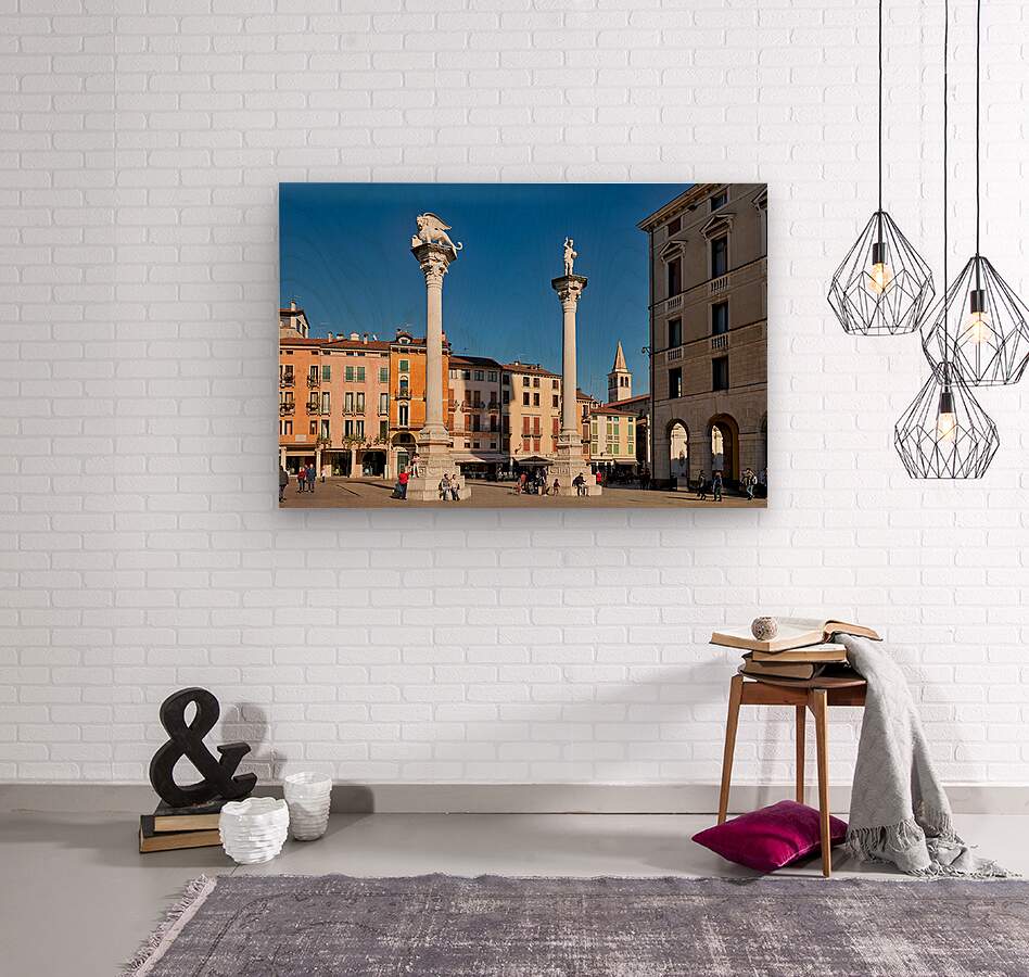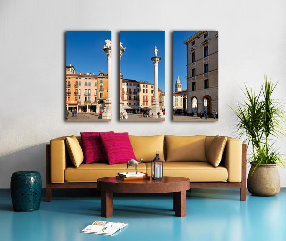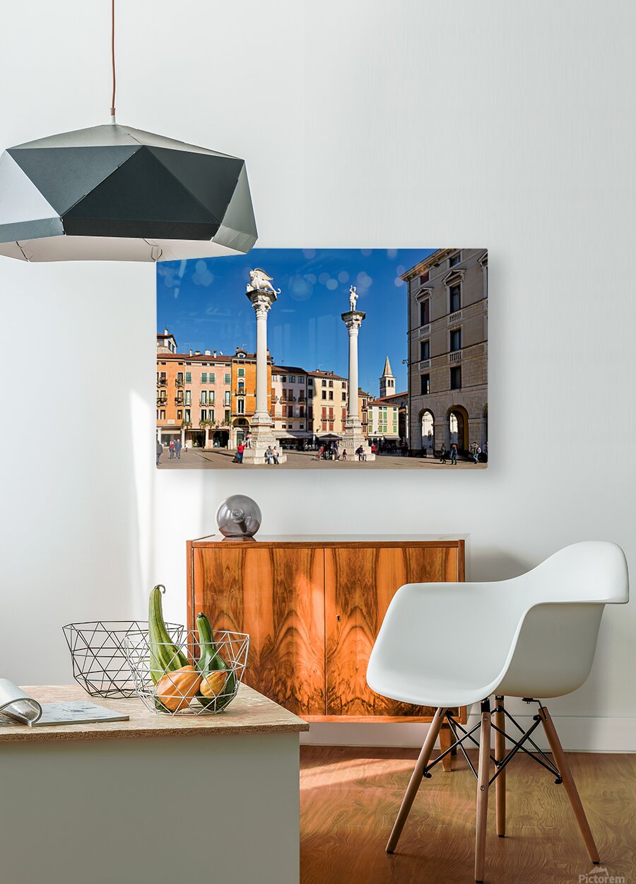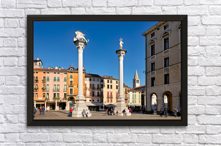 Visitors gather in Piazza dei Signori enjoying the buildings and columns in Vicenza Veneto during a clear sunny day.