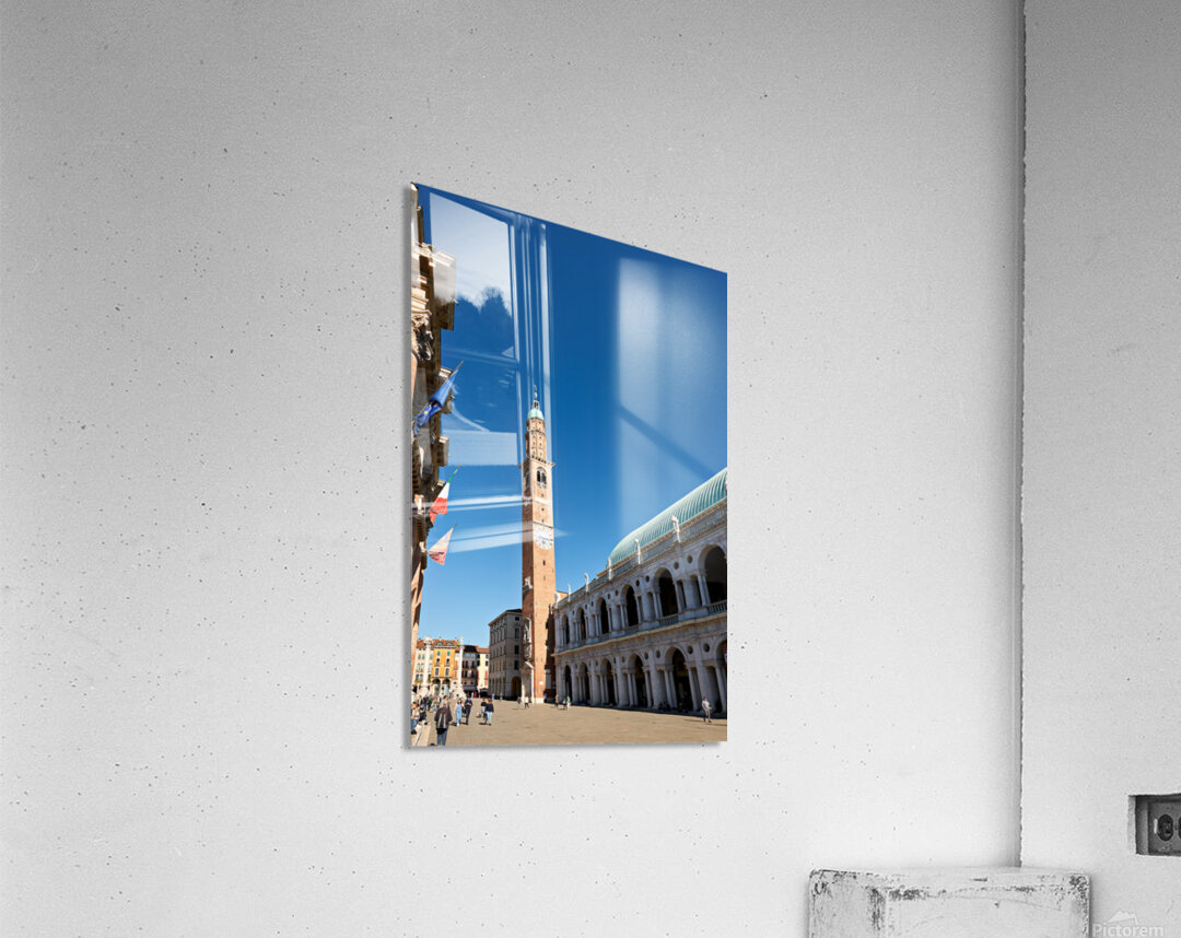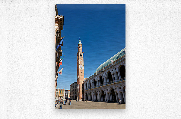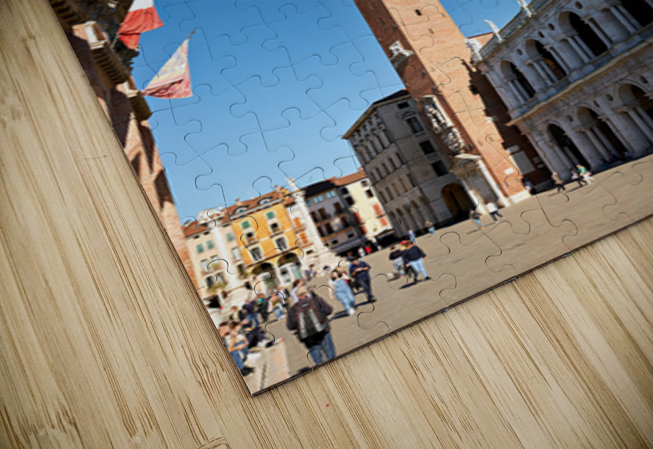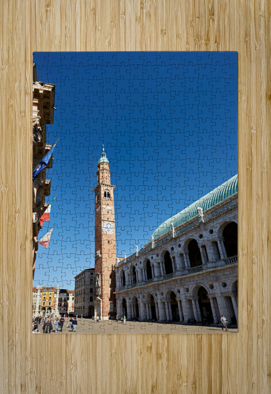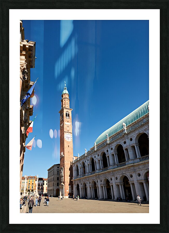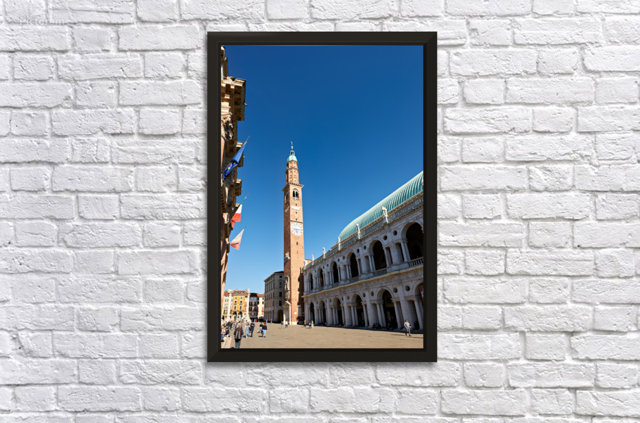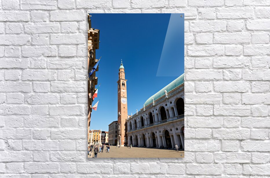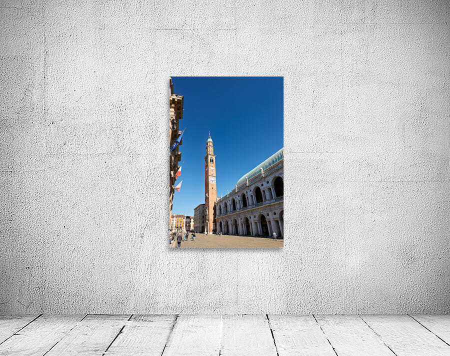 People explore the area around Basilica Palladiana in Vicenza Veneto Italy on a bright sunny day enjoying the historical architecture and atmosphere.
