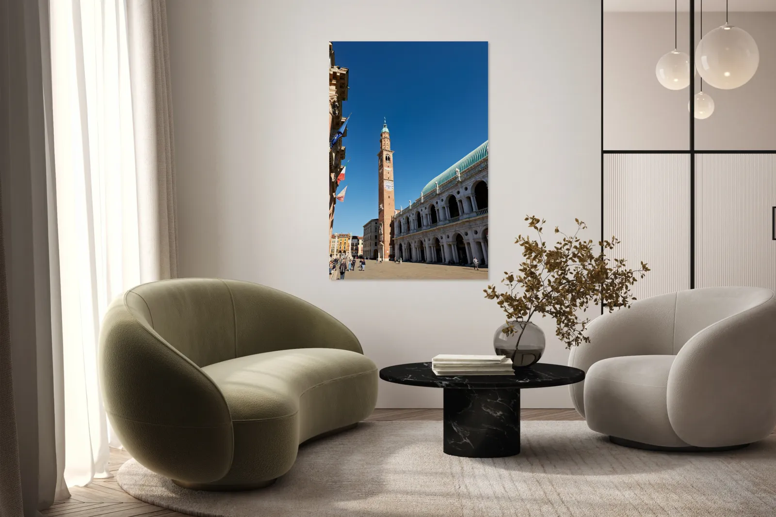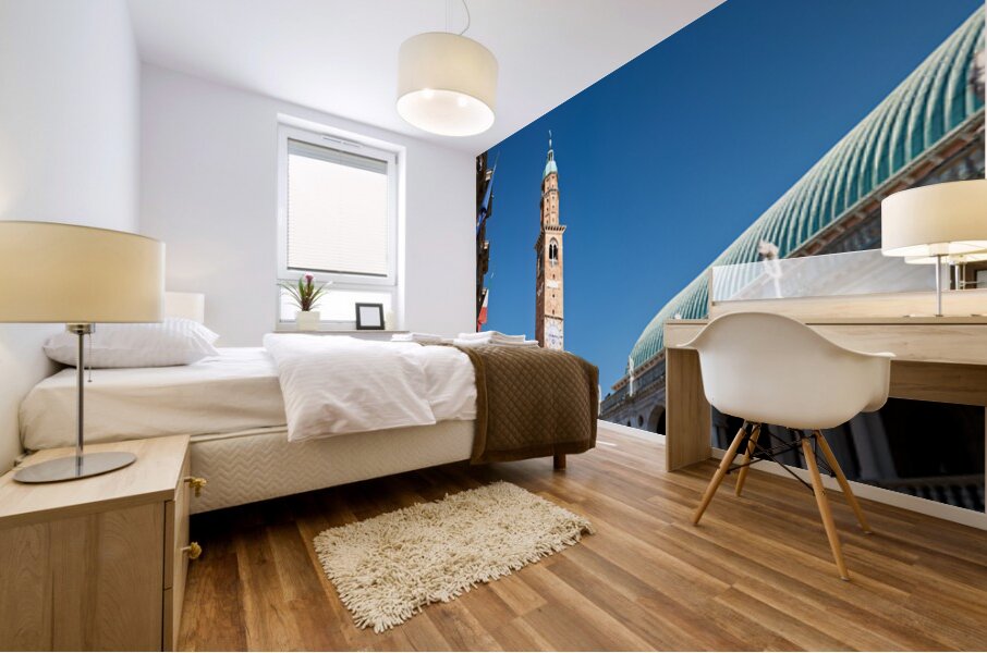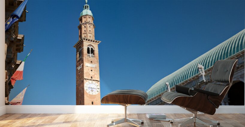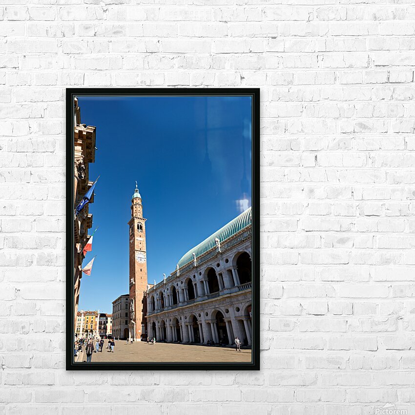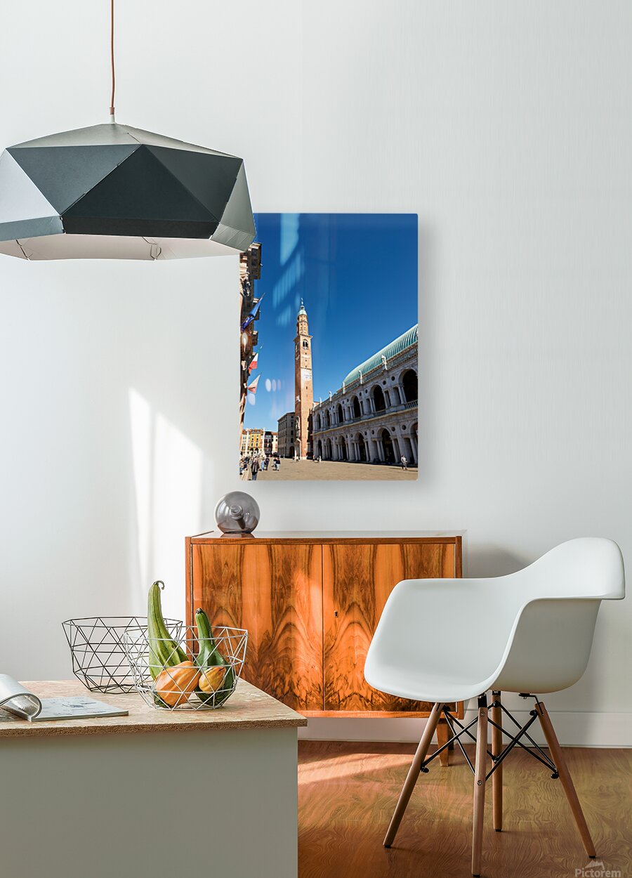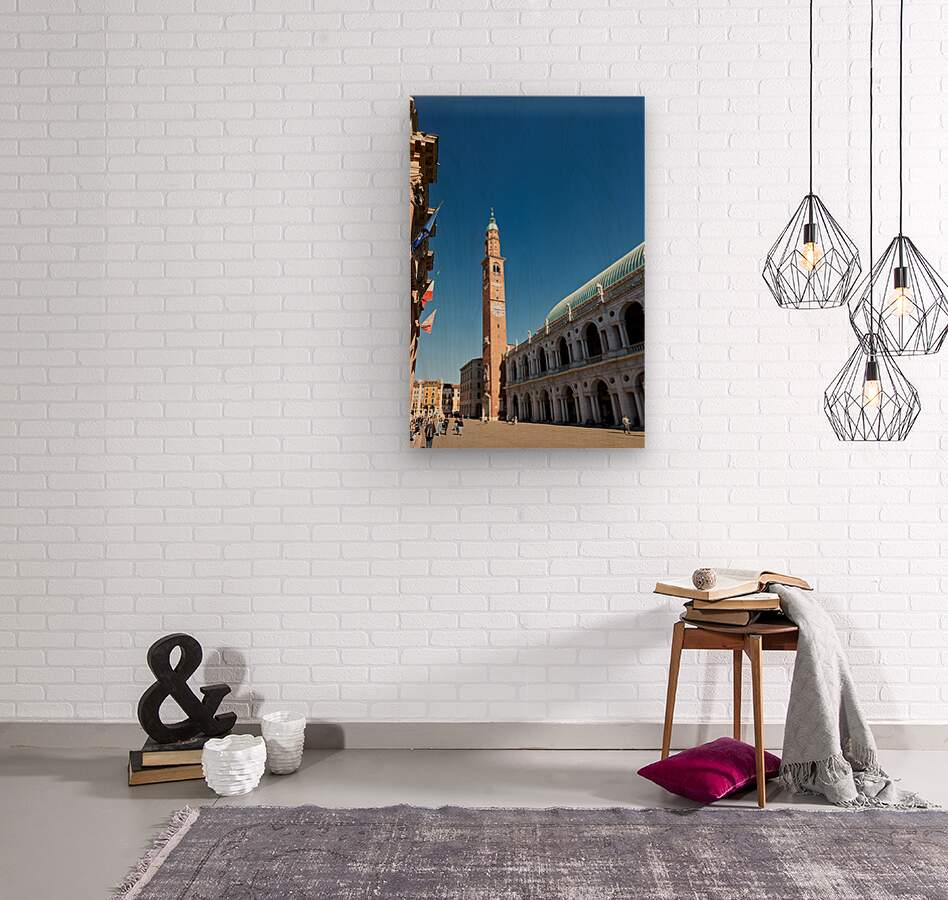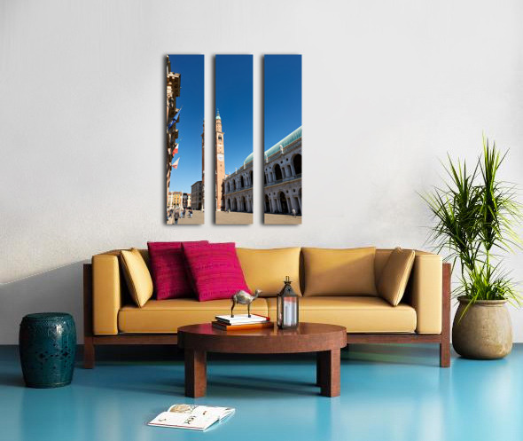 People explore the area around Basilica Palladiana in Vicenza Veneto Italy on a bright sunny day enjoying the historical architecture and atmosphere.