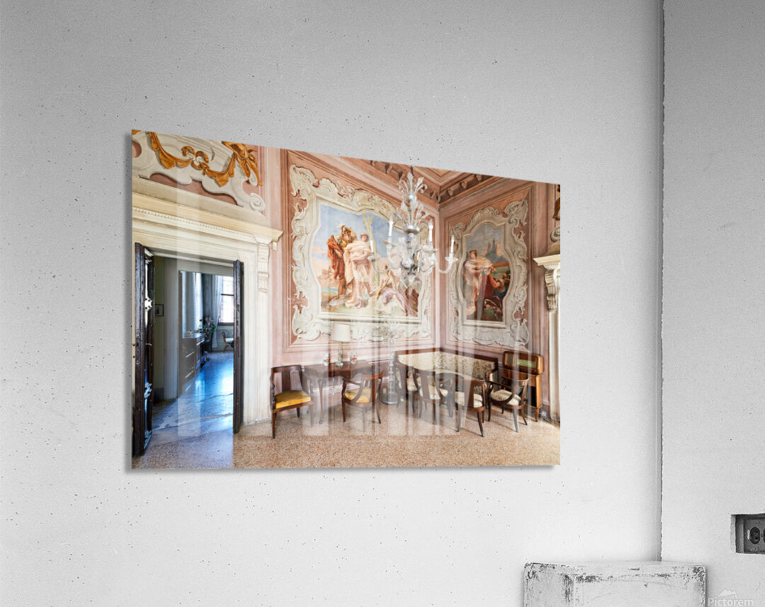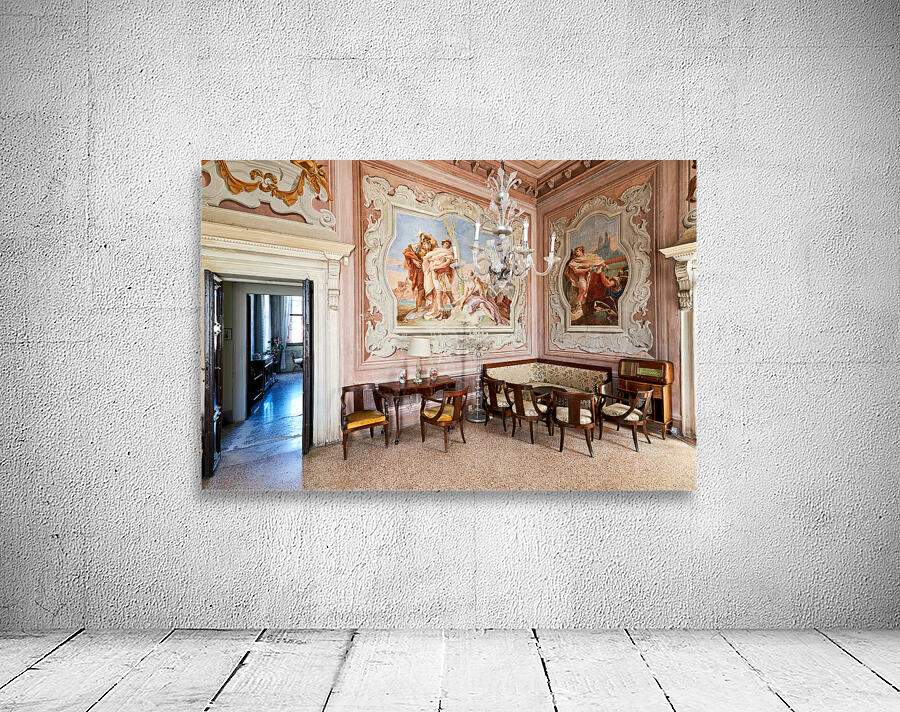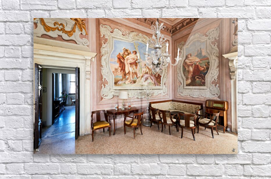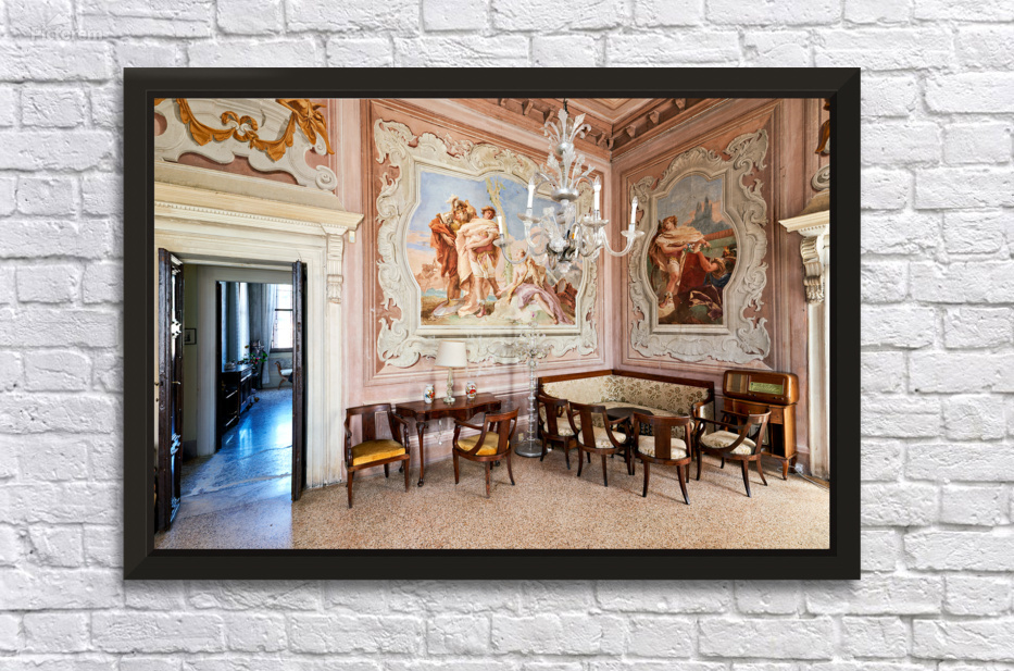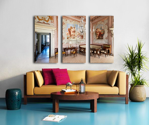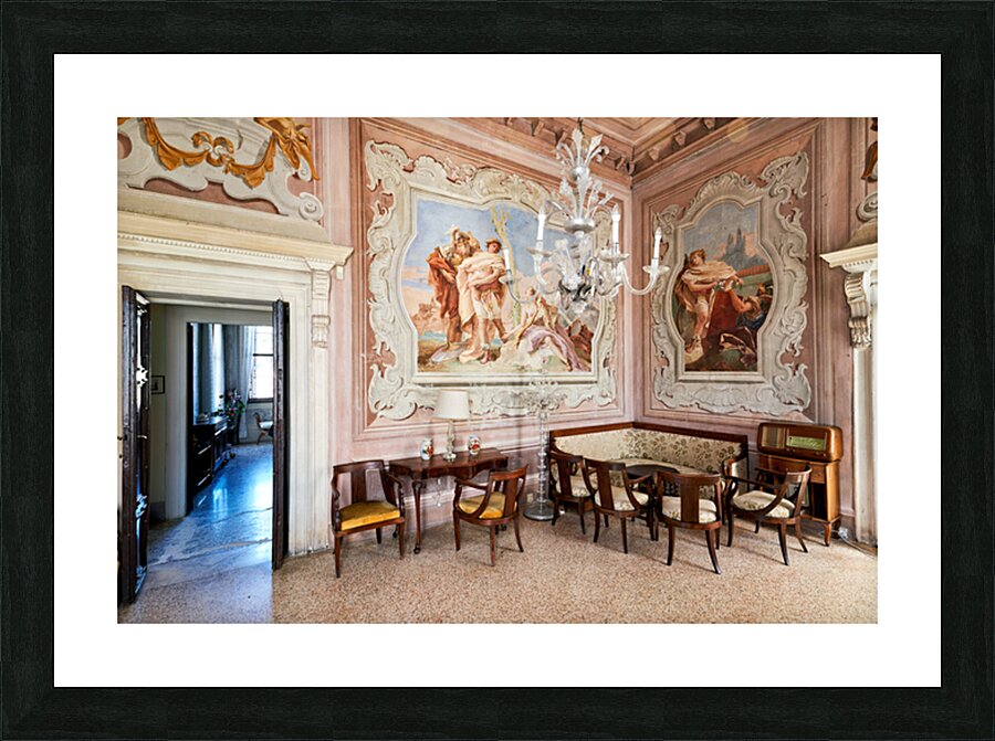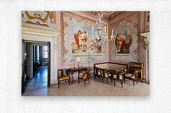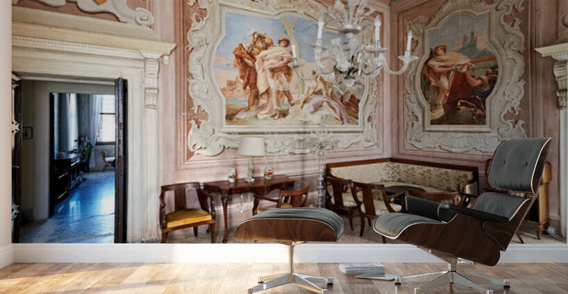 Visitors explore Villa Valmarana ai Nani in Vicenza where Tiepolo frescoes decorate the walls in a historic setting with elegant furniture.