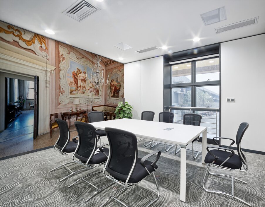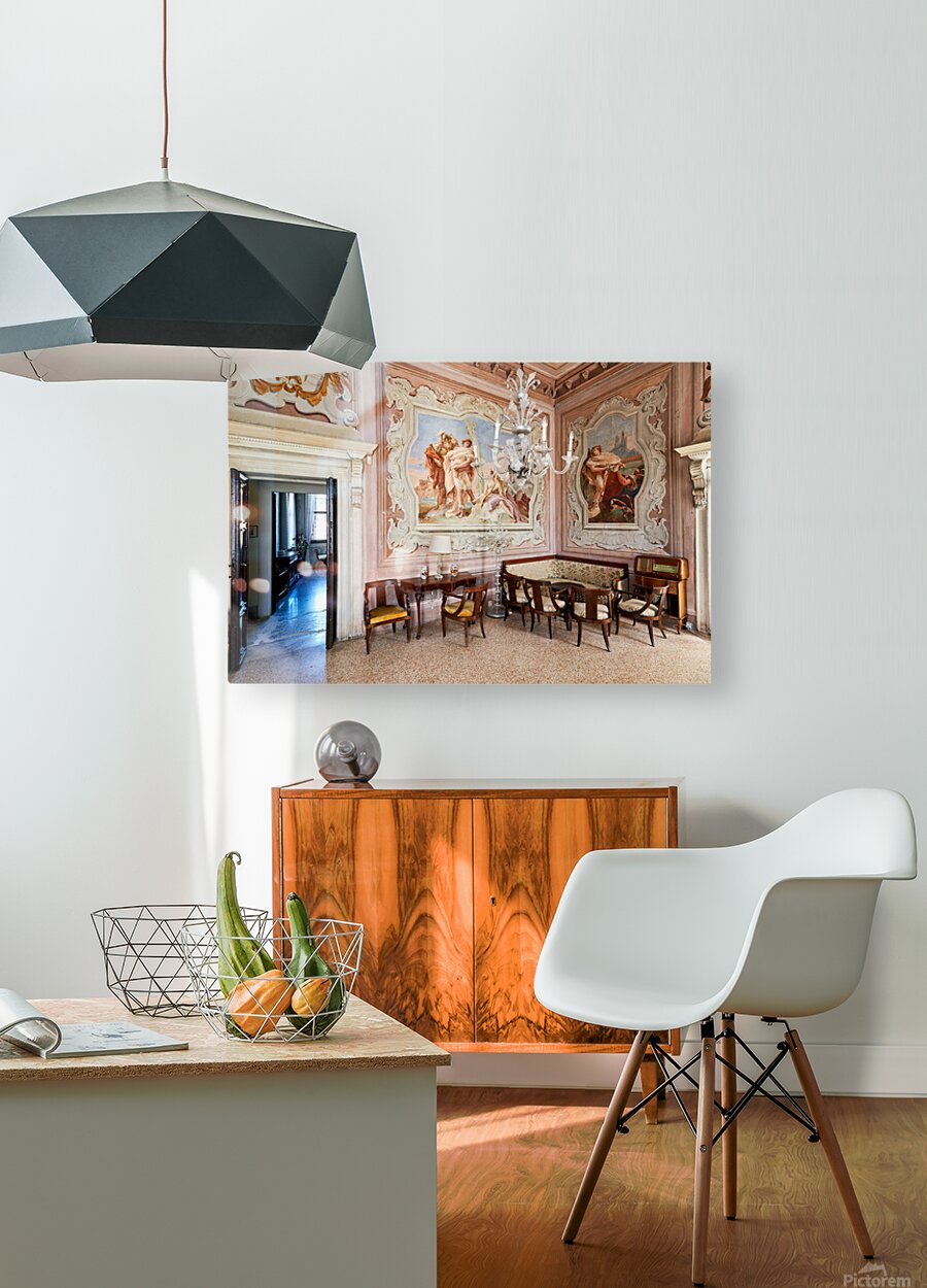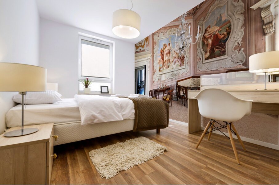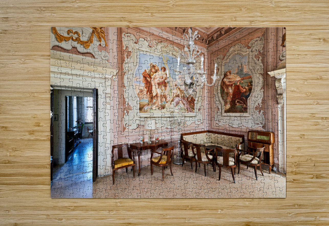 Visitors explore Villa Valmarana ai Nani in Vicenza where Tiepolo frescoes decorate the walls in a historic setting with elegant furniture.
