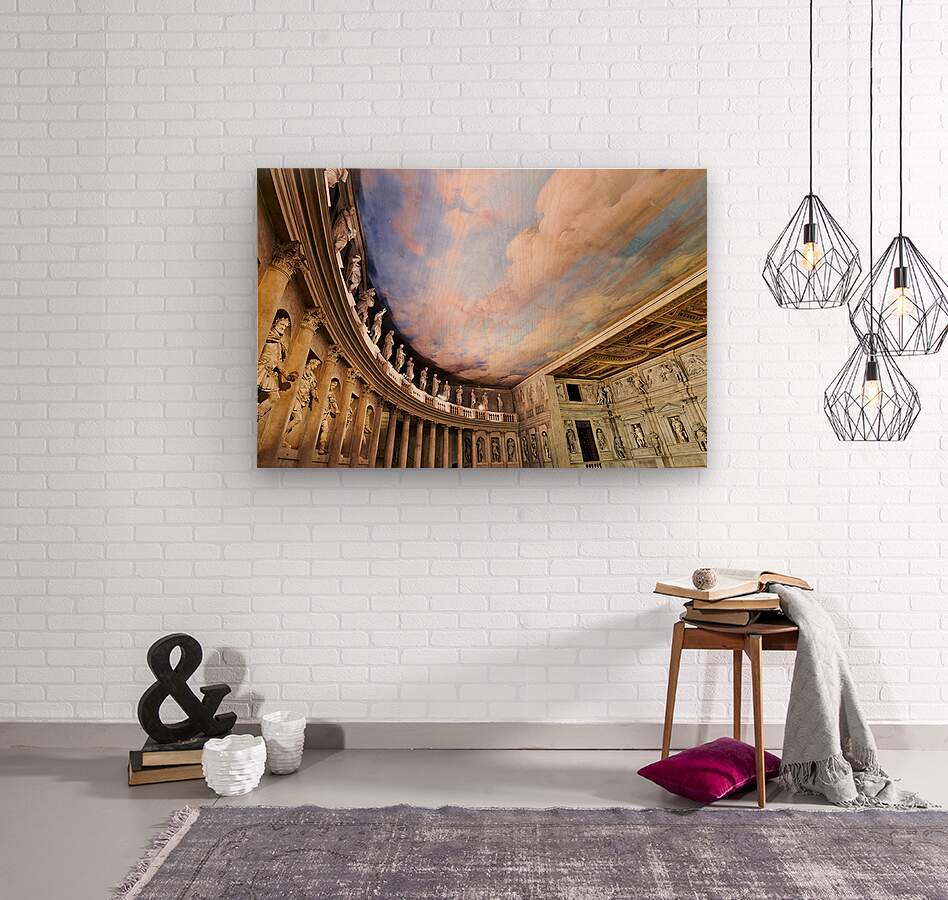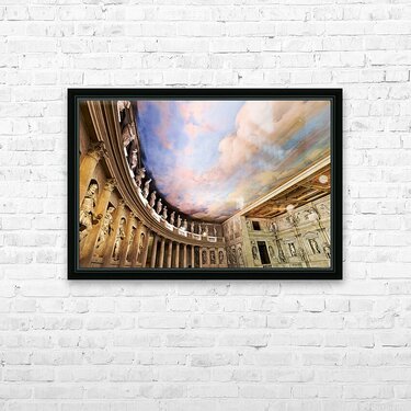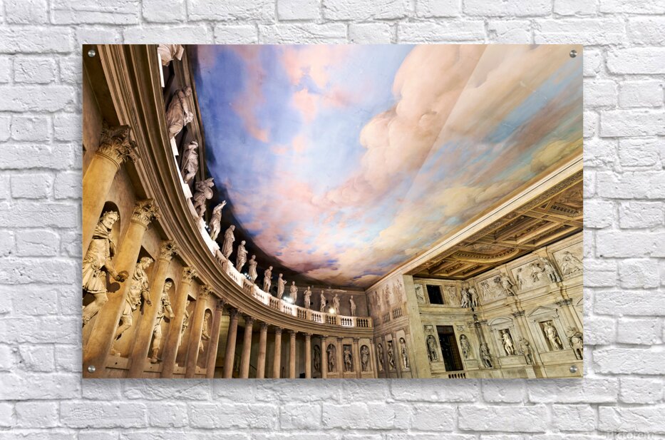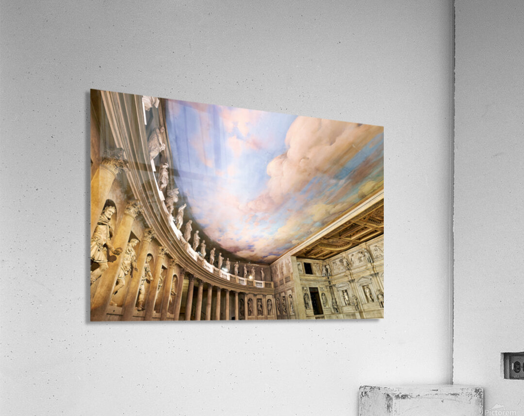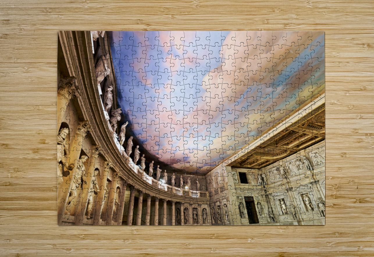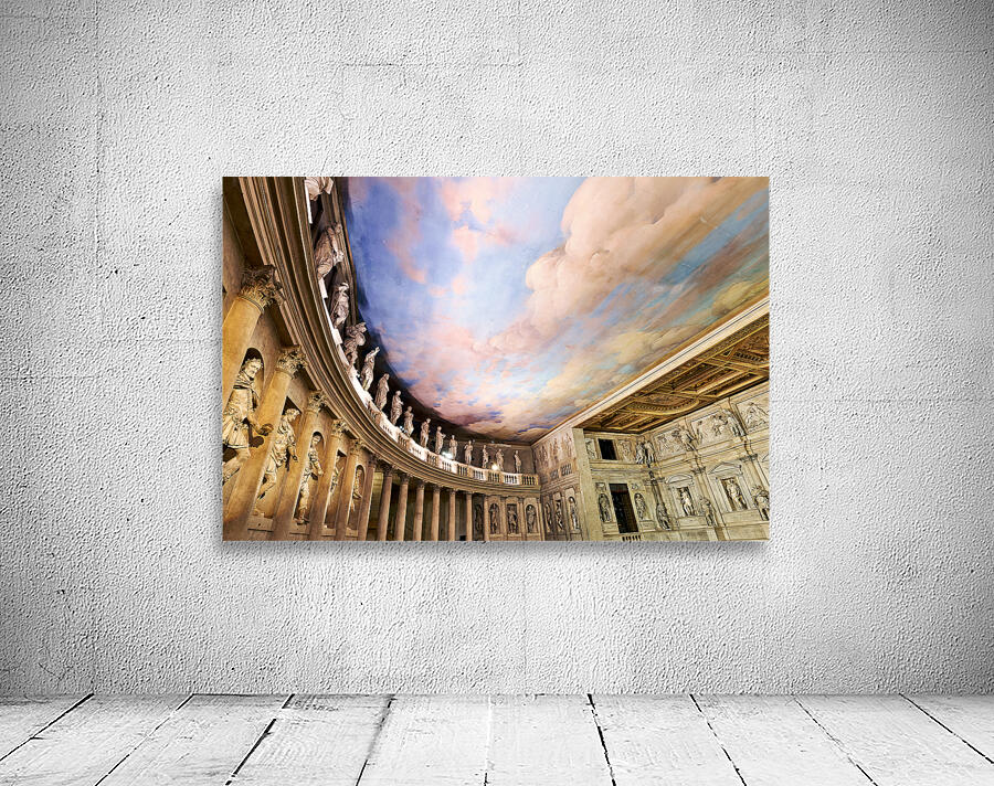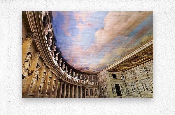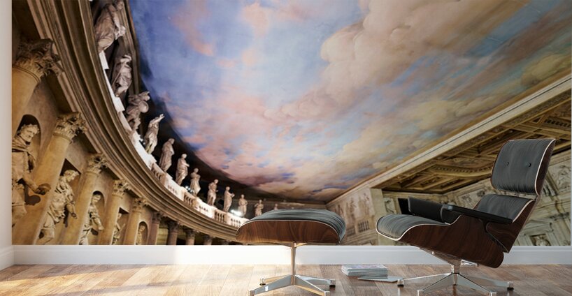 Visitors admire the detailed interiors of Teatro Olimpico in Vicenza Italy. The ornate design showcases sculptures and painted ceilings.