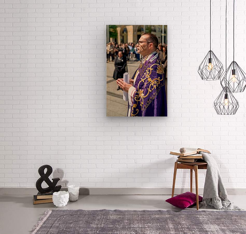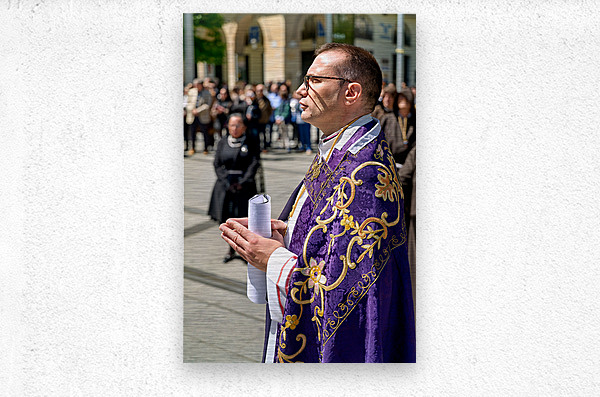 People gather in Zaragoza for the Easter Holy Week procession. A priest leads the ceremony in traditional attire as crowds watch.