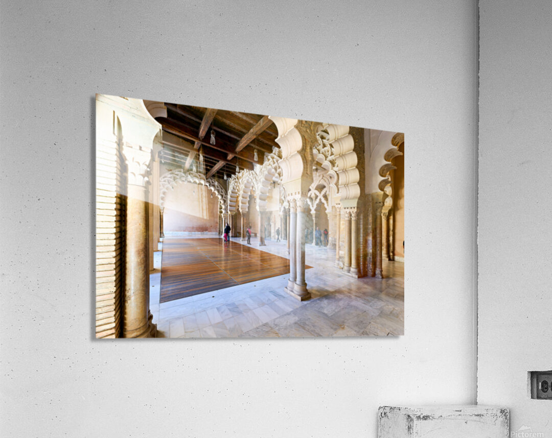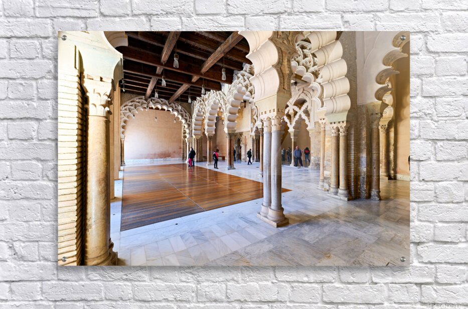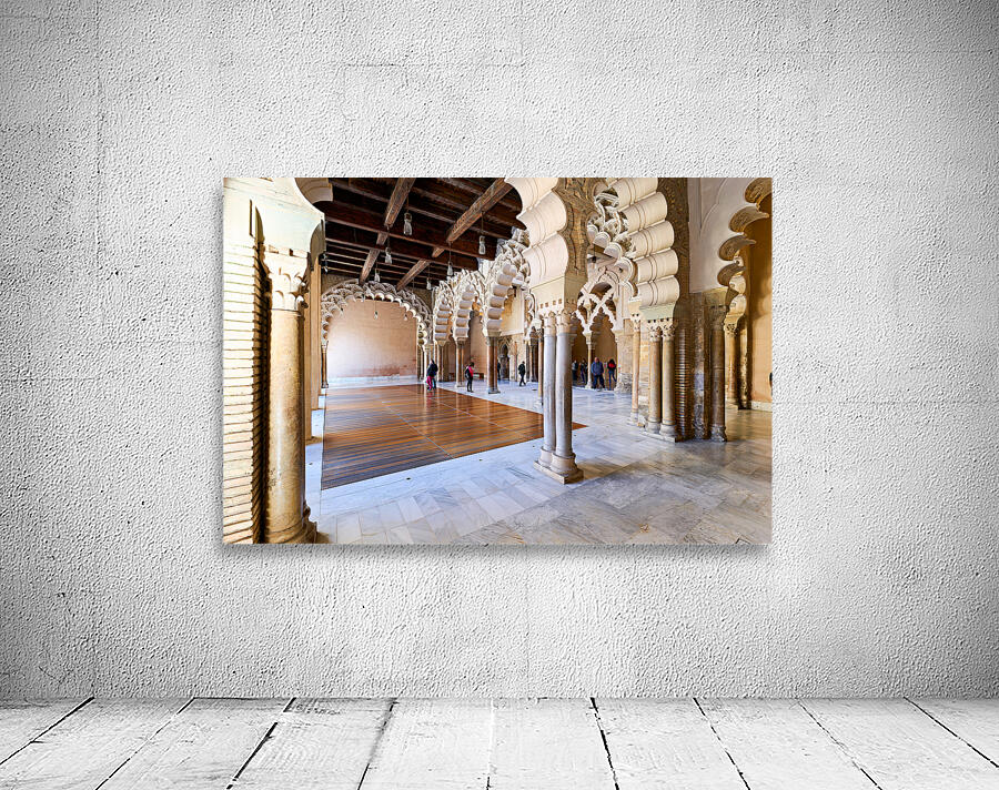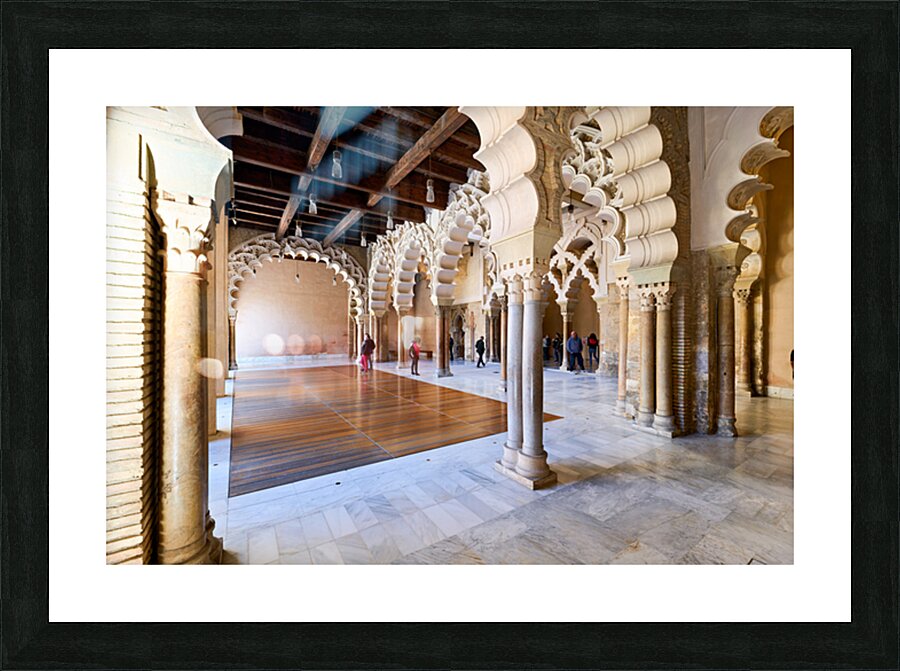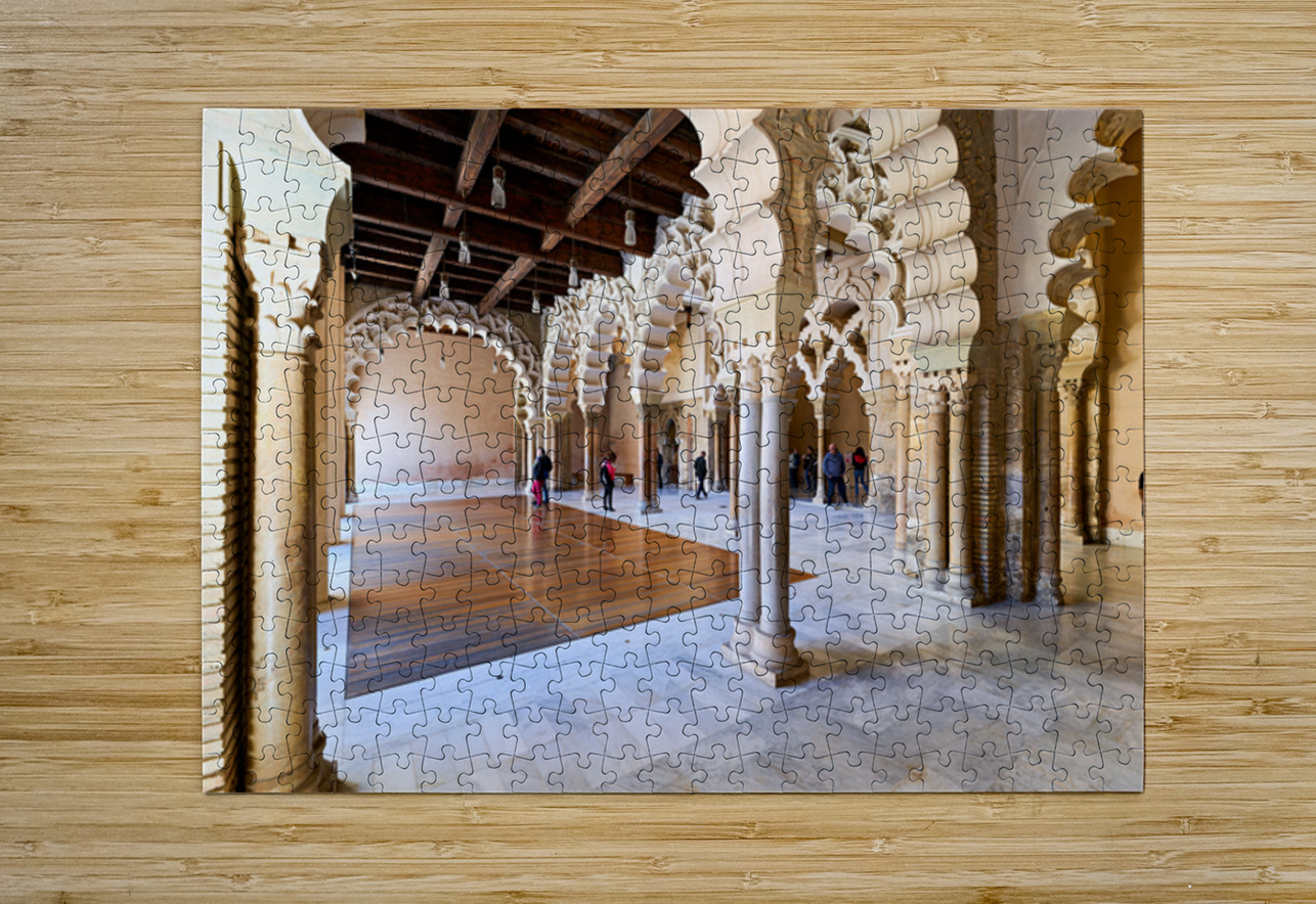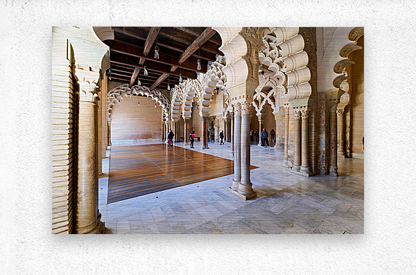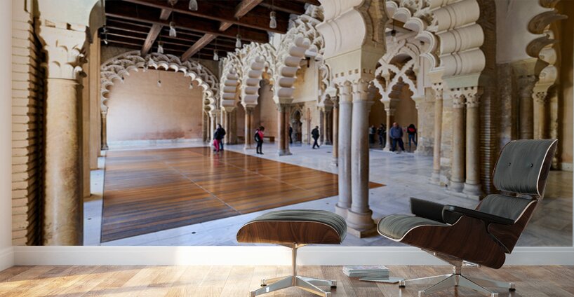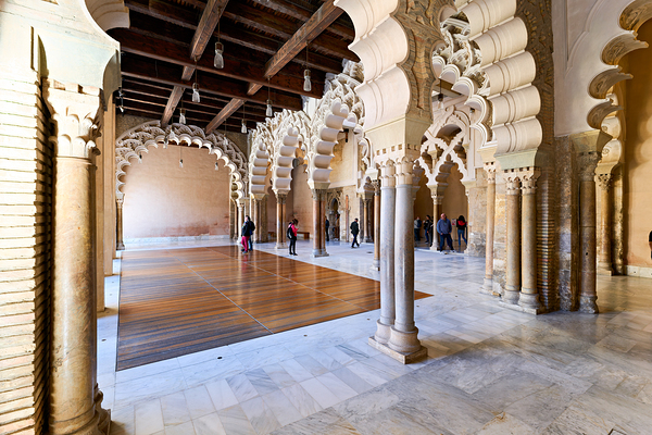 People walk through the interior of Aljafería Palace a historic site in Zaragoza Spain. The space features arches and stone columns.