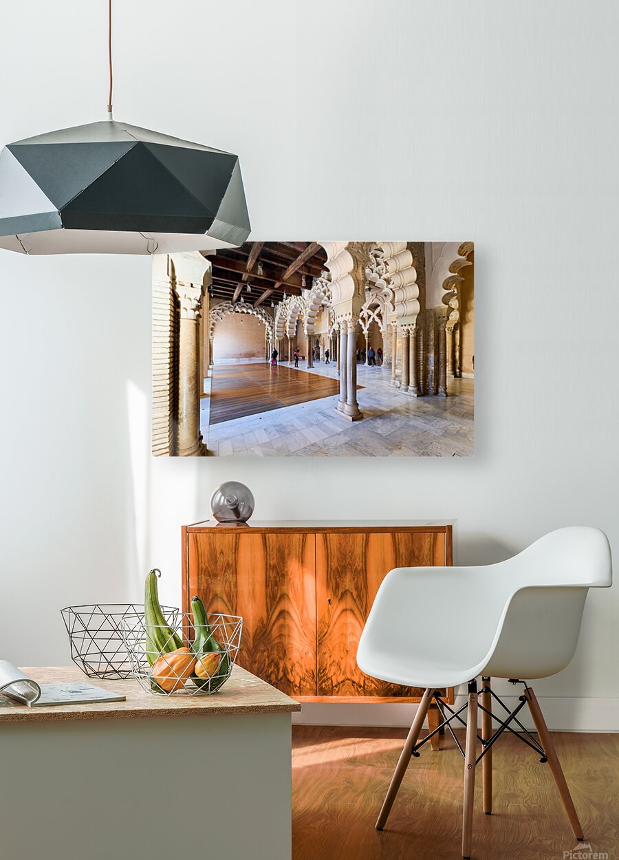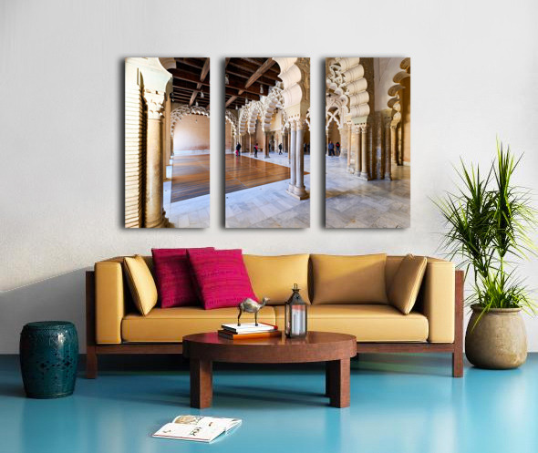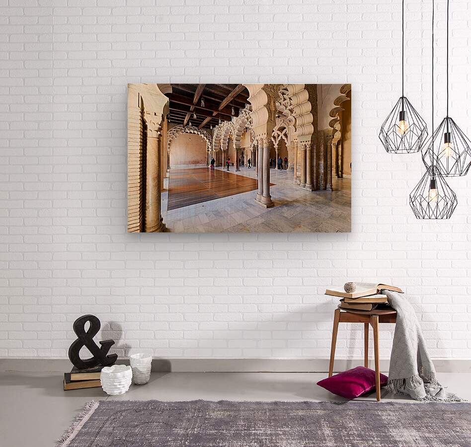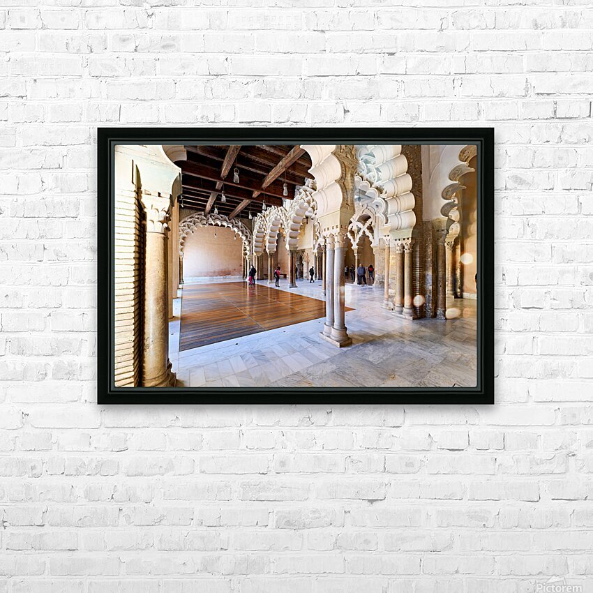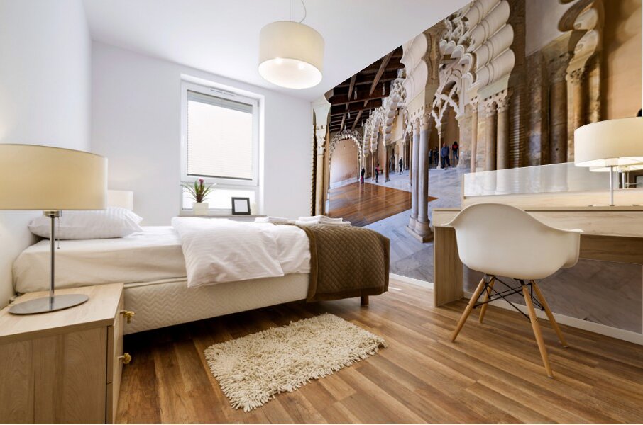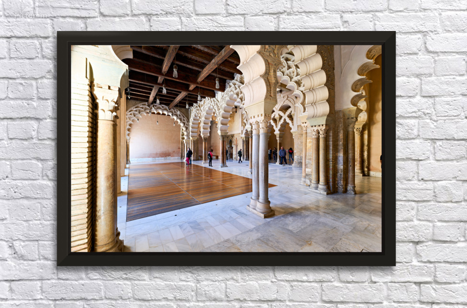 People walk through the interior of Aljafería Palace a historic site in Zaragoza Spain. The space features arches and stone columns.
