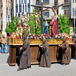 People gather in Zaragoza for the Easter processions. Participants carry a large float with religious figures on a busy street.