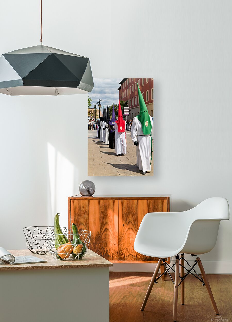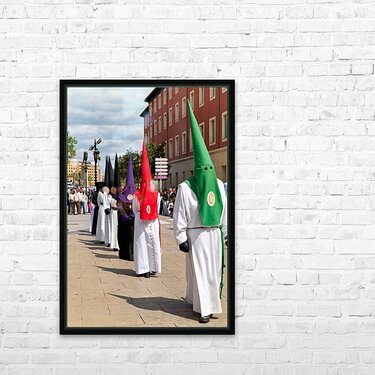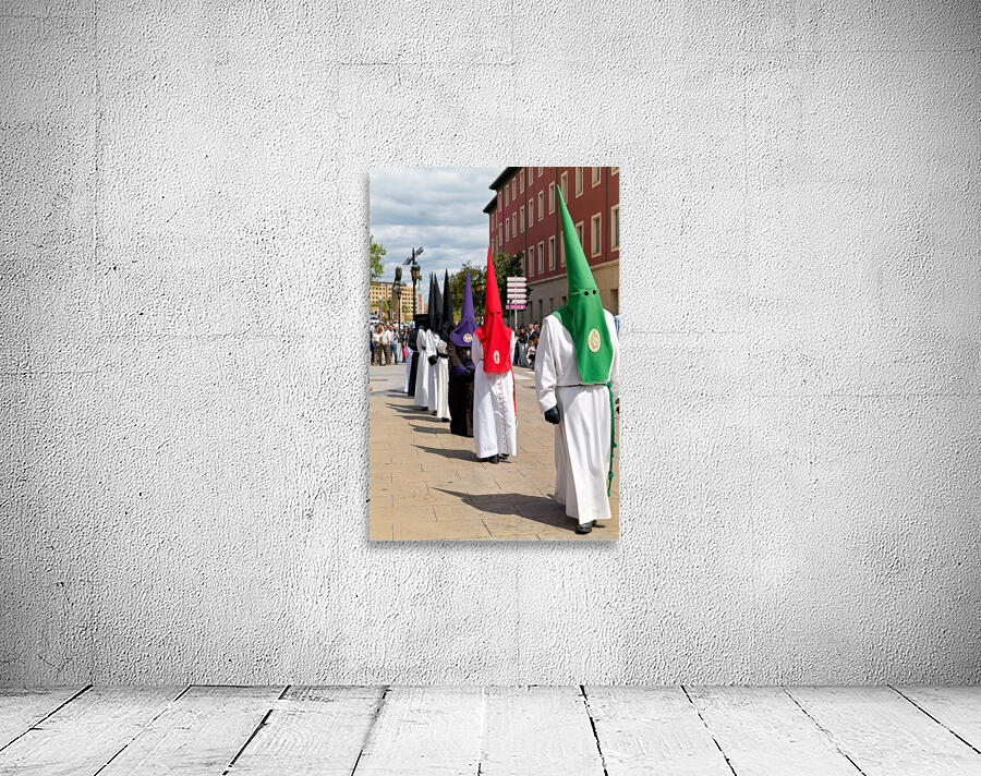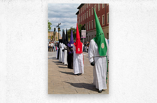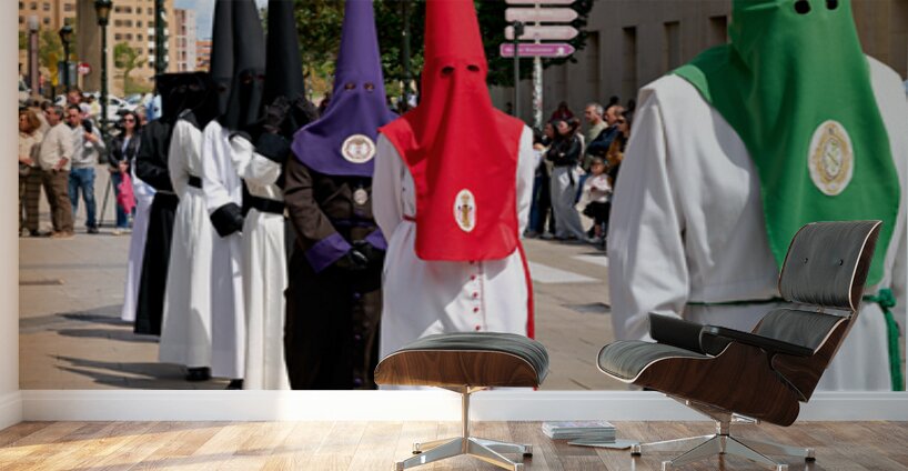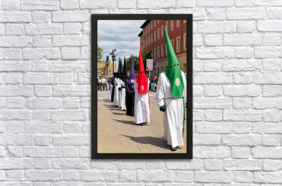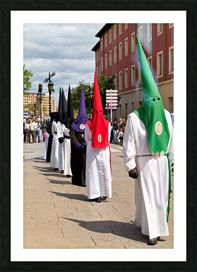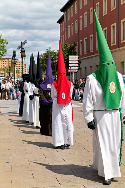 People participate in Easter Holy Week processions in Zaragoza Spain. Participants wear traditional robes and cone-shaped hats during this event.
