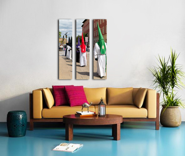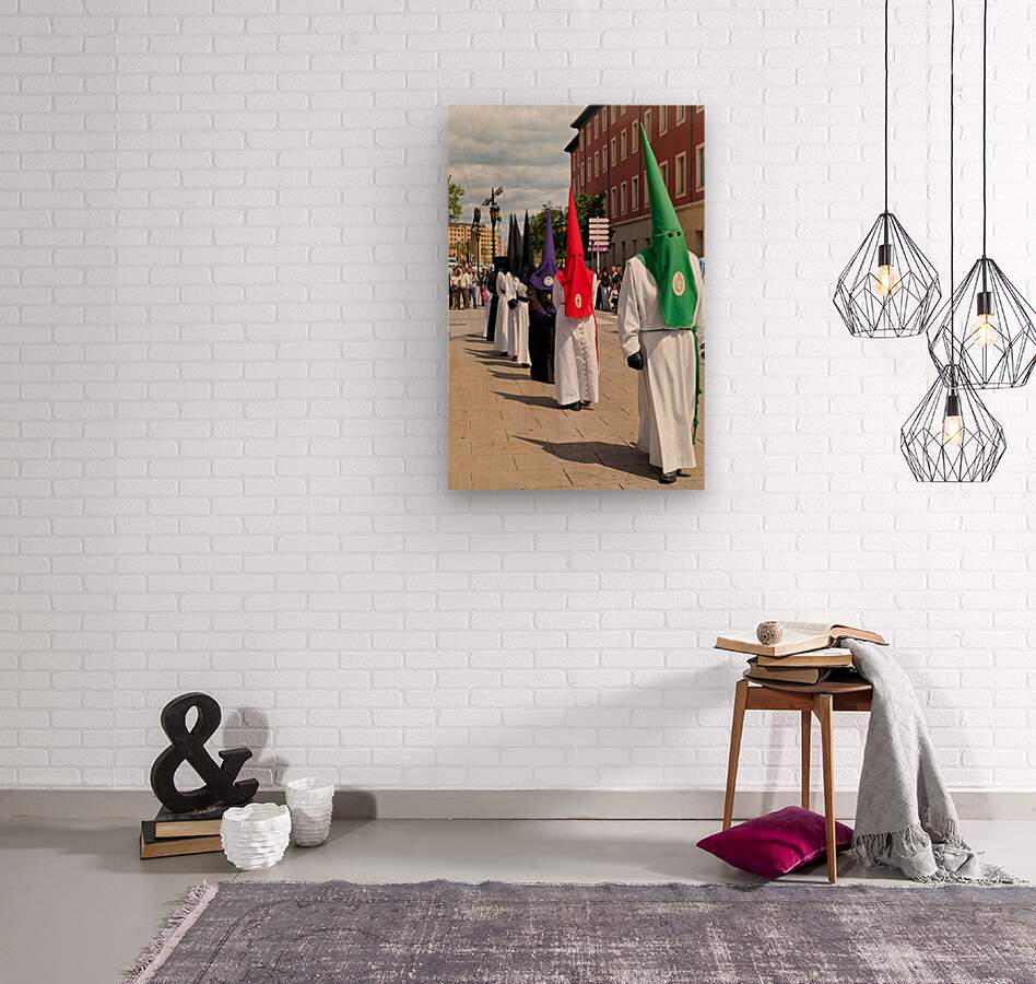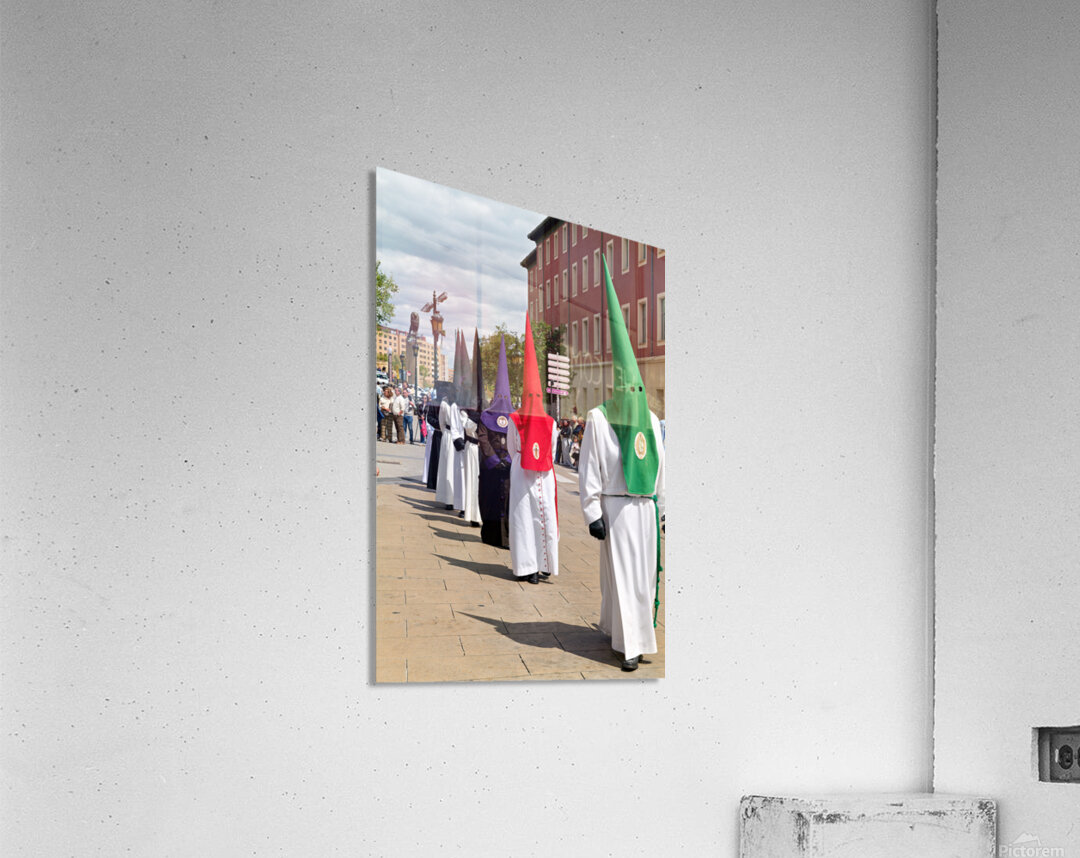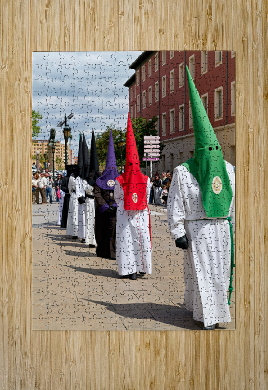 People participate in Easter Holy Week processions in Zaragoza Spain. Participants wear traditional robes and cone-shaped hats during this event.