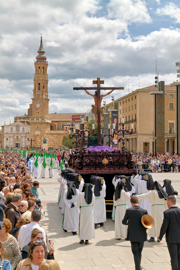 Crowds gather to watch a procession in Zaragoza during Easter Holy Week. Participants wear traditional clothing and carry religious symbols.