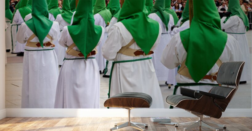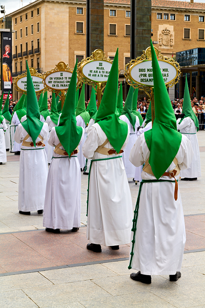 People participate in Easter Holy Week processions in Zaragoza. Participants wear traditional robes and pointed green hoods during the event.