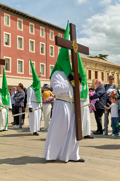 Participants wear traditional robes and hoods while carrying a cross in the Zaragoza Easter processions. The event draws many spectators.