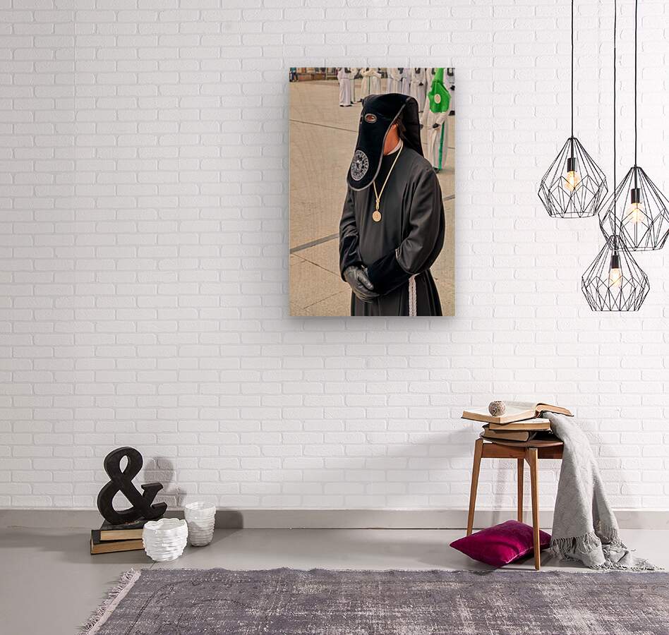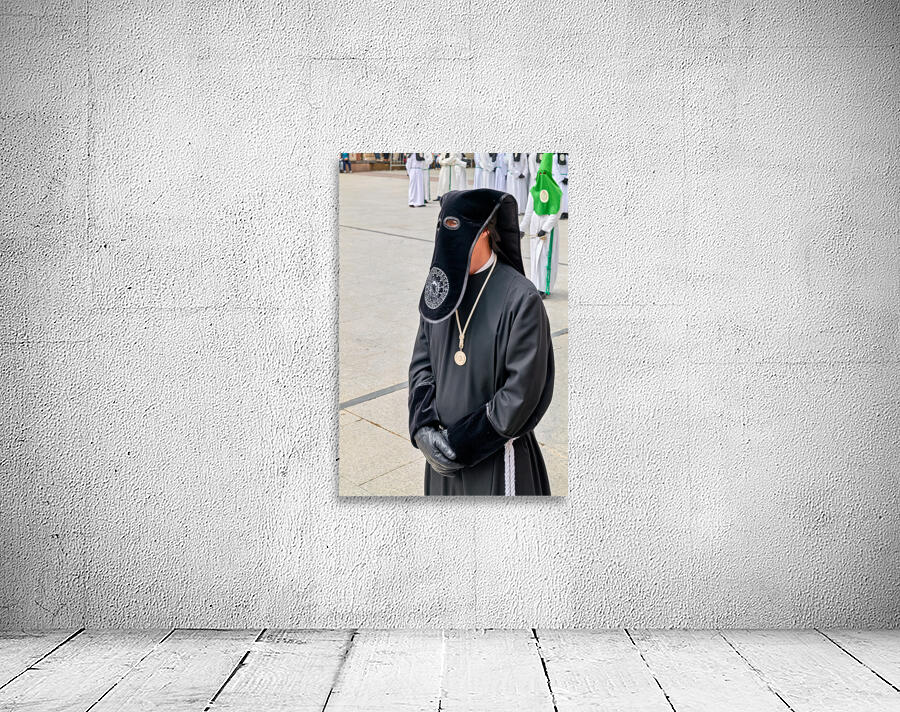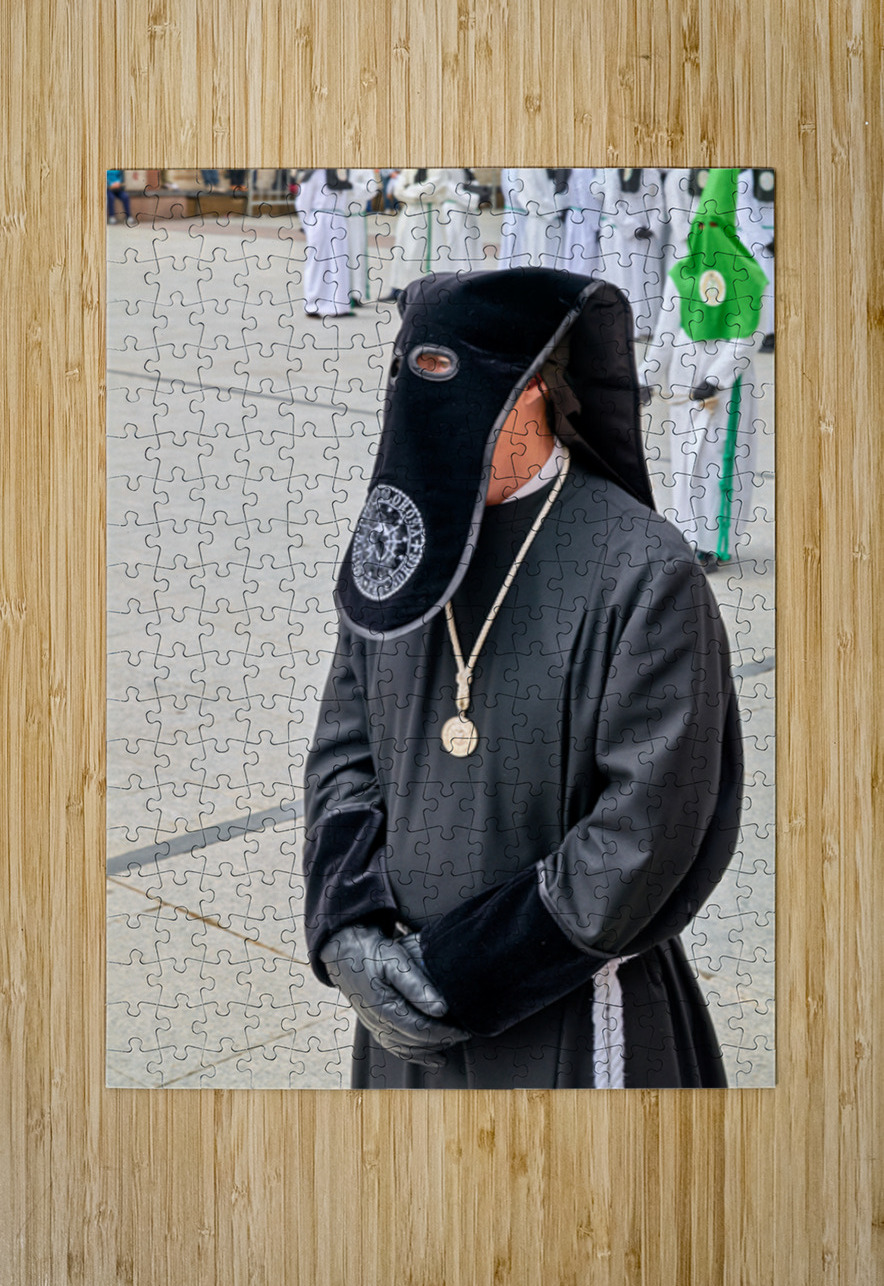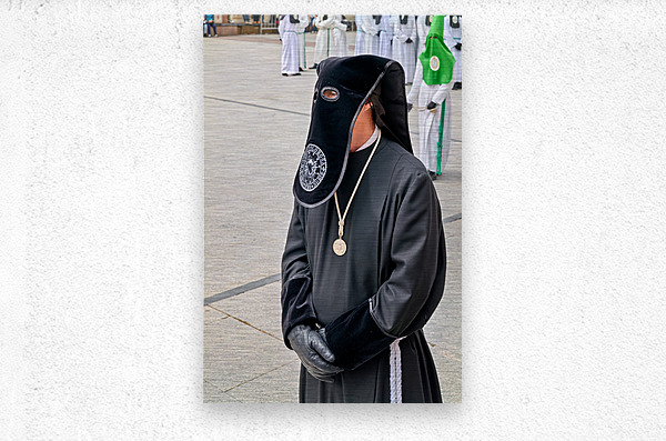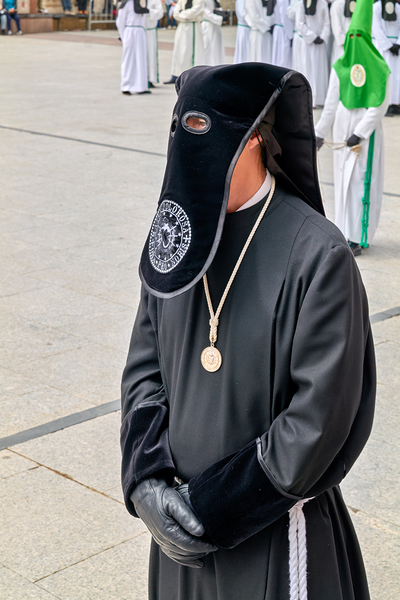 Participants dressed in black robes and hoods stand silently during the Easter processions in Zaragoza Spain marking this important religious event.