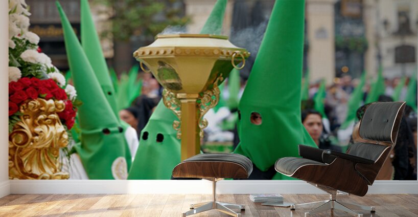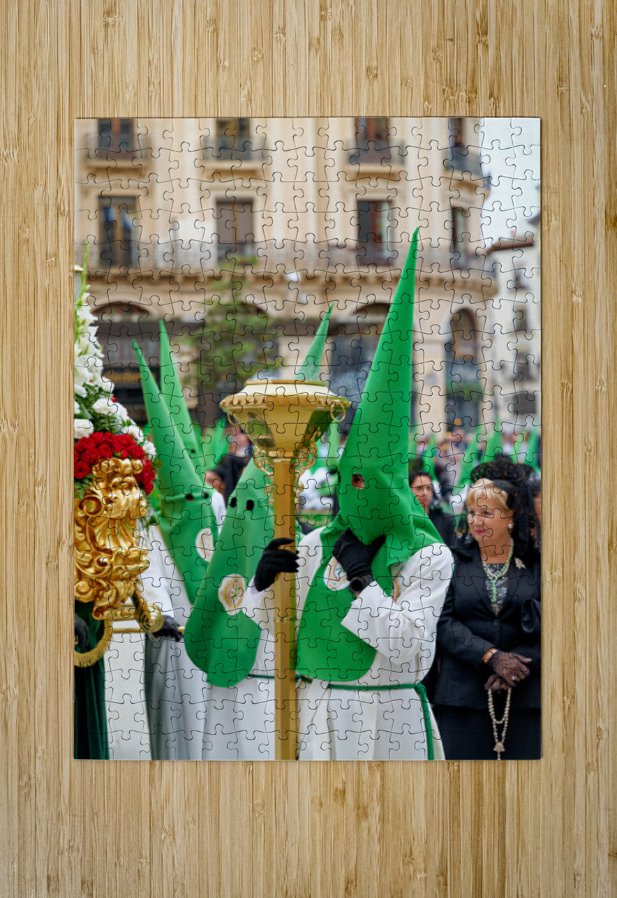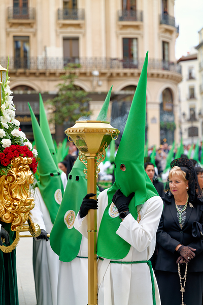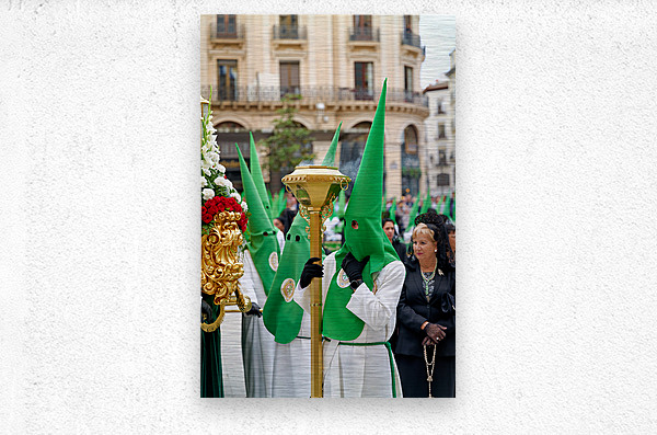 People take part in the Easter processions in Zaragoza. Participants wear green robes and pointy hats while carrying items.