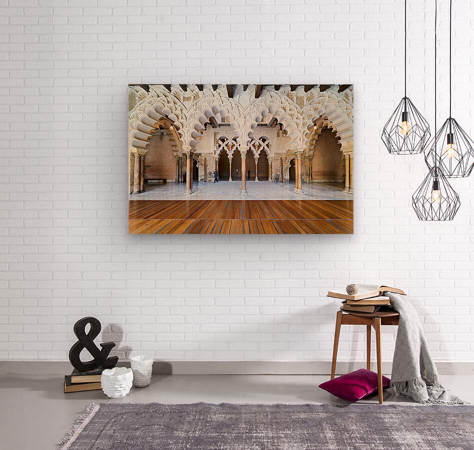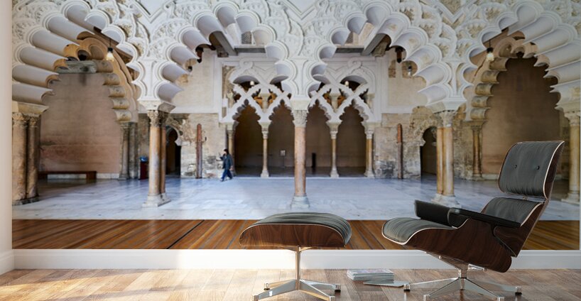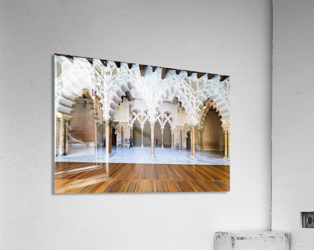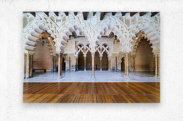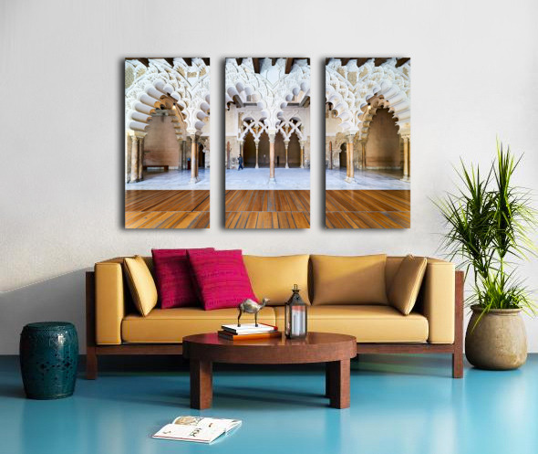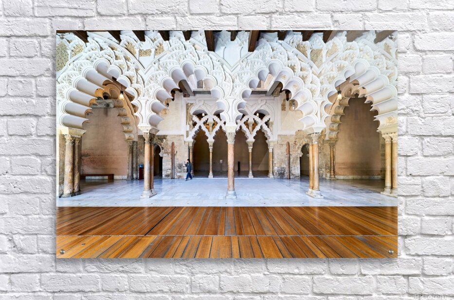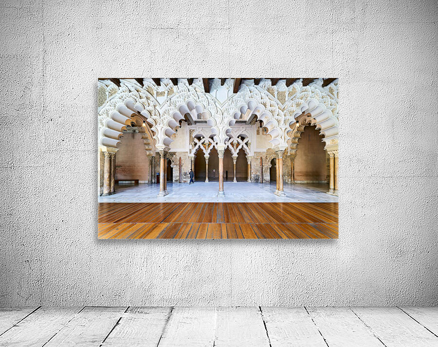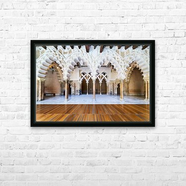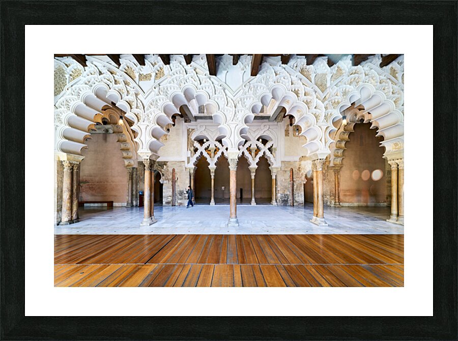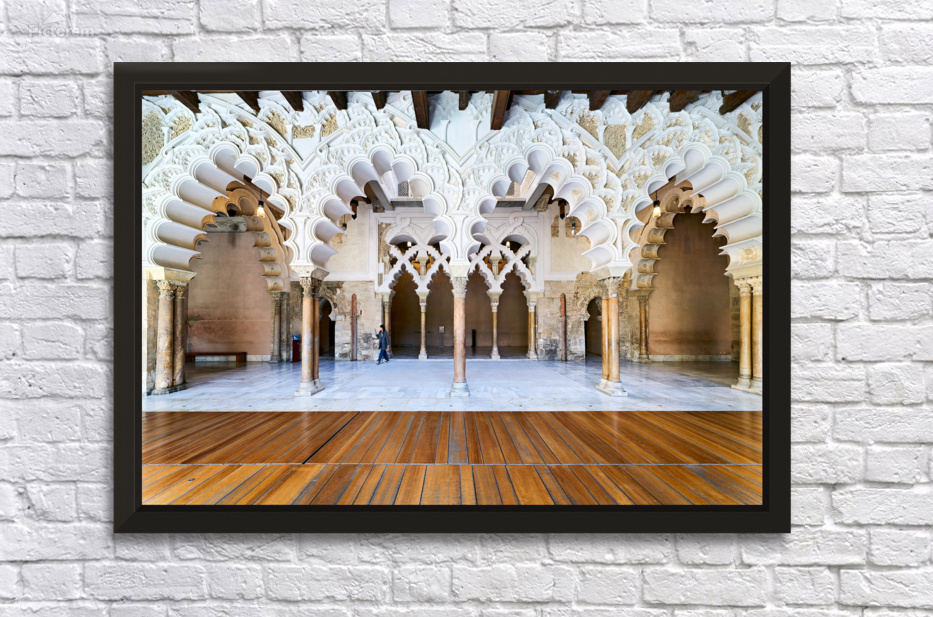"Intricate arches in Aljaferia Palace in Zaragoza" in a framed print.