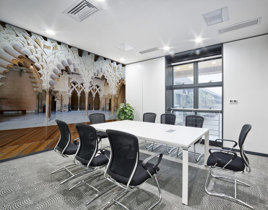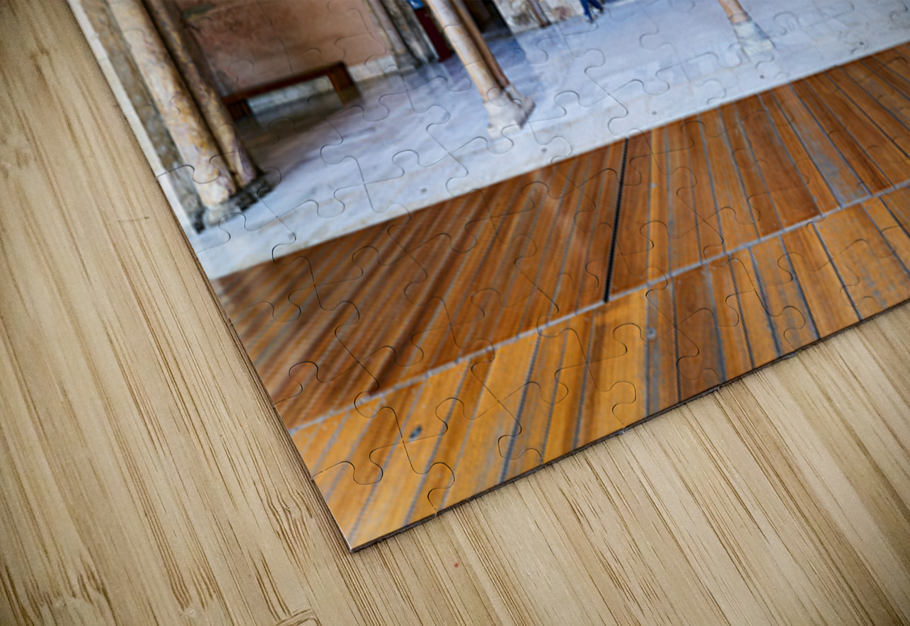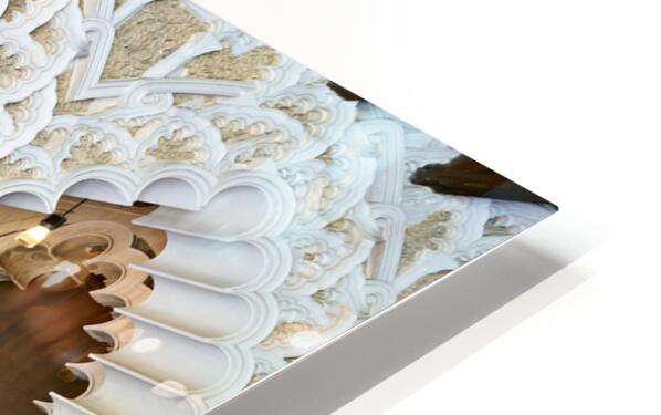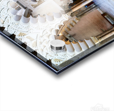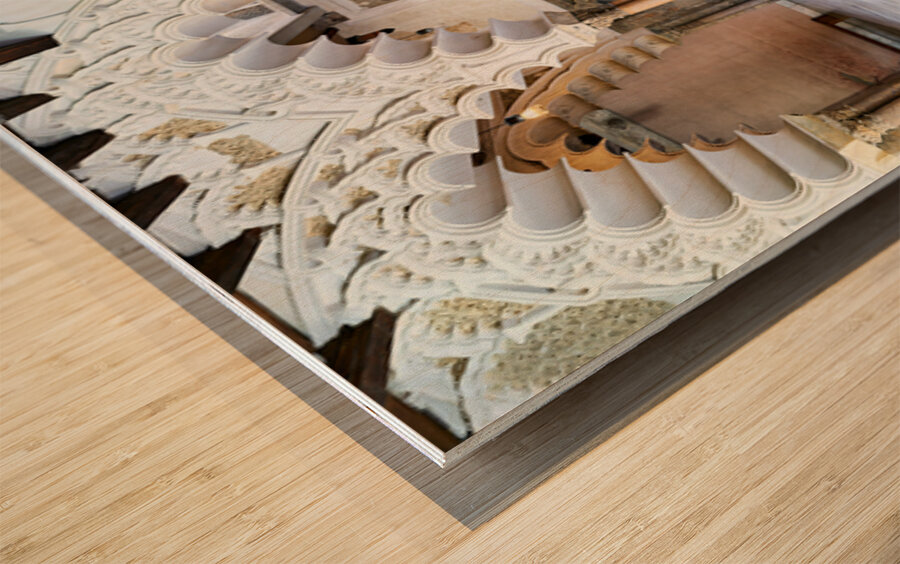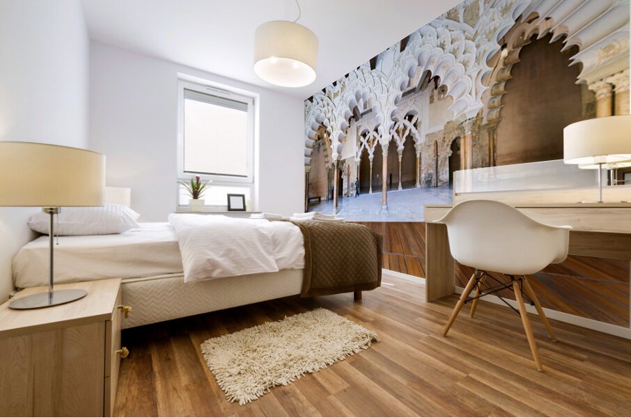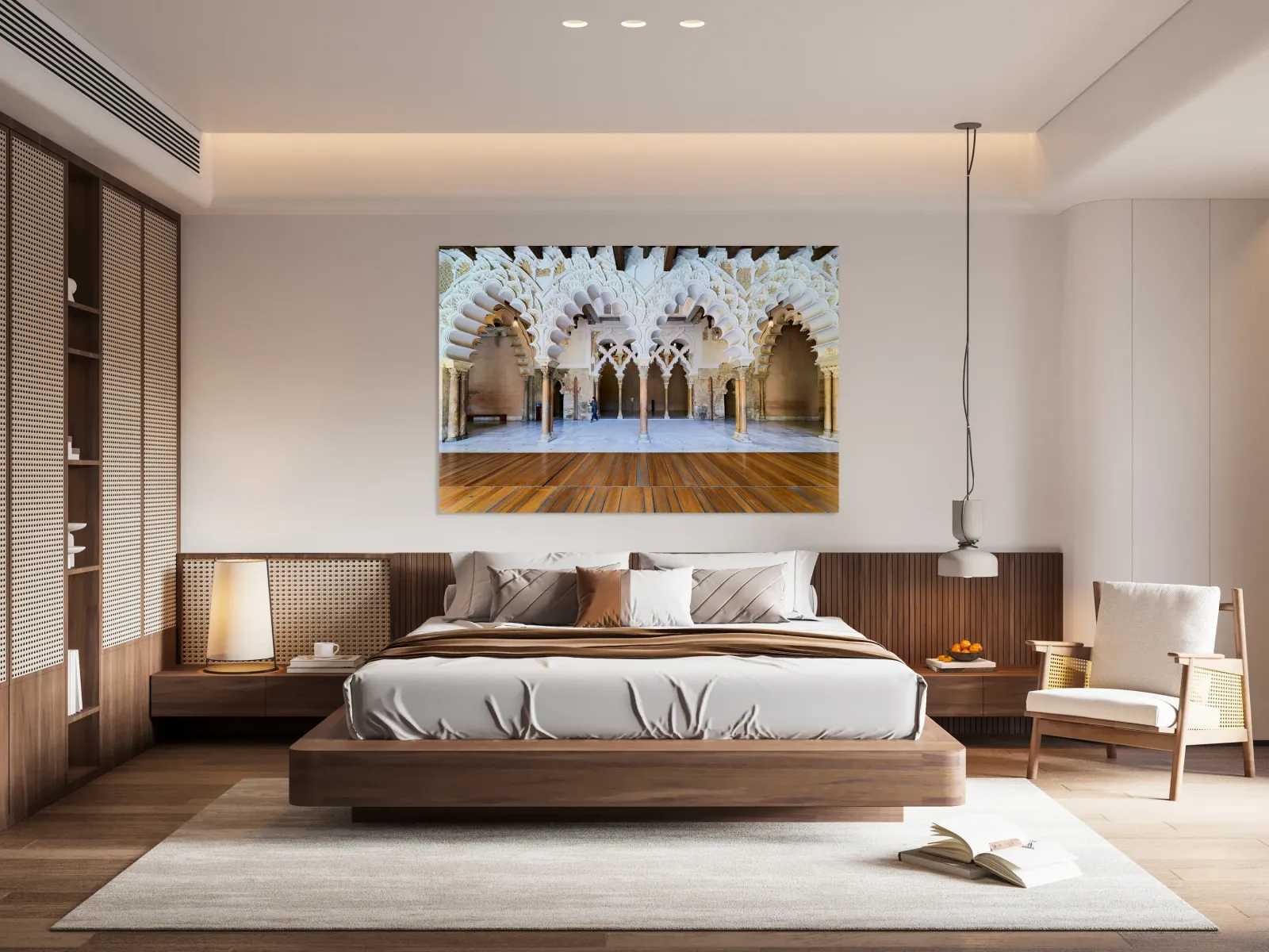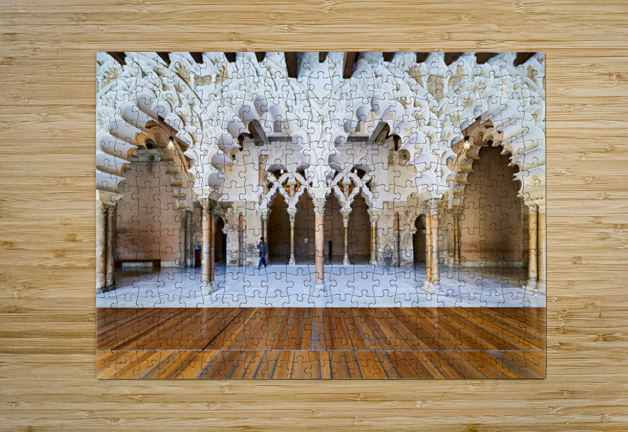 "Intricate arches in Aljaferia Palace in Zaragoza" in a framed print.