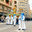 People gather to watch the Easter Holy Week processions in Zaragoza Aragon. Participants in robes carry a float down the street.