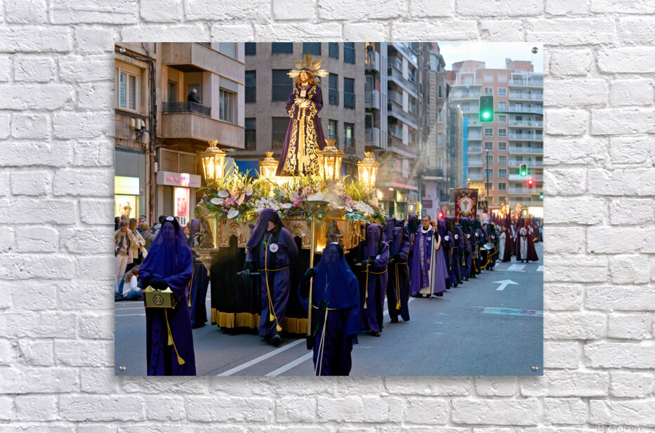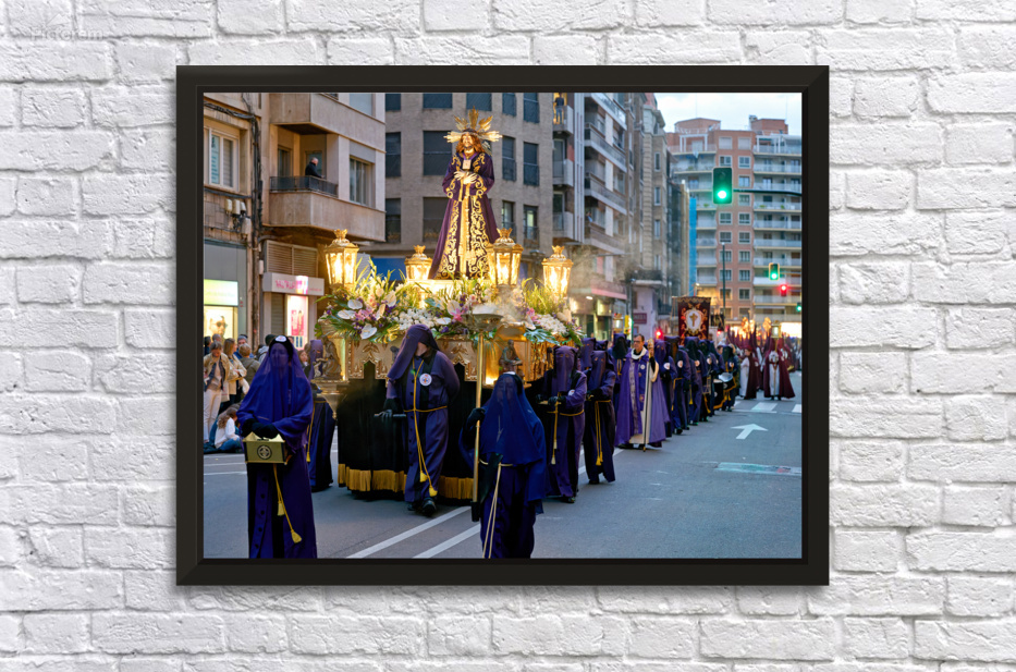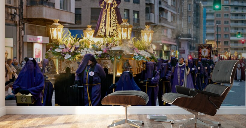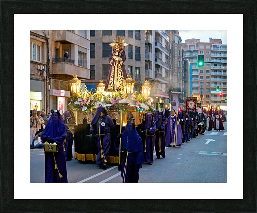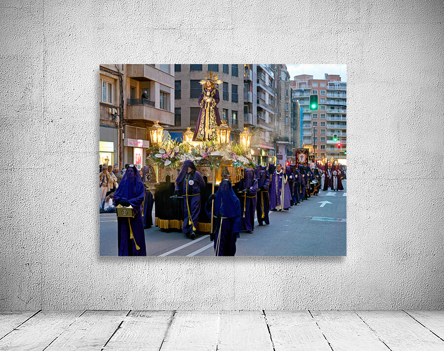 People walk along the street in Zaragoza during the Easter Holy Week procession. They carry religious statues and wear traditional robes.