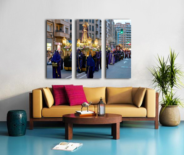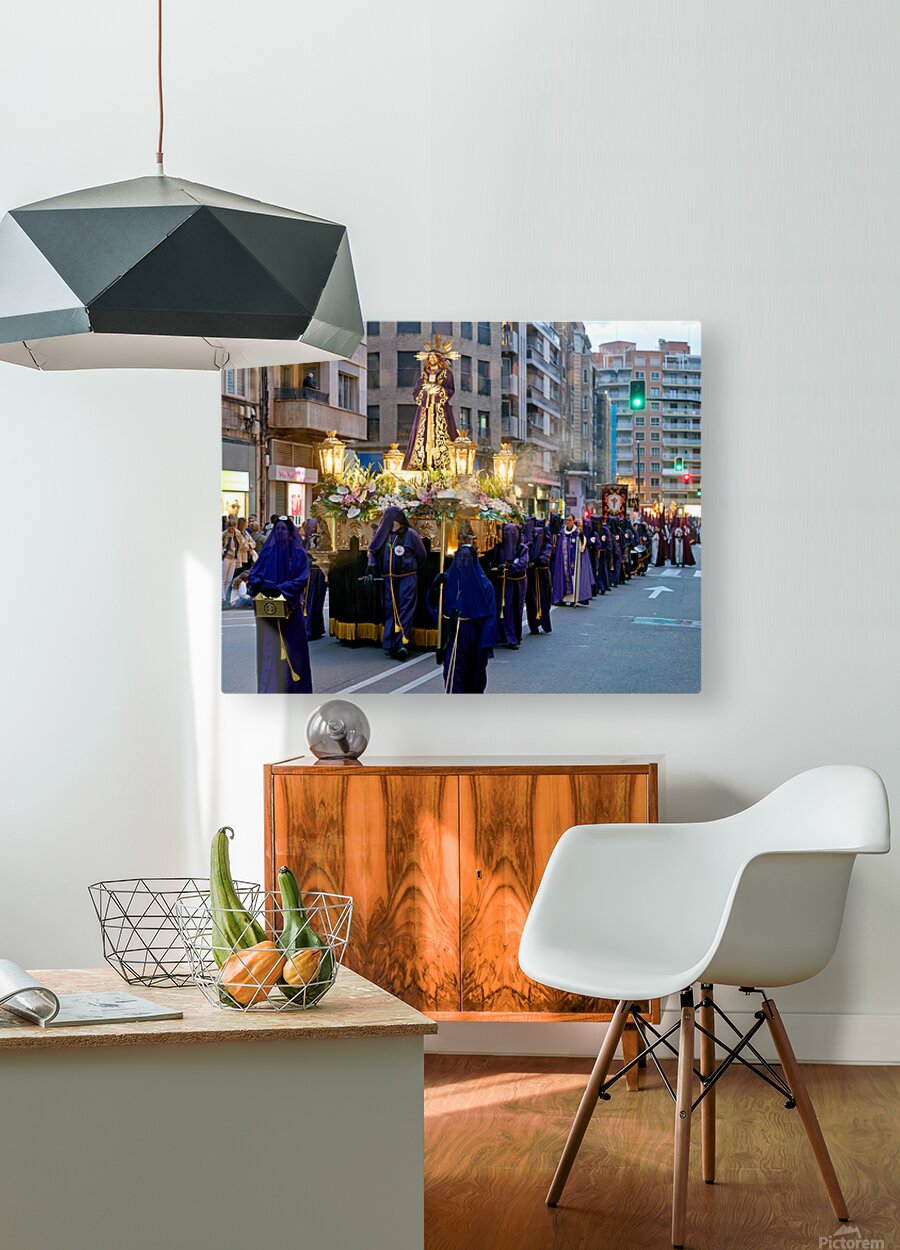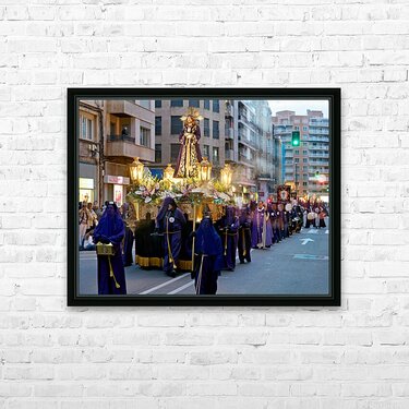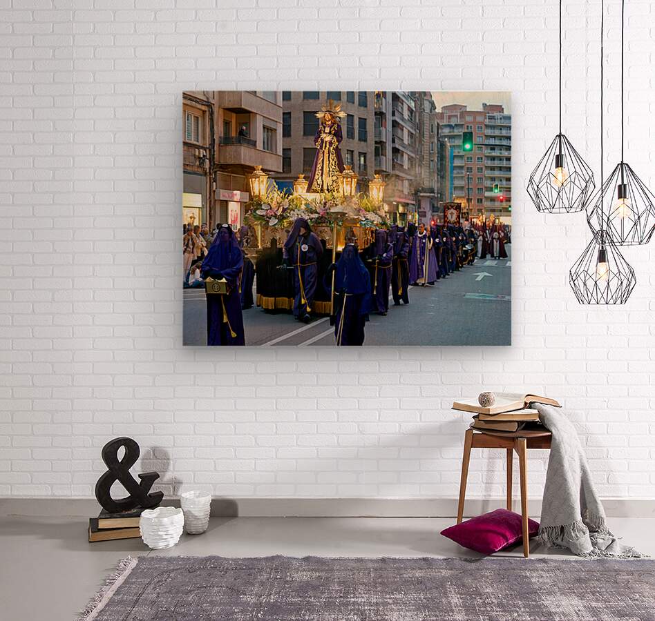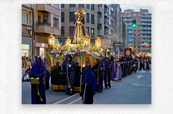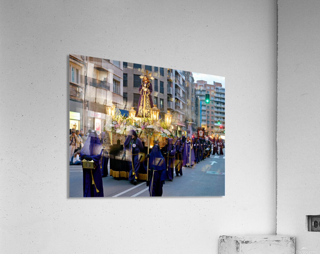 People walk along the street in Zaragoza during the Easter Holy Week procession. They carry religious statues and wear traditional robes.