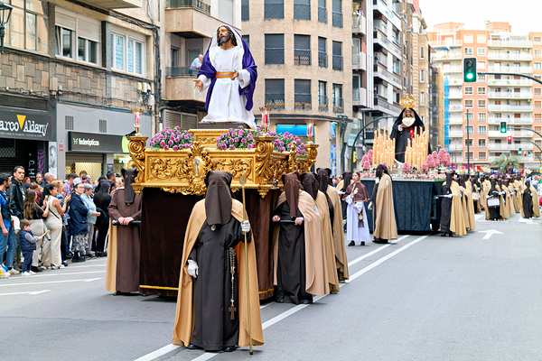 People walk along the street in Zaragoza during Easter processions. They carry large religious floats and wear traditional robes.