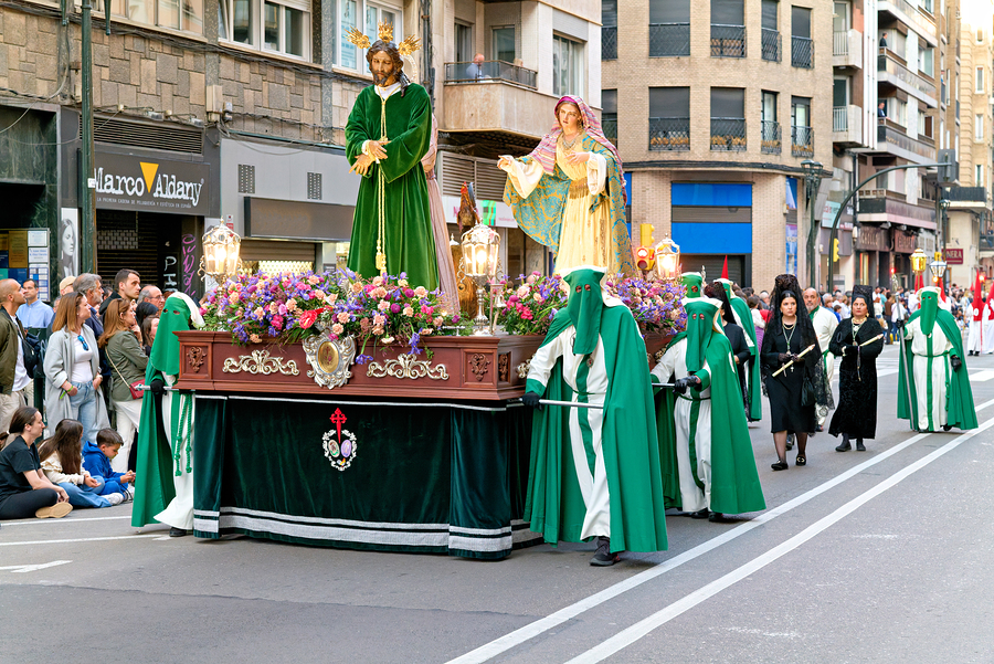 People gather on the street to watch a procession in Zaragoza during the Easter Holy Week. Participants carry large figures on a platform.