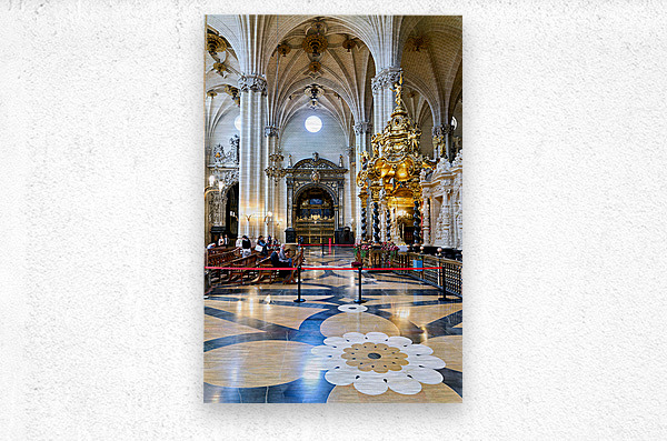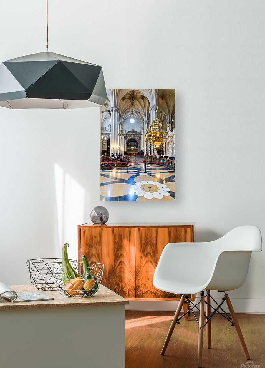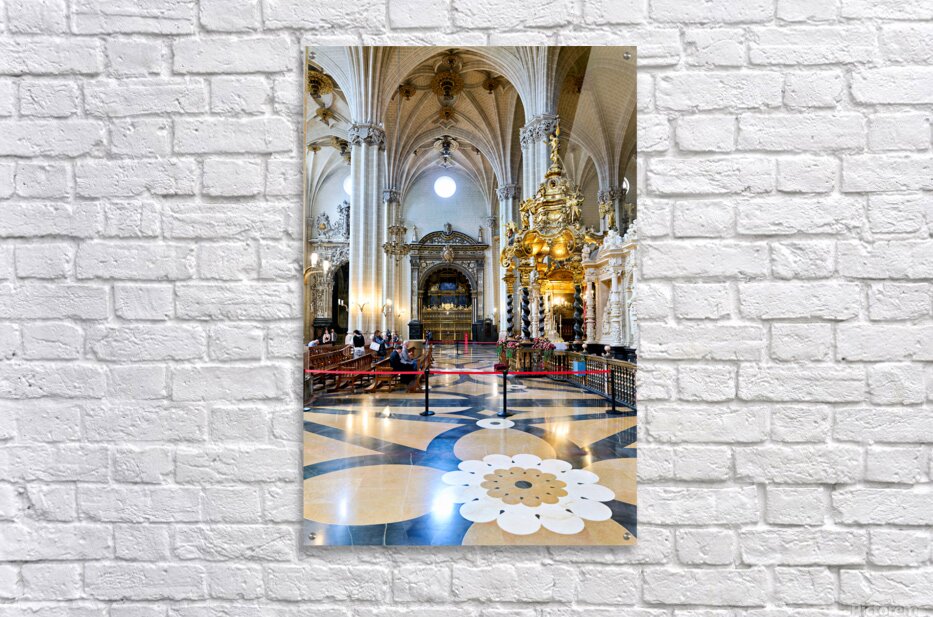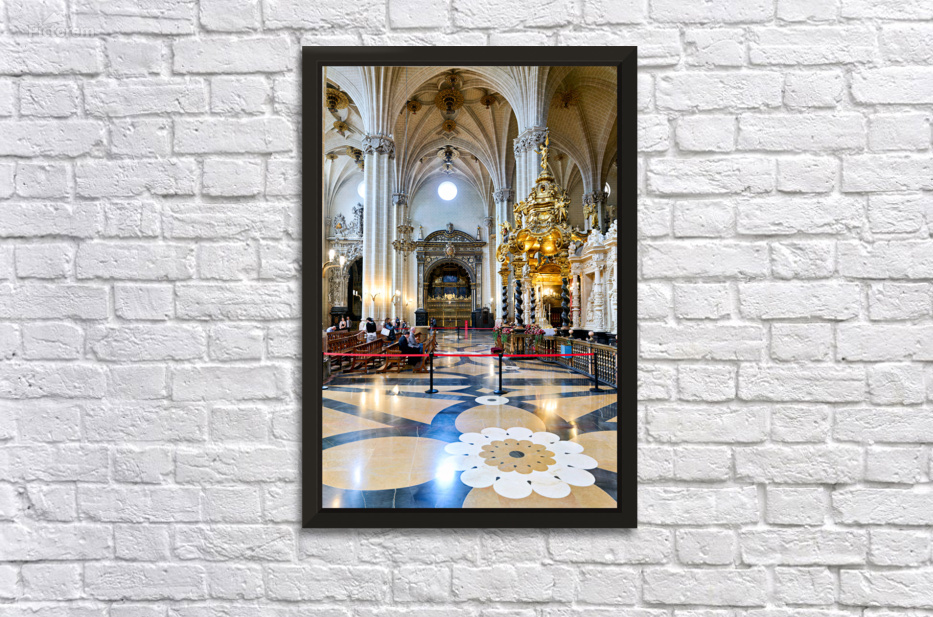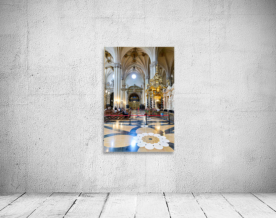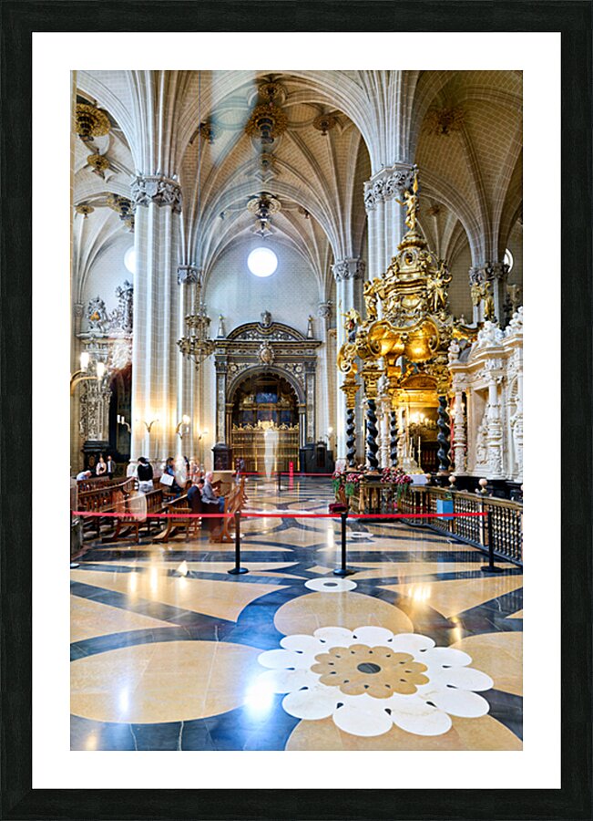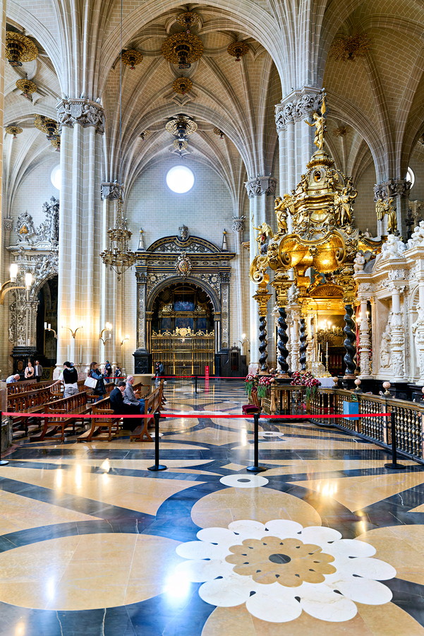 People view the detailed interior while others sit in calm areas of the Cathedral of the Savior in Zaragoza during a visit.