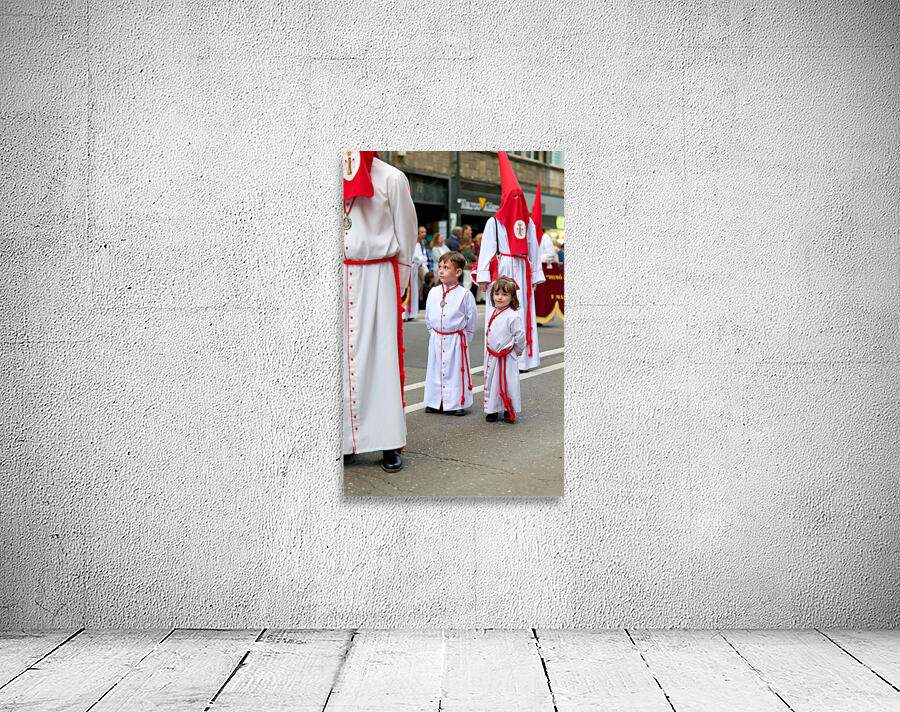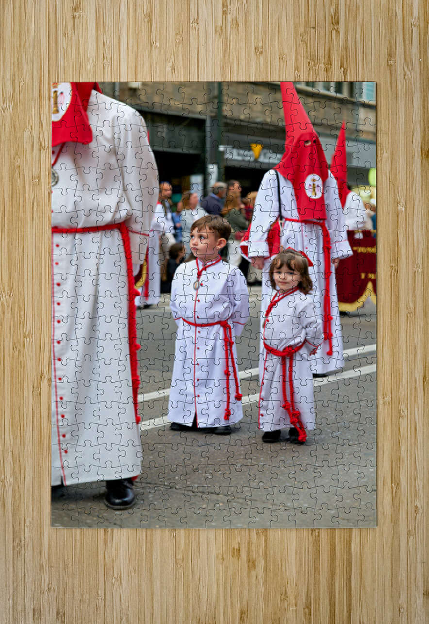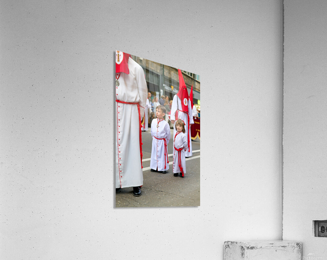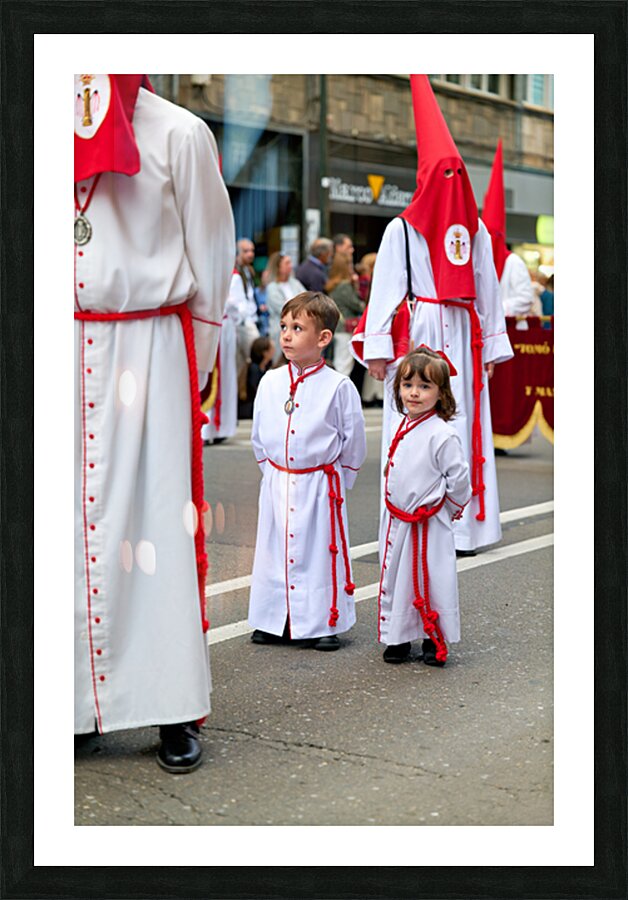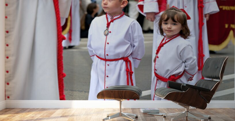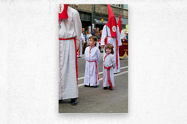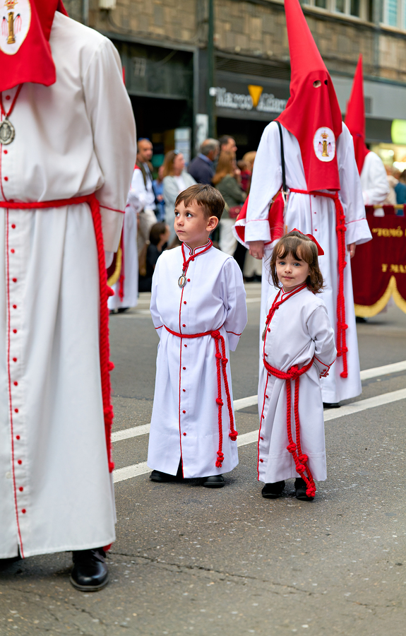 Children dressed in traditional attire walk in the streets of Zaragoza during the Easter Holy Week processions. People watch the event.