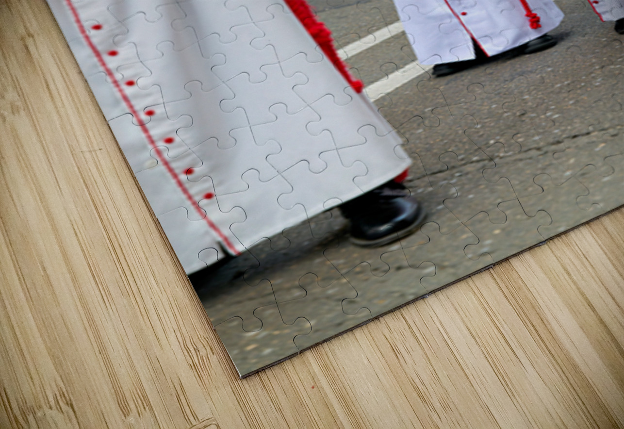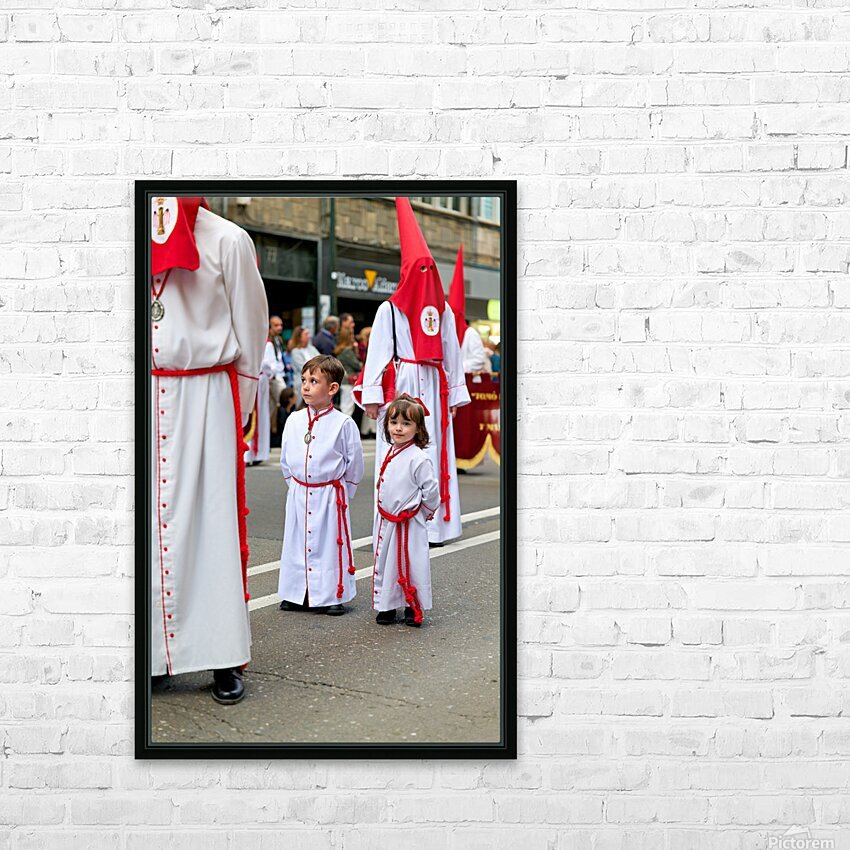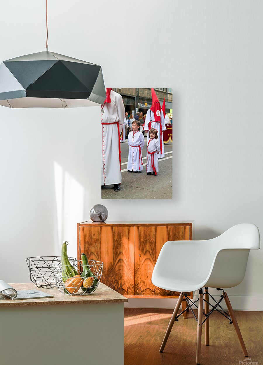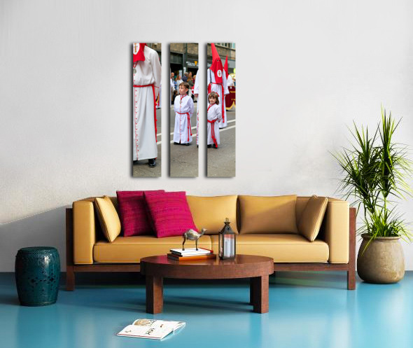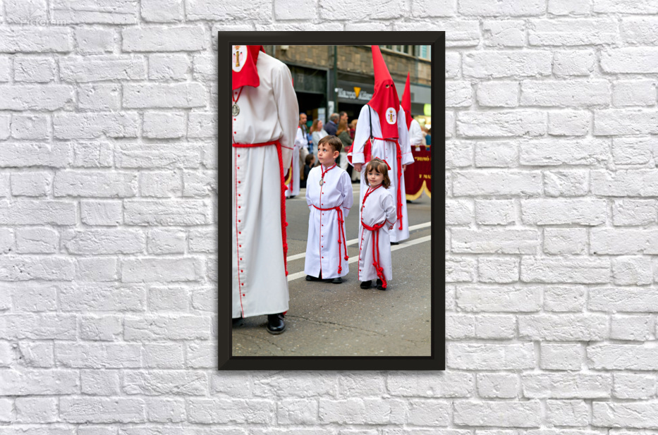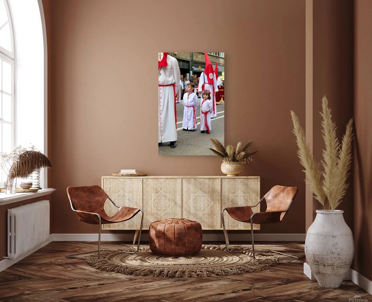 Children dressed in traditional attire walk in the streets of Zaragoza during the Easter Holy Week processions. People watch the event.