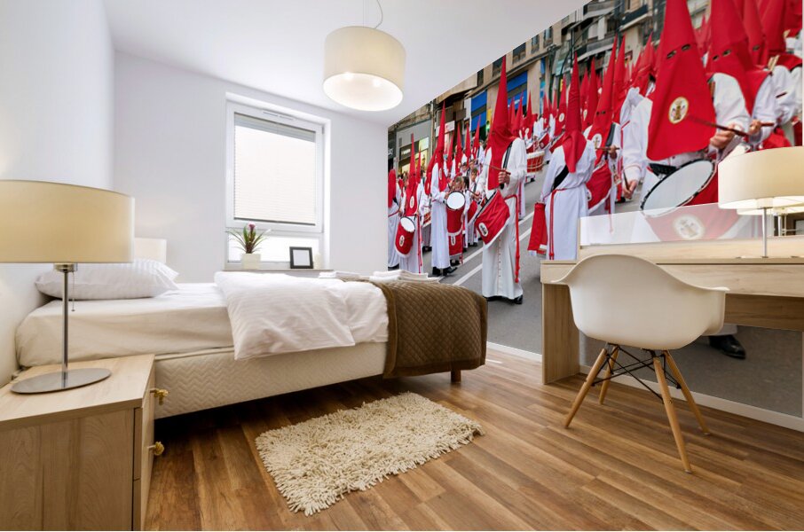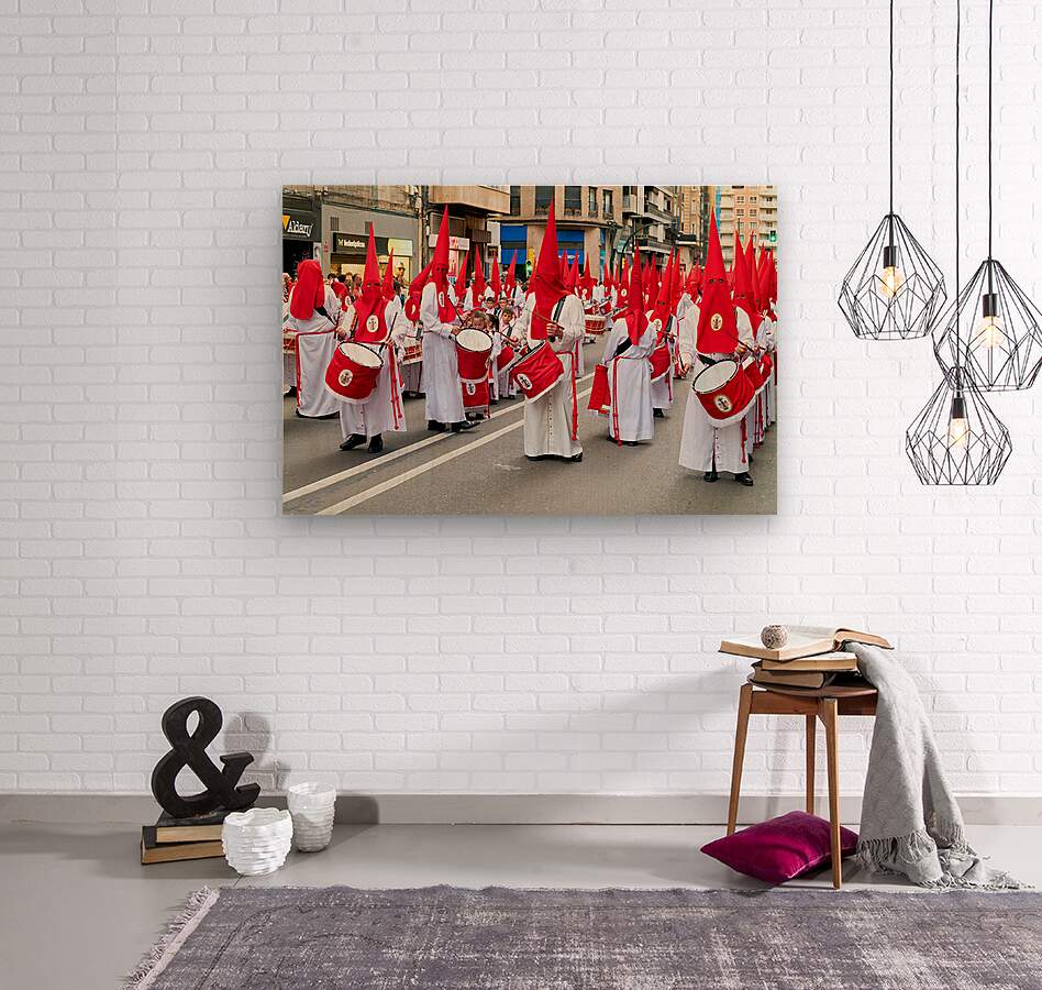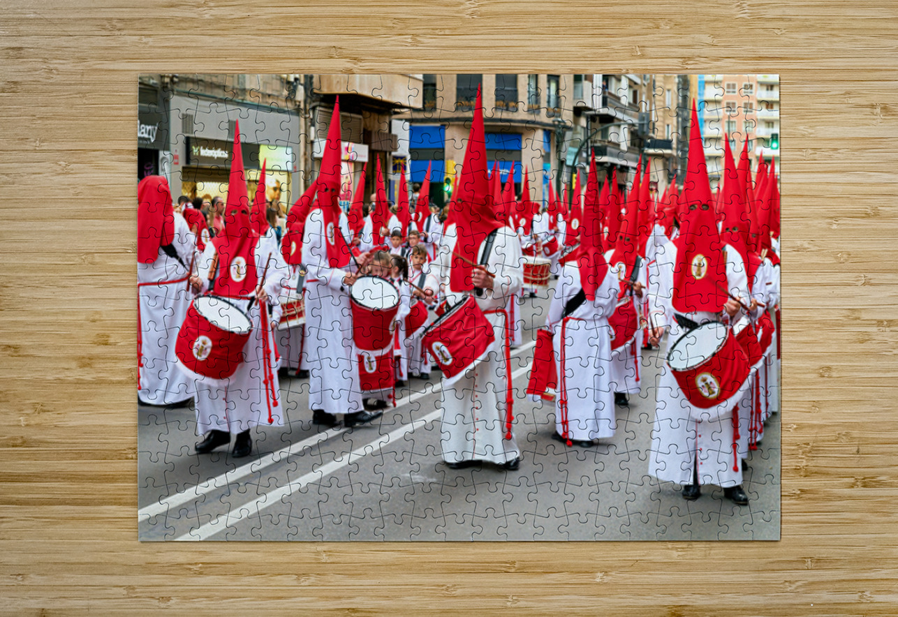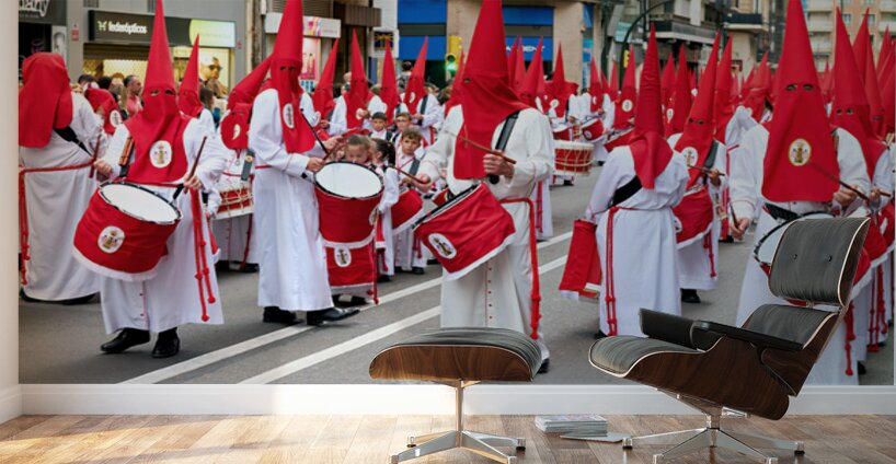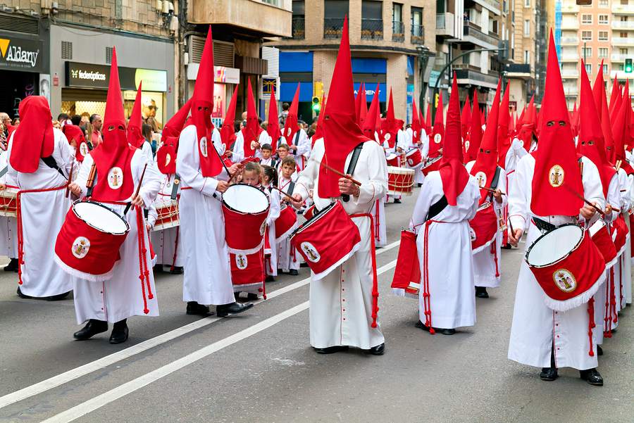 People participate in processions during Easter Holy Week in Zaragoza. They wear red outfits and carry drums as they march through the streets.