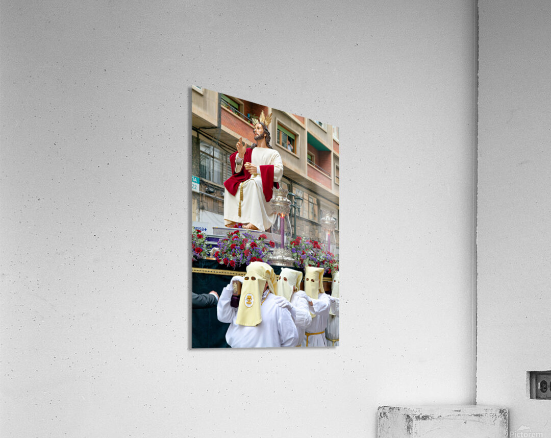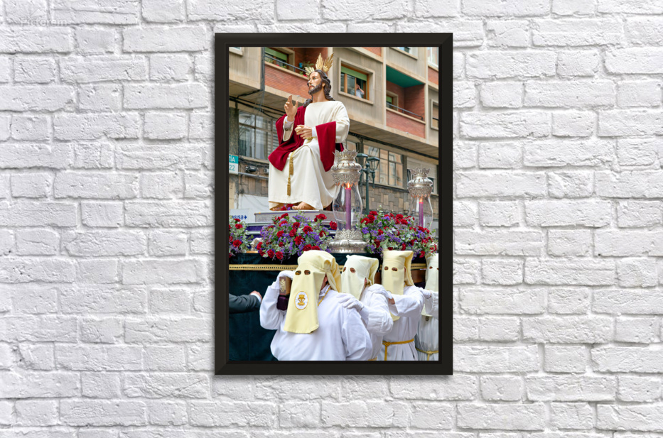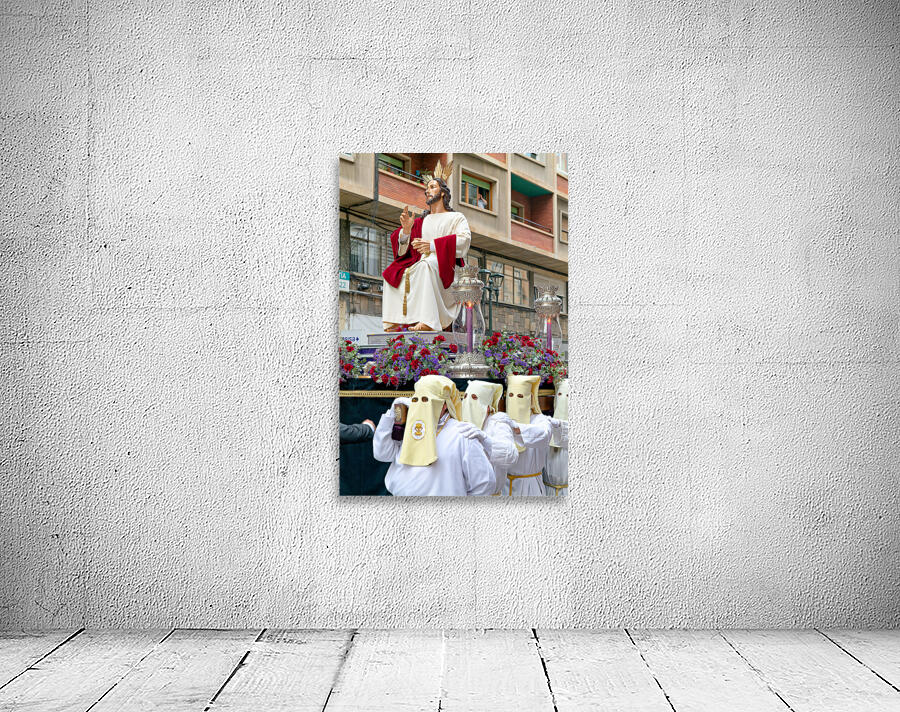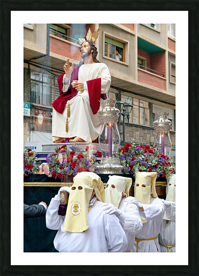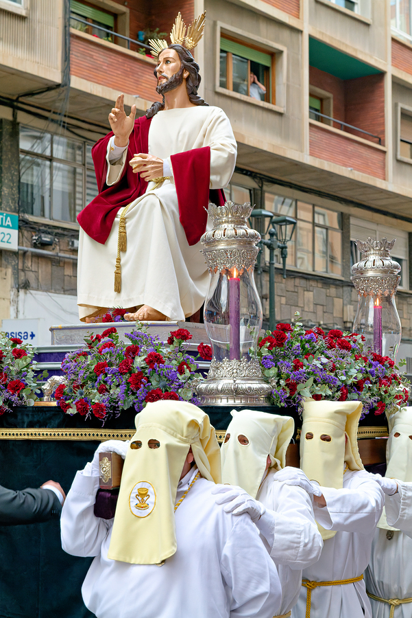 People carry a large statue during Easter Holy Week processions in Zaragoza Spain. The event features traditional robes and religious symbols.