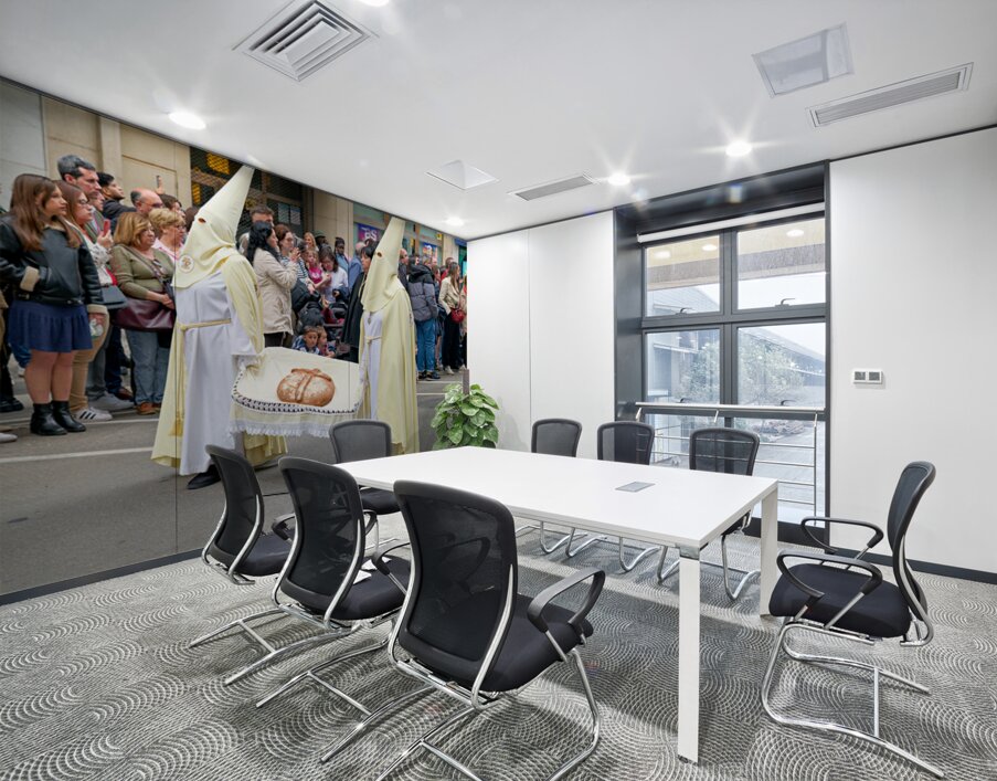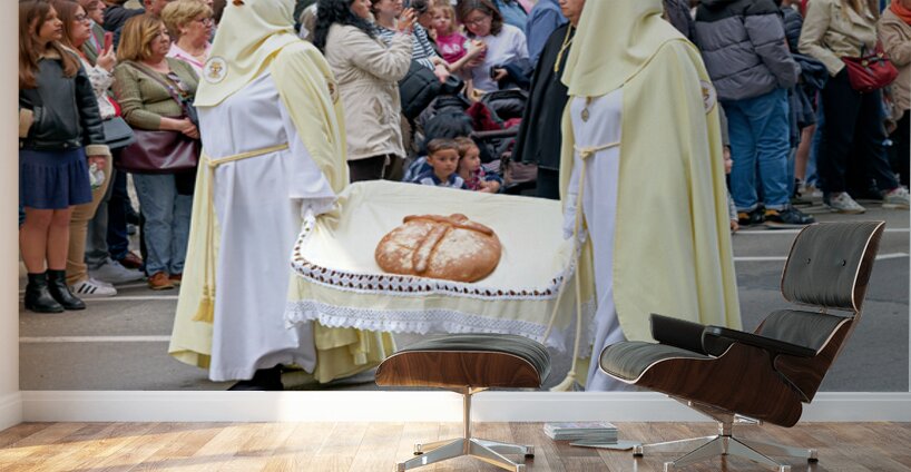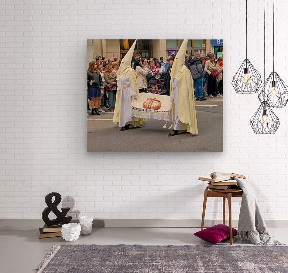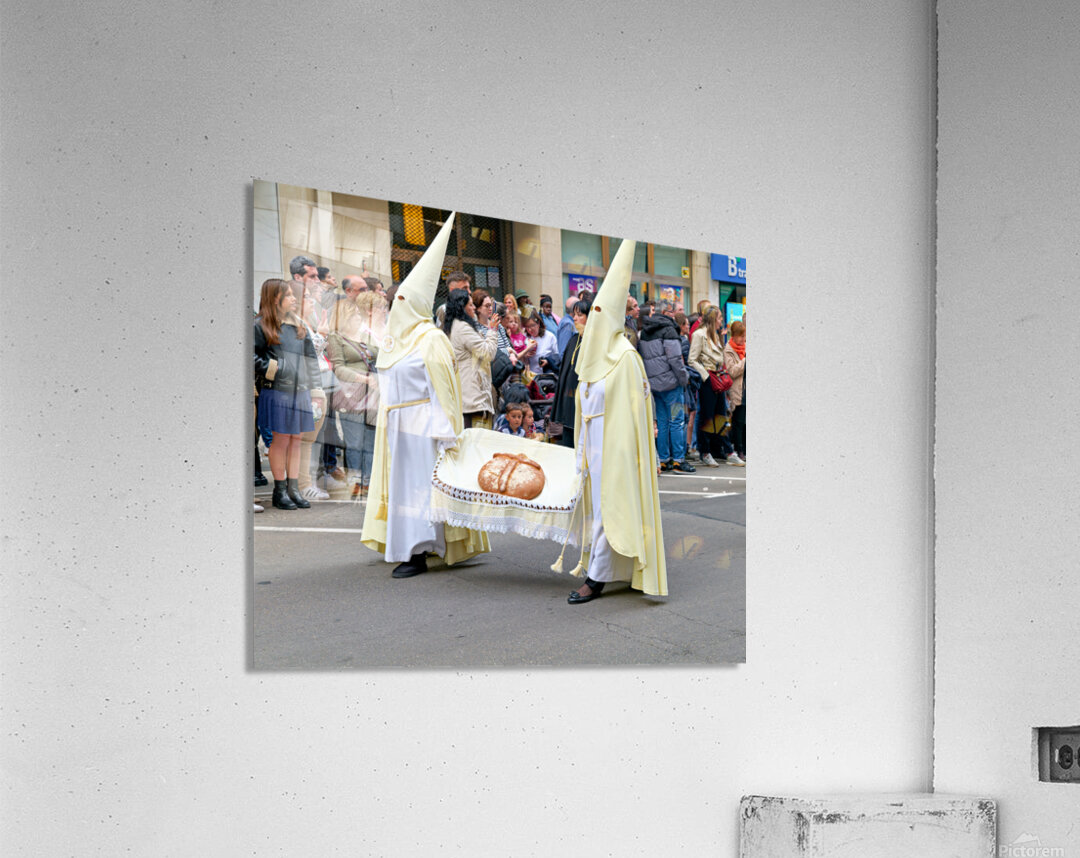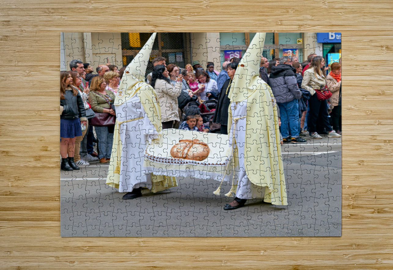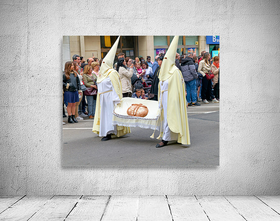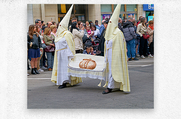 People participate in processions of Easter Holy Week in Zaragoza. Two figures carry a large bread-like object in the street.