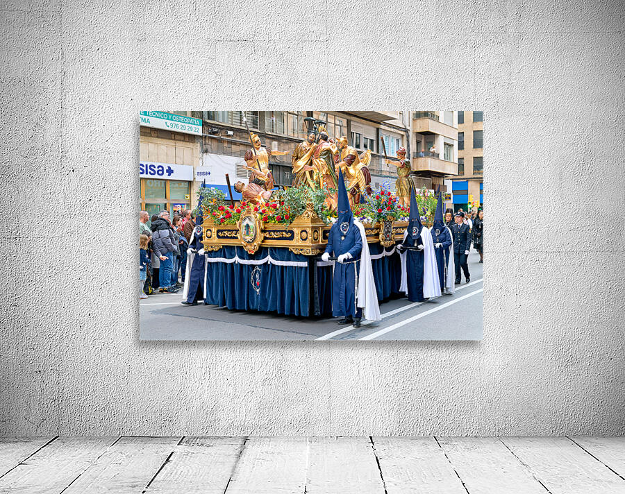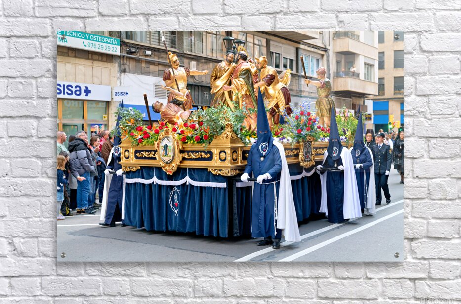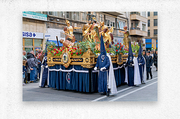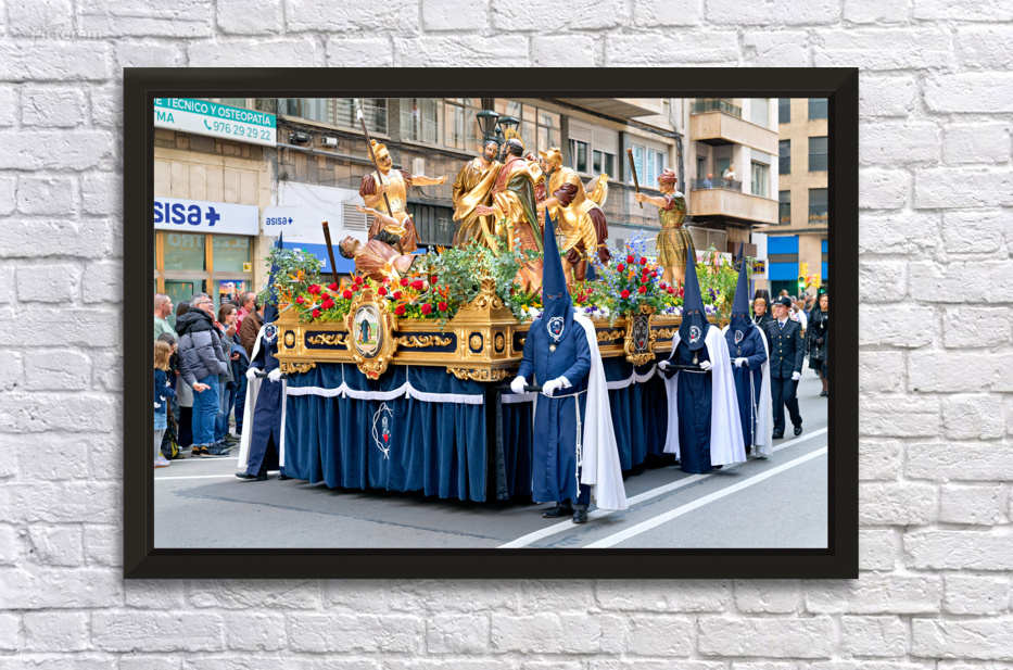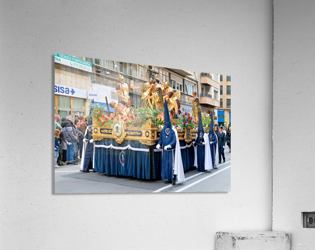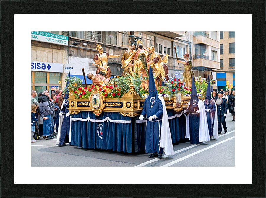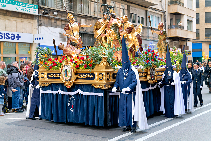Crowds gather to watch a procession during Easter Holy Week in Zaragoza. People are dressed in traditional costumes and carry a float.