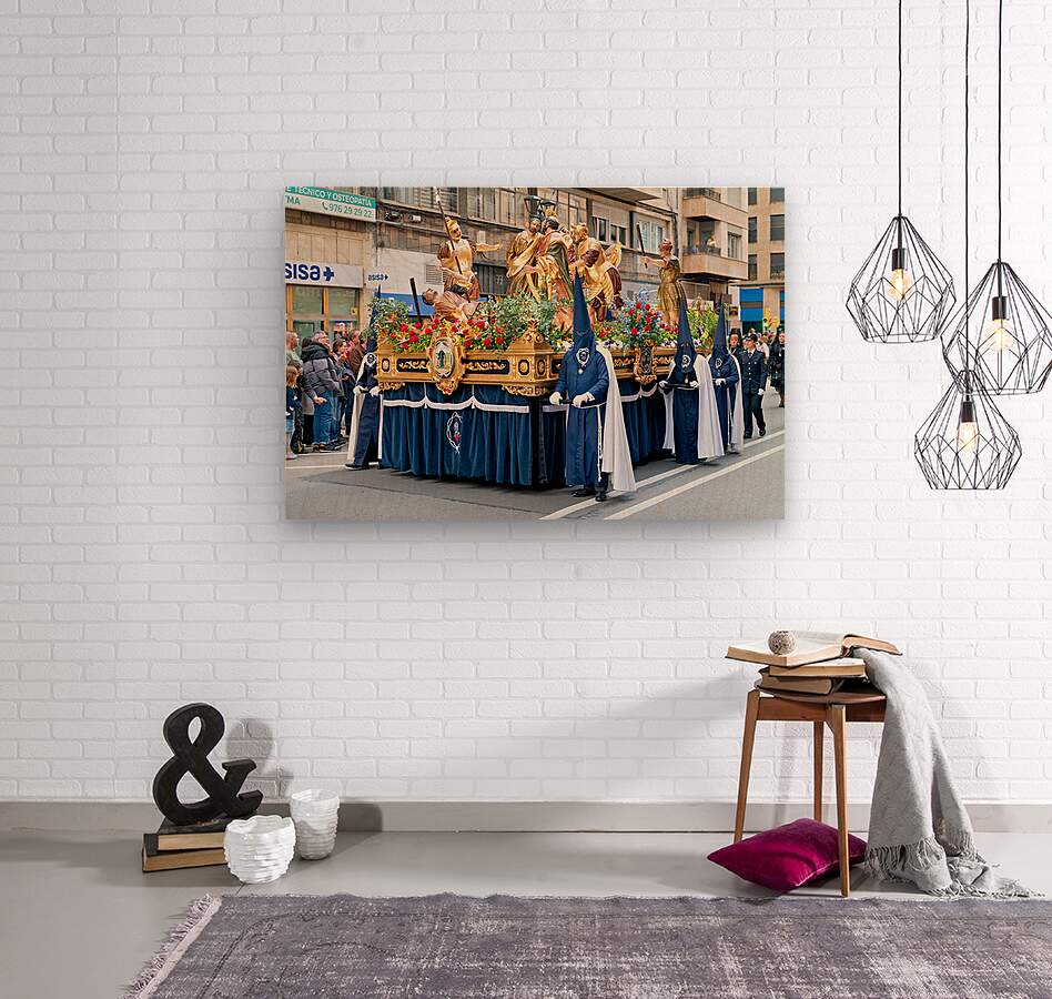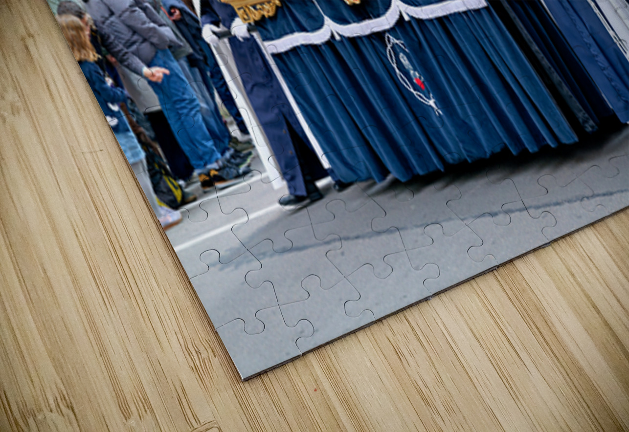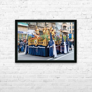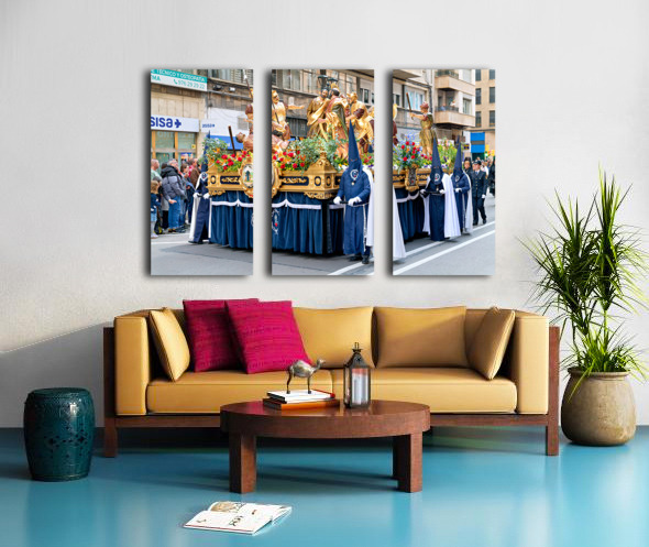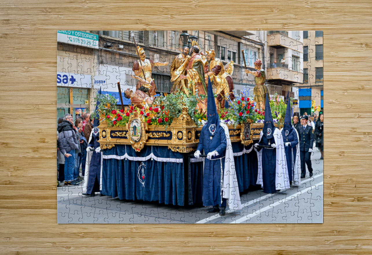 Crowds gather to watch a procession during Easter Holy Week in Zaragoza. People are dressed in traditional costumes and carry a float.