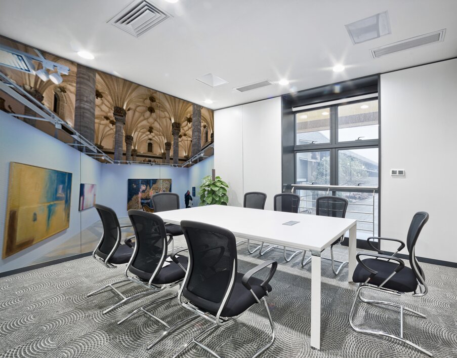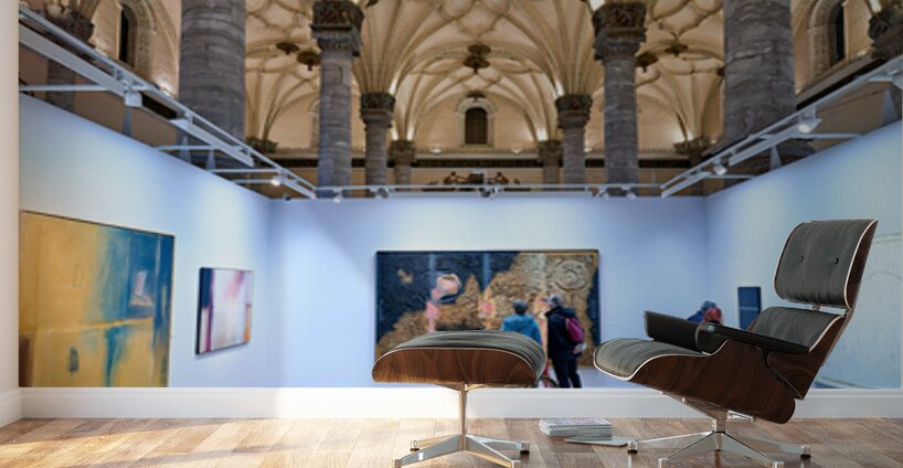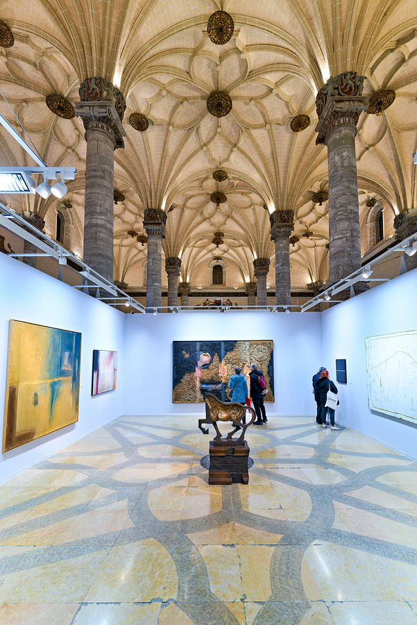 Visitors explore an art exhibition at Sala de Exposiciones La Lonja in Zaragoza Spain surrounded by impressive architecture and artwork.